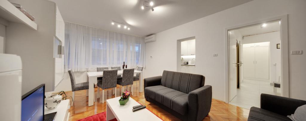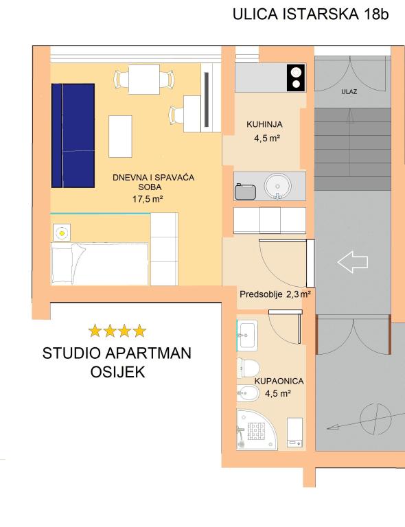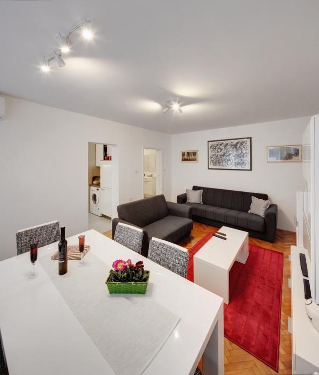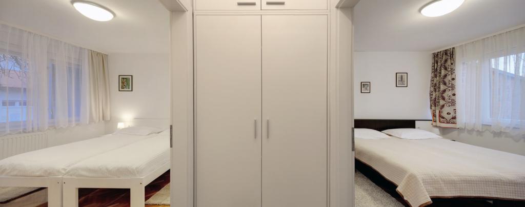 Apartament Tvrđa i Studio apartament Osijek znajdują się na wysokim parterze budynku przy ulicy Istarskiej, w pobliżu Eurodomu, gdzie przewidziano miejsca parkingowe. Apartamenty znajdują się blisko głównych ulic i dróg łączących Osijek z okolicznymi miejscowościami oraz autostradą A5. W bezpośrednim sąsiedztwie apartamentu znajduje się stadion piłkarski i hala sportowa „Ogród Miejski”, „Baseny Miejskie”, restauracje oraz historyczne centrum Osijeku – Barokowa Twierdza. Apartament Tvrđa to trzypokojowe mieszkanie o powierzchni 68 m². Do Państwa dyspozycji oddajemy dwie dwuosobowe sypialnie oraz salon z rozkładaną sofą, dwie łazienki, kuchnię oraz taras. Apartament typu studio w Osijek ma powierzchnię 30 m². Składa się z przedpokoju, salonu, sypialni, kuchni i łazienki. Sypialnia, w której znajduje się łóżko, oddzielona jest od salonu przesuwnymi drzwiami pokrytymi lustrami. W salonie znajduje się rozkładana sofa. Jedno miejsce postojowe przewidziano w garażu podziemnym Eurodomu, w bezpośrednim sąsiedztwie budynku.