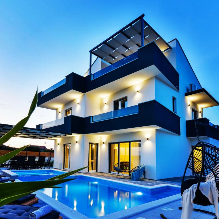 Dom posiada cztery apartamenty w pełni wyposażone i nowoczesne w cichym lesie, w otoczeniu części Pakostane. Położony między jeziorem Vrana i morza w sąsiedztwie czterech parków narodowych. Obiekt położony jest 10 minut spacerem do plaży, miasta i wszystkich głównych atrakcji. Miejsce parkingowe dla każdego gościa. Dodatkowe zajęcia do apartamentów znajduje się basen.