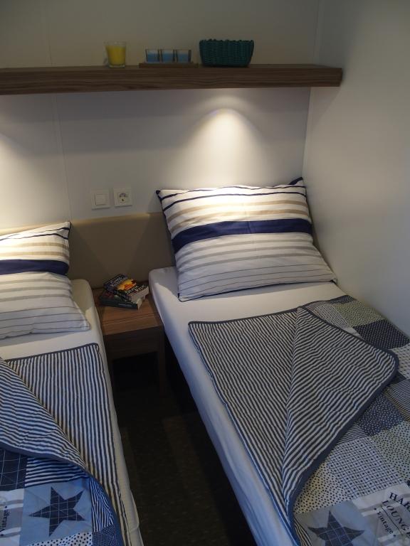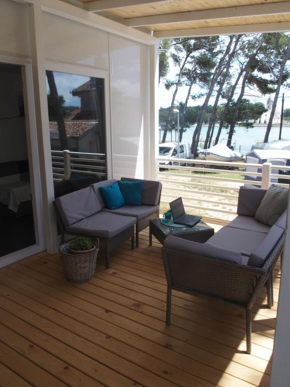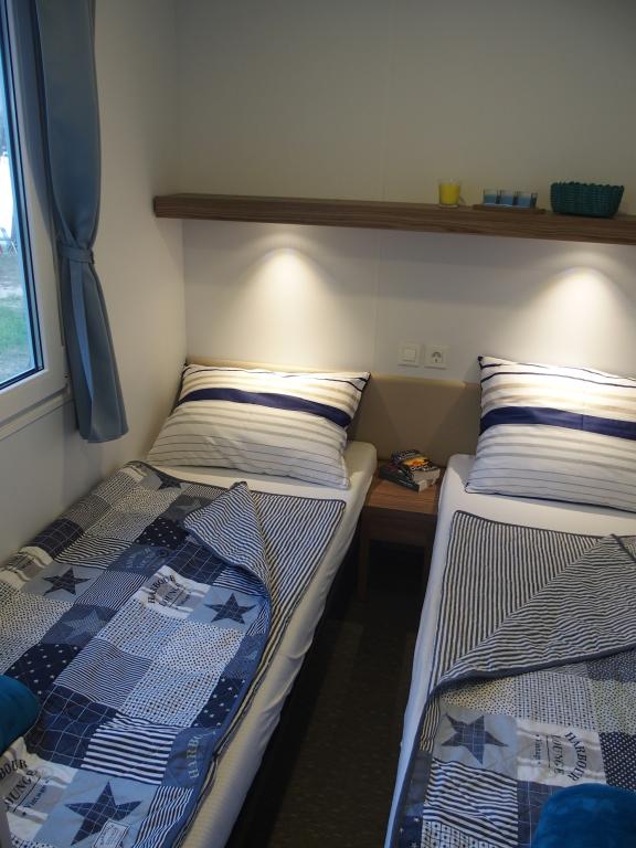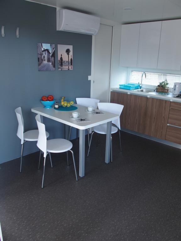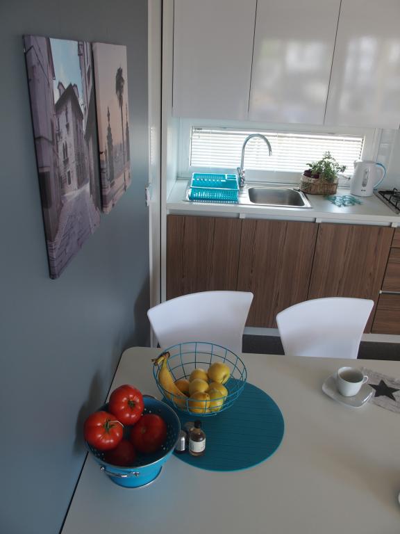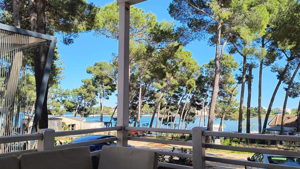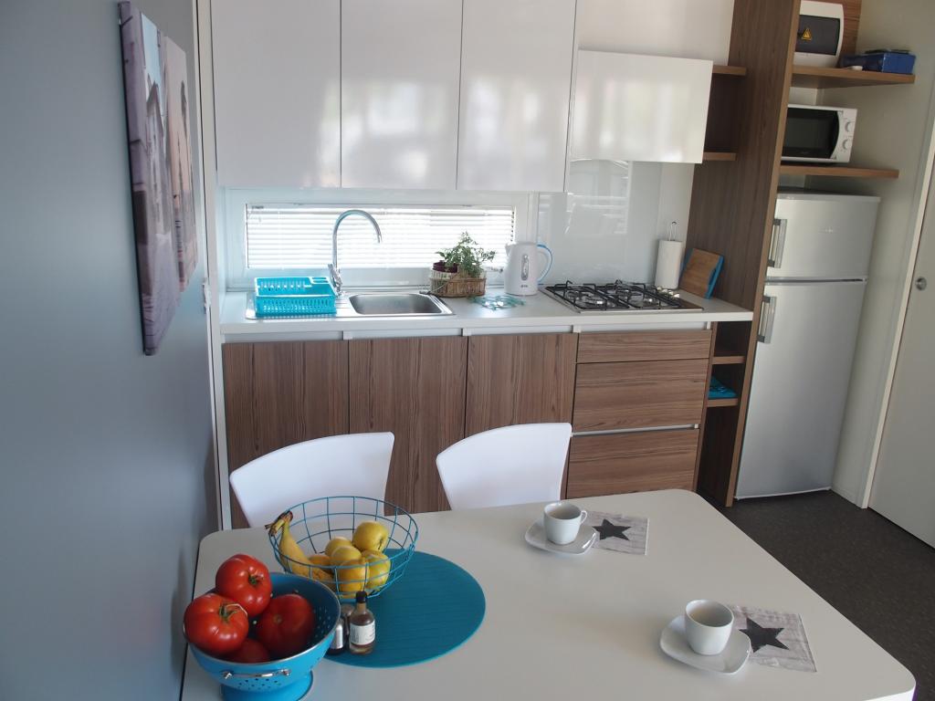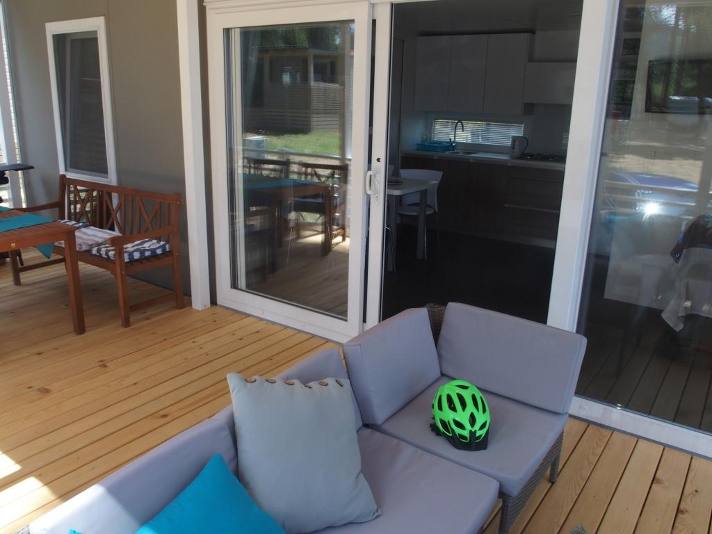 Luksusowy dom mobilny położony jest w naturalnym, głębokim cieniu lasu sosnowego, zaledwie 20 metrów od piaszczystej plaży. Z dużym, otwartym tarasem z widokiem na morze, 2 sypialniami, w pełni wyposażoną kuchnią i łazienką oraz dużym salonem z dodatkową rozkładaną sofą, ten dom wakacyjny to idealny wybór na relaksujący, rodzinny wypoczynek. Zapewnia komfortowe zakwaterowanie dla 4 osób, a maksymalna pojemność to 4 + 1. Taras posiada część wypoczynkową, stół jadalny dla maksymalnie 6 osób oraz grill gazowy. Zaledwie 20 metrów dalej znajduje się piękna i bezpieczna plaża z piaszczystym dnem, która rozciąga się od jednego krańca zatoki do drugiego. Wzdłuż wybrzeża, w promieniu kilku kilometrów w obie strony, znajdują się inne plaże o różnym charakterze, które można zwiedzać. Na terenie kempingu Goście mają dostęp do basenu z umeblowanym miejscem do opalania z bezpłatnymi leżakami, a także do kawiarni-baru. Taras domu jest tak położony, że roztacza się z niego otwarty widok na całą zatokę i basen.