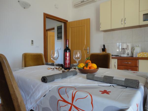 Apartamenty znajdują się w nowym rodzinnym domu w centrum Petrcan. Pod domem znajduje się pięknie zagospodarowany plac zabaw dla dzieci, promenada i port z łódkami. W pobliżu znajdują się plaże, restauracje, sklepy. Apartamenty posiadają zadaszone balkony z widokiem na morze i wyspy. Są wygodne, z dwiema sypialniami, salonem z kuchnią, łazienką. Apartamenty są klimatyzowane, z internetem wi fi, mikrofalówką, czajnikiem, ekspresem do kawy oraz sztućcami i napojami. Wyposażone są w pościel i ręczniki.