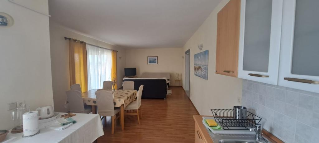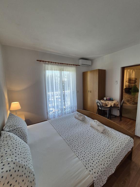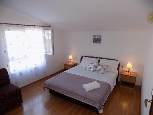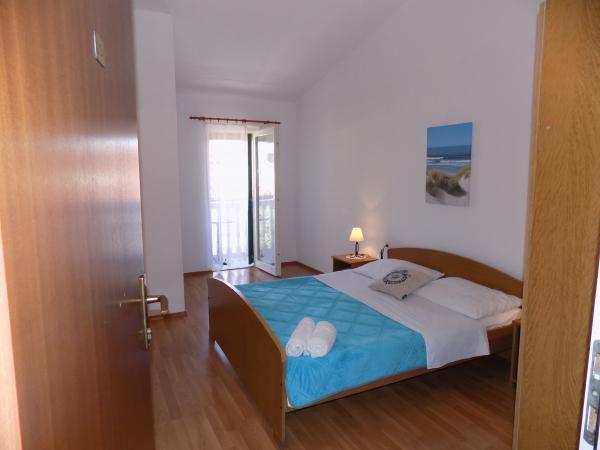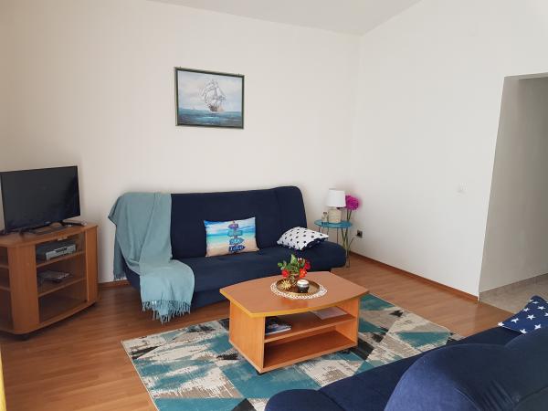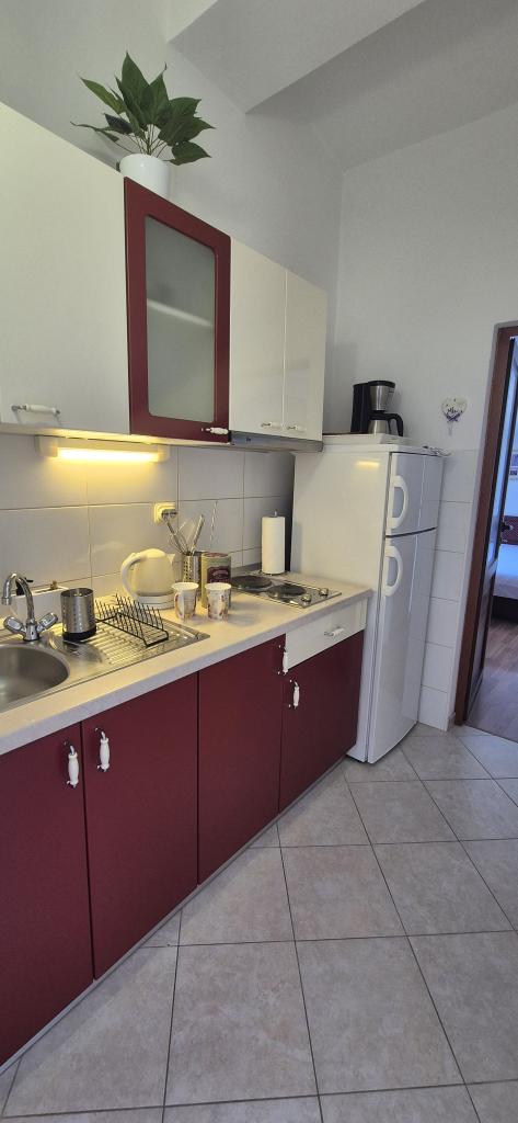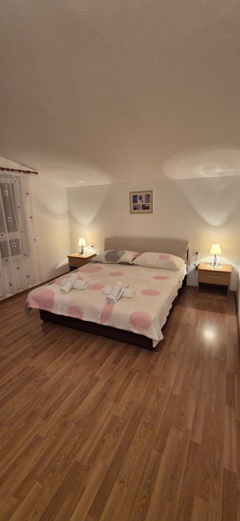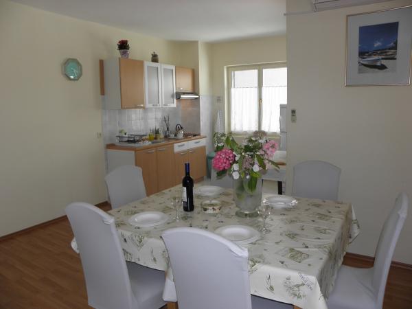 Apartamenty Kristina znajdują się zaledwie 150-200 m od centrum i plaży, są dość przestronne, z licznymi udogodnieniami, aby goście czuli się komfortowo i jak w domu. Wszystkie trzy apartamenty są w pełni wyposażone w kuchnię, salon (wszystkie sofy są rozkładanymi łóżkami), klimatyzację, telewizor (kanały satelitarne). Dwa apartamenty o powierzchni 90 m² (na 1. i 2. piętrze) są jasne, przestronne, z tarasem o powierzchni 20 m² z widokiem na morze i mają dwie przestronne sypialnie, a każdy pokój ma łazienkę i wentylator. Apartament o powierzchni 40 m² ma balkon o powierzchni 5 m². Jest jedna sypialnia o powierzchni 15 m² z łazienką, klimatyzacją i lodówką (na korytarzu). Bezpłatne Wi-Fi jest dostępne w całym obiekcie, a na korytarzu przy wejściu znajduje się mała biblioteka (półka z broszurami, książkami w kilku językach obcych, czasopismami). Przed domem znajduje się duży parking. Rezerwacje, warunki i więcej, patrz Notatki. Kalendarz rezerwacji jest aktualizowany. Czekamy na Państwa przybycie!