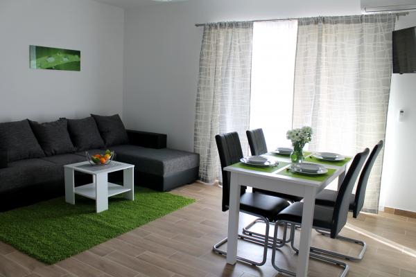 Apartamenty w pełni odpowiadają wszystkim powyższym. Czysty i wygodny dla rodziny z 4 członkami takimi jak nasza. Gospodarze są pomocni i gotowi do pomocy we wszystkim, czego potrzebujesz. Chociaż wzdłuż autostrady doskonała izolacja akustyczna świetnie, więc masz spokój. Dwie plaże, do których masz 5 minut na piechotę. Nadaje się na spokojne, ale również aktywne wakacje. Zdecydowanie polecamy.