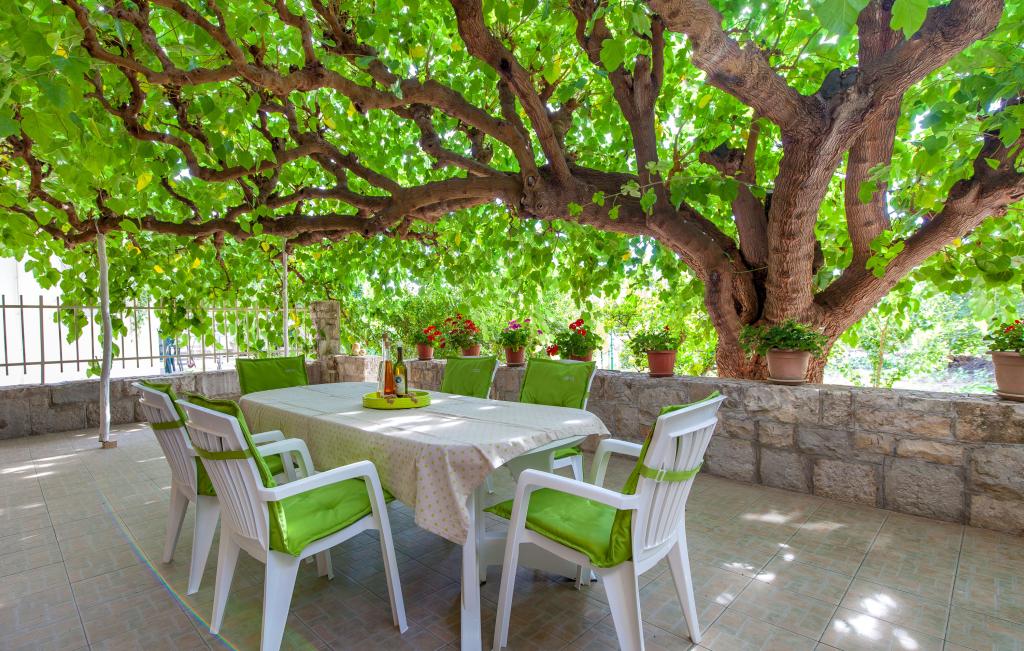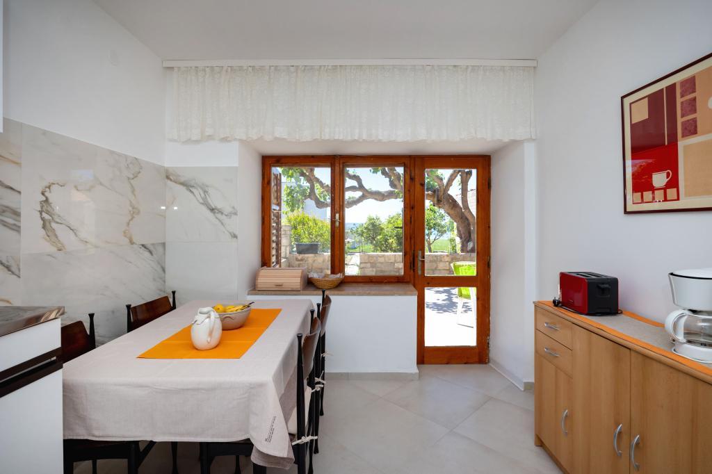 Wynajmujemy w pełni i nowocześnie wyposażony kamienny dom o powierzchni 182 m2. Dom znajduje się 15 m od drogi (strona północna) i 60 m od morza (strona południowa). Przed wejściem do domu znajduje się miejsce parkingowe dla 2 samochodów. Na parterze znajduje się kuchnia, duży salon, łazienka, spiżarnia i kolejne pomieszczenie gospodarcze, w którym znajduje się pralka, deska do prasowania, parasole... Z kuchni i salonu można wyjść na duży taras o powierzchni 70 m2 z naturalnym cieniem dzikiej morwy. Przed tarasem znajduje się mały, piękny ogród z prysznicem na świeżym powietrzu i grillem. Z ogrodu na plażę prowadzi ścieżka o szerokości 1,5 m. Nie ma potrzeby przechodzenia przez ulicę, więc dzieci mogą iść na plażę bez opieki osoby dorosłej. Na piętrze znajdują się 3 sypialnie: 2 z łóżkiem małżeńskim, które wychodzą na duży balkon ze stołami i krzesłami. Pokoje mają widok na morze. Po stronie północnej znajduje się kolejna sypialnia z dwoma pojedynczymi łóżkami. Na górze znajduje się kolejna duża łazienka.