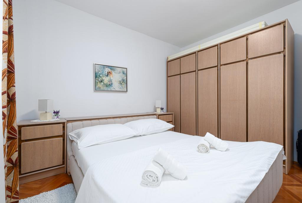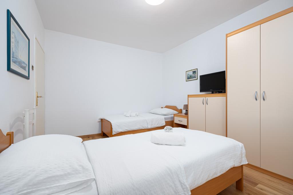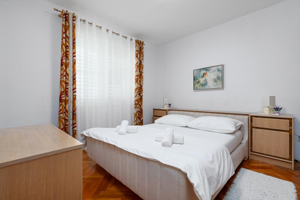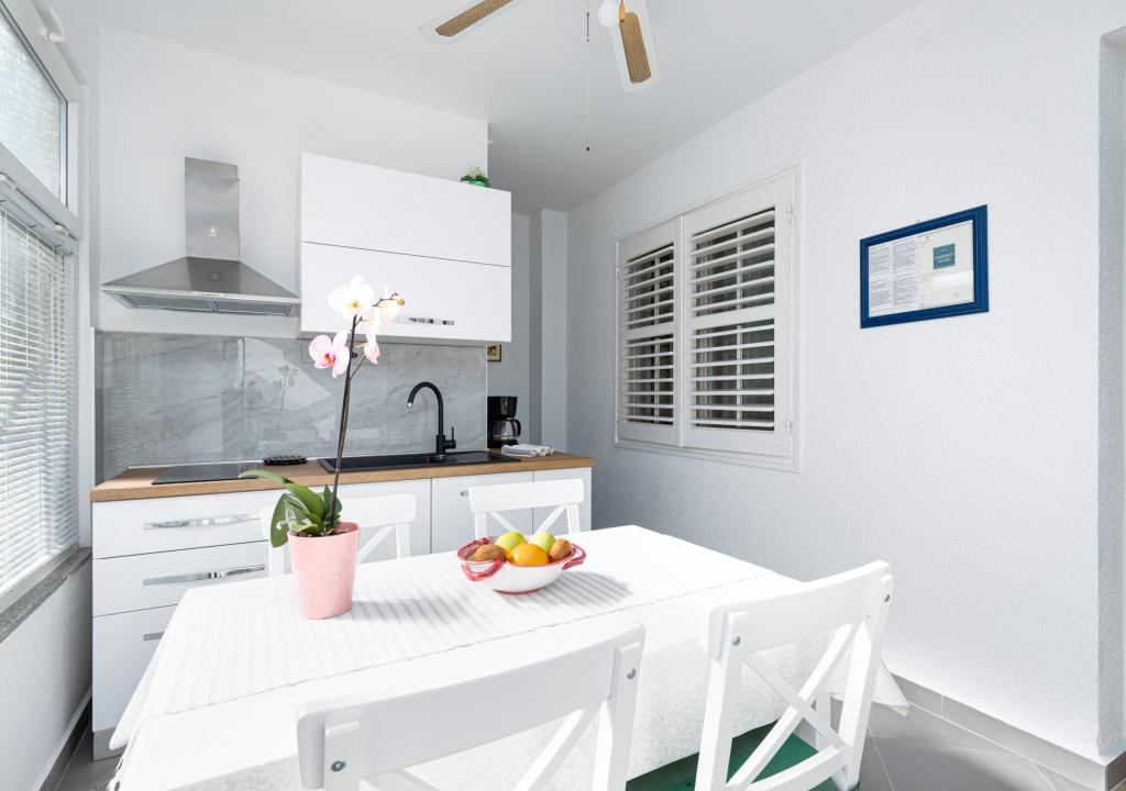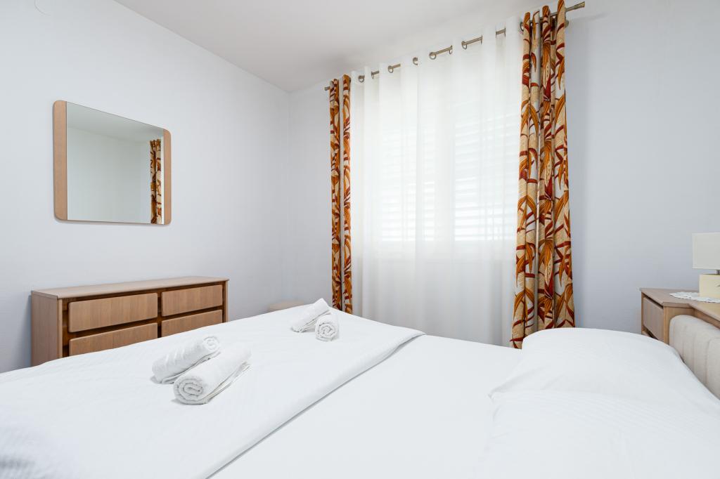 Apartament jest gustownie urządzony i pomieści maksymalnie cztery osoby. Składa się z pokoju dziennego, w pełni wyposażonej kuchni, stołu jadalnego, jednej sypialni dwuosobowej z podwójnym łóżkiem, jednej sypialni z dwoma pojedynczymi łóżkami i telewizorem z płaskim ekranem oraz łazienki. Przed apartamentem znajduje się kącik wypoczynkowy, który zapewnia bardzo przyjemną atmosferę. W cenę wynajmu apartamentu wliczone jest korzystanie z: pościeli, ręczników, Wi-Fi i klimatyzacji.