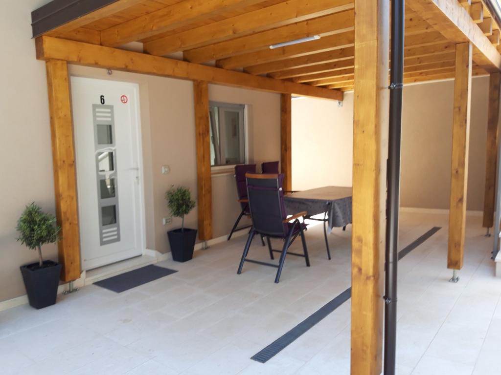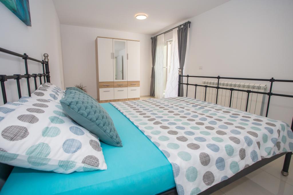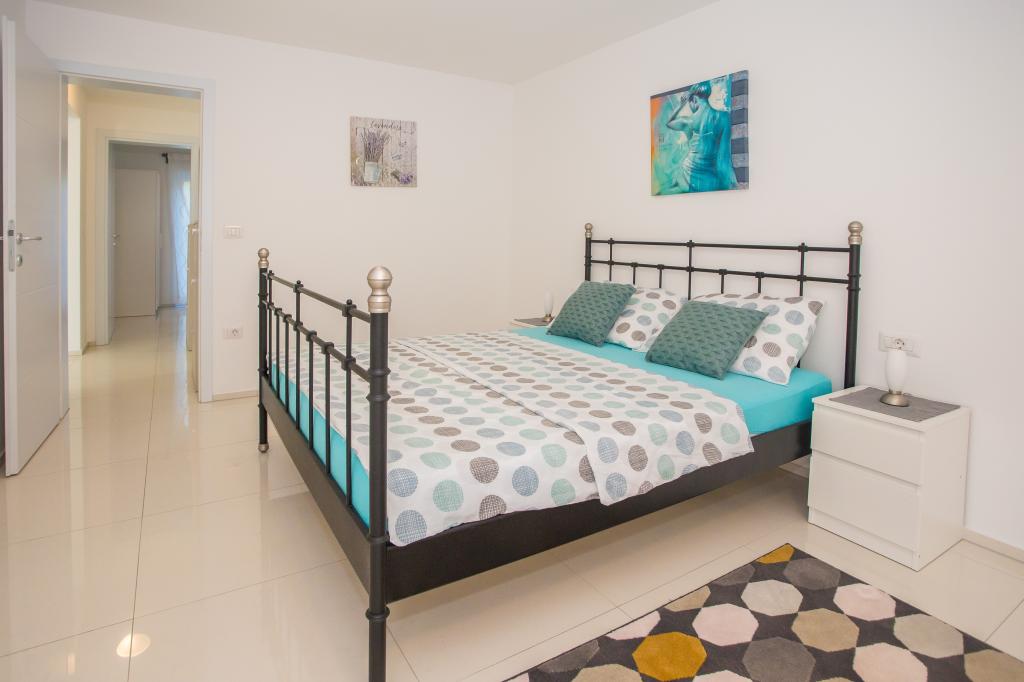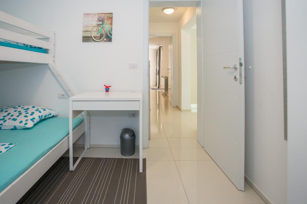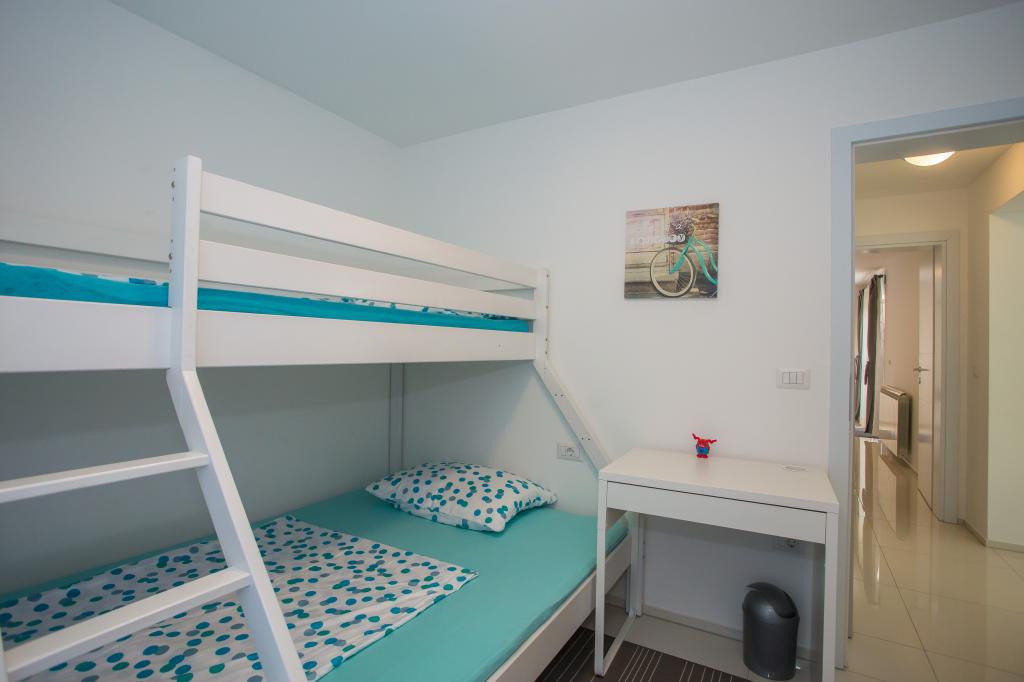 Mieszkanie (75 m2) posiada dwie sypialnie. Jeden z dużym łóżkiem (160X200), a drugi z łóżkiem piętrowym. Dolne łóżko ma wymiary 140X200, a górne 90X200. W łazience znajduje się prysznic i pralka. W salonie znajduje się klimatyzacja i telewizja satelitarna. Kuchnia wyposażona jest w: lodówkę z suszarką do włosów, zmywarkę, mikrofalówkę, piekarnik, czajnik, toster, ekspres do kawy i inne przybory kuchenne. Ze wszystkich wymienionych pokoi jest wyjście do ogrodu, który jest ogrodzony i przystosowany dla rodzin z dziećmi. Pościel i ręczniki zmieniane są raz w tygodniu (i na życzenie).