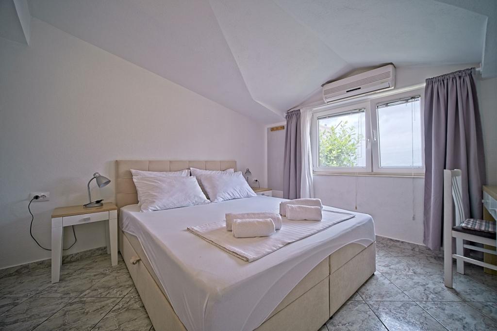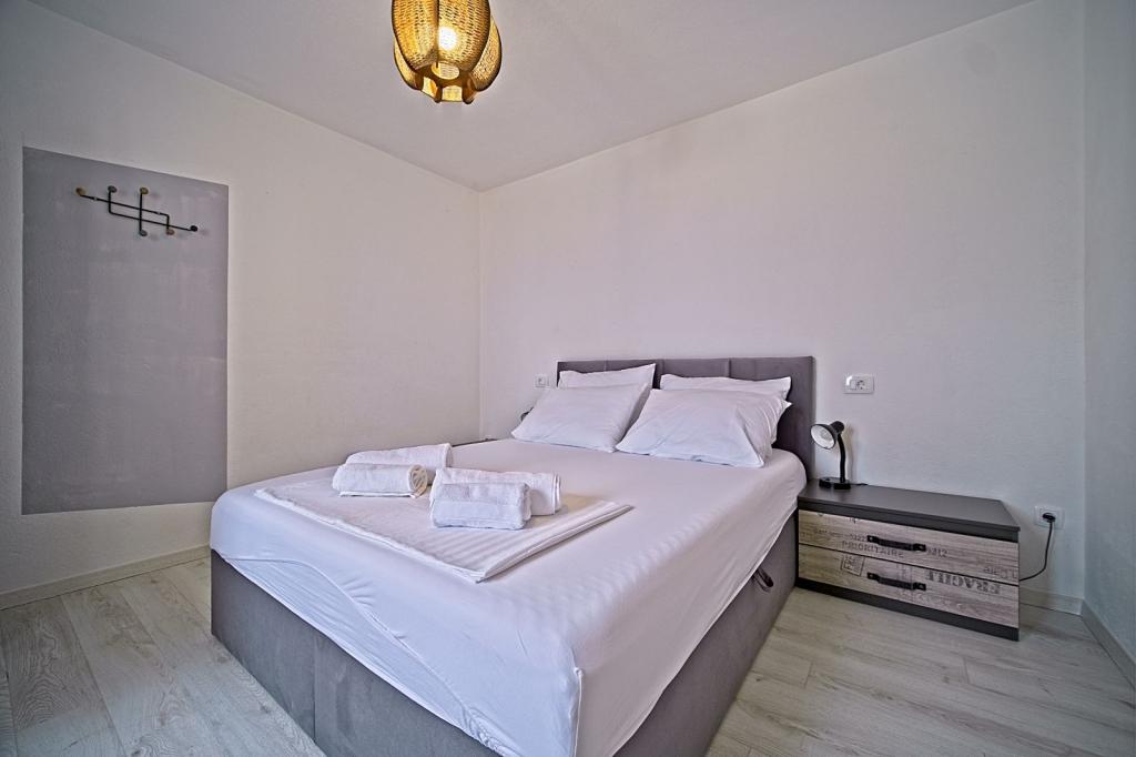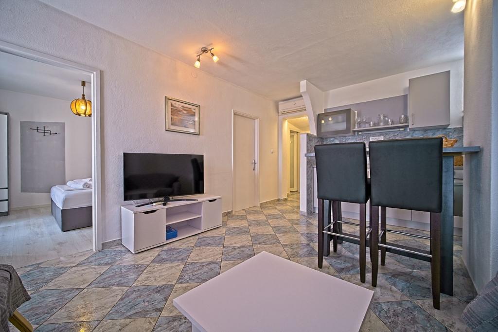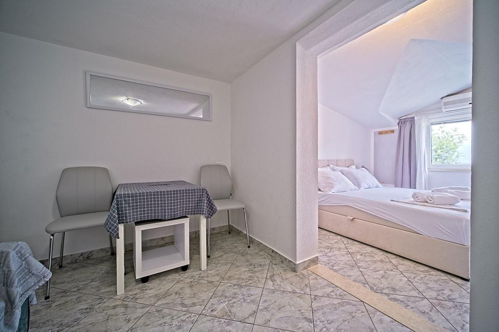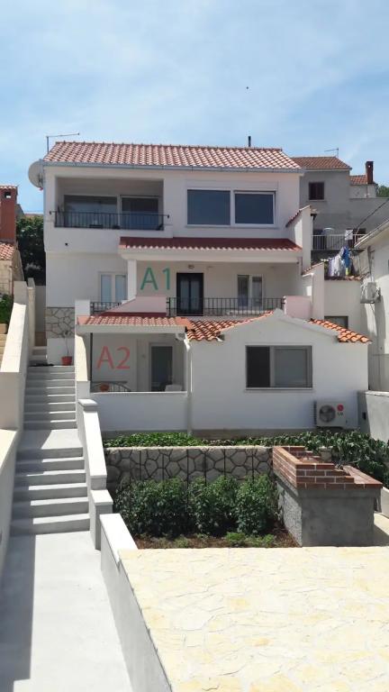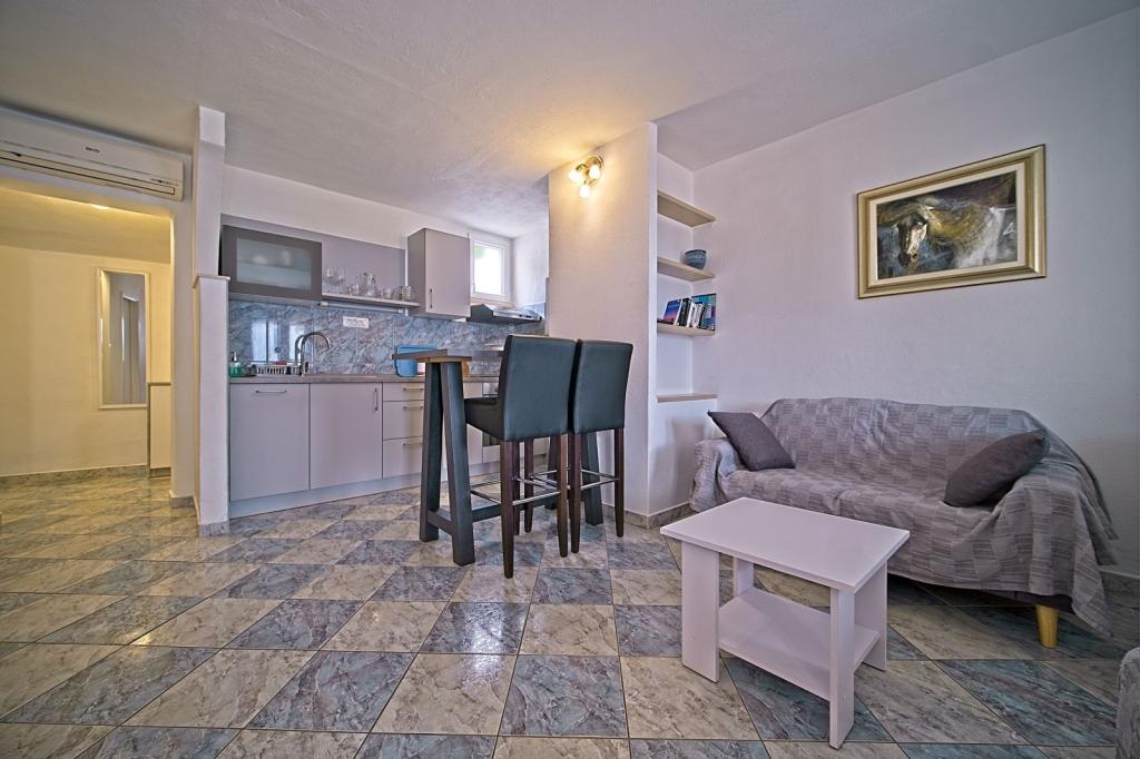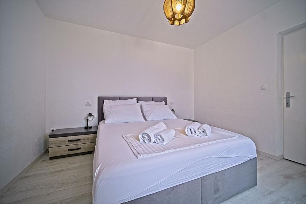 Apartamenty położone są w pierwszym rzędzie nad morzem i oferują idealne połączenie komfortu i nowoczesnego stylu. Znajdują się w odnowionym i w pełni wyposażonym domu rodzinnym, gdzie można cieszyć się bliskością morza i zachwycającym widokiem. Oferujemy dwa wyjątkowe typy zakwaterowania: przestronny apartament 2+1, idealny na rodzinne wakacje, oraz urokliwy apartament dla dwóch osób. Każdy apartament wyposażony jest w bezpłatną klimatyzację, telewizję satelitarną i internet Wi-Fi.