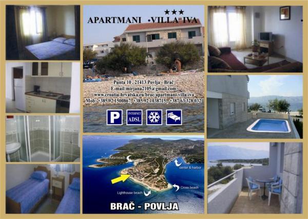 W pełni wyposażone i nowoczesne apartamenty w spokojnej i piękne miejsce Povlja na wyspie, znajduje się tuż przy morzu. W domu znajduje się basen, taras słoneczny, kominek oraz duży stół i dużo miejsc siedzących znajduje zelenila.Objekat wzdłuż plaży używanego przez okolicznych domów, bez tłumów, i miasta plaży jest 5 minut i 10 minut do centrum miasta. Apartamenty są wyposażone w telewizję satelitarną, dostęp do Internetu oraz klimatyzację.