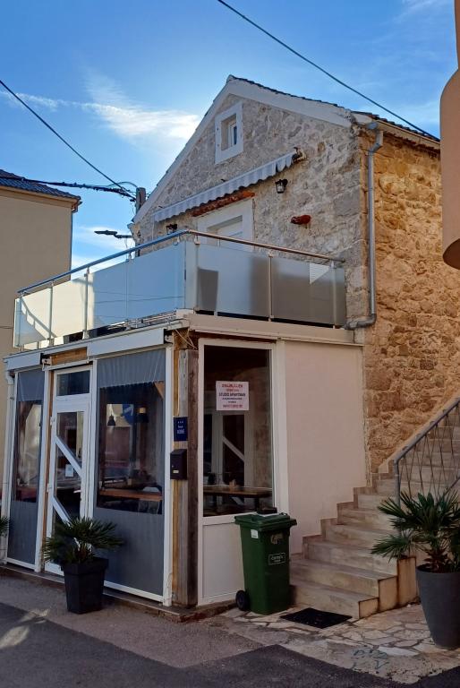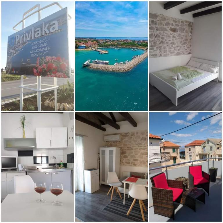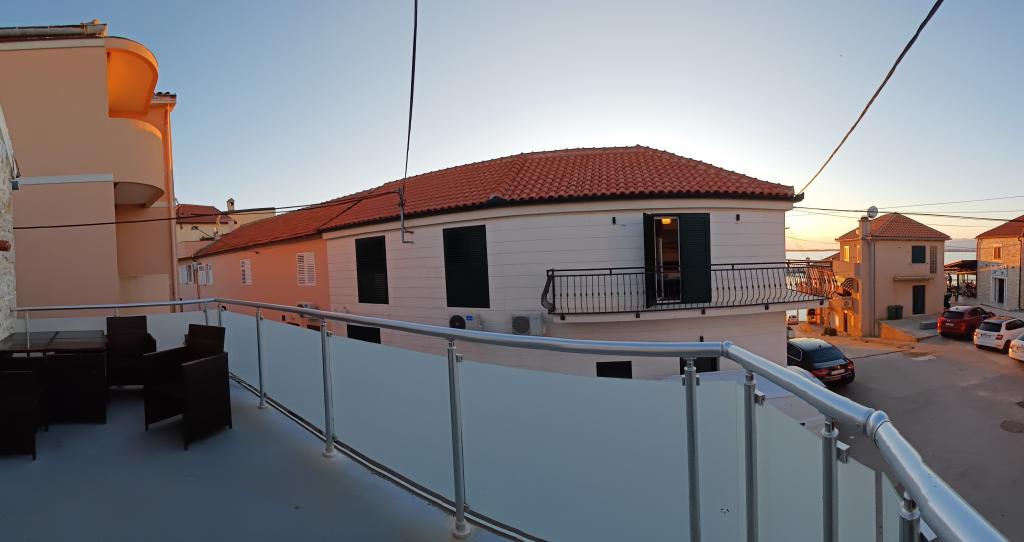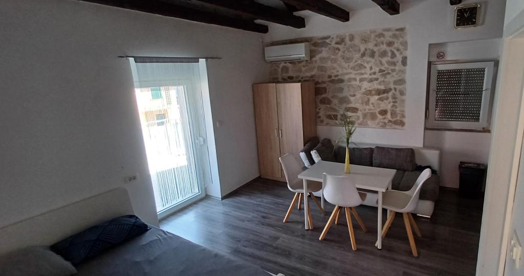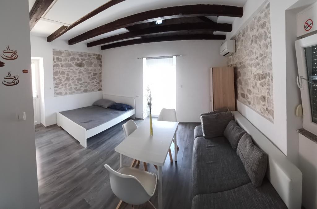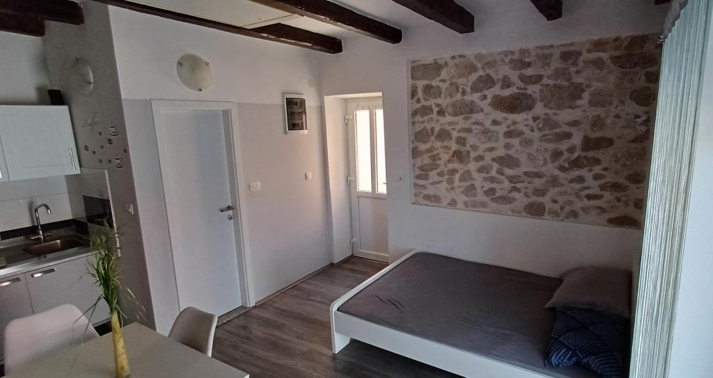 Kawalerka (460x440) w starym centrum Privlaki na pierwszym piętrze z oddzielną łazienką (110x210) z prysznicem, toaletą i umywalką. Przestronny taras (500x260) od strony północno-zachodniej z widokiem na morze, markizą zapewniającą cień, miejscem do siedzenia i stołem. Podwójne łóżko (140x200) z dostawką (kanana 80x200) dla trzeciej osoby. Kuchnia z płytą elektryczną bez piekarnika, lodówką z zamrażarką, naczyniami i naczyniami, telewizorem z anteną satelitarną, szafą z wieszakami i półkami, stołem i krzesłami. Lokalizacja jest cicha, w otoczeniu domów i apartamentów rodzinnych, w bezpośrednim sąsiedztwie portu oraz piaszczystych, kamienistych i betonowych plaż i kąpielisk. Również bardzo blisko obiekty rozrywkowe, place zabaw oraz liczne restauracje z bogatą ofertą we wszystkich przedziałach cenowych. Jeden z nich (bar Skoby Street Food) znajduje się tuż pod apartamentem, na parterze tego samego budynku, a zamówienia można składać bezpośrednio z balkonu! :) Pościel i ręczniki nie są dostępne (BYO)!