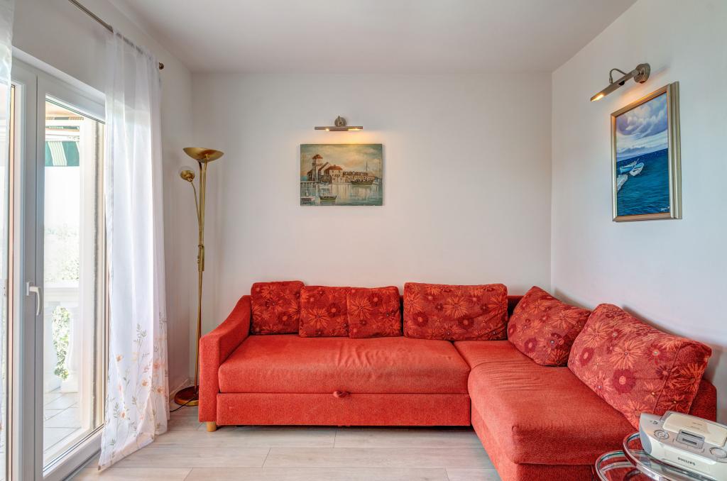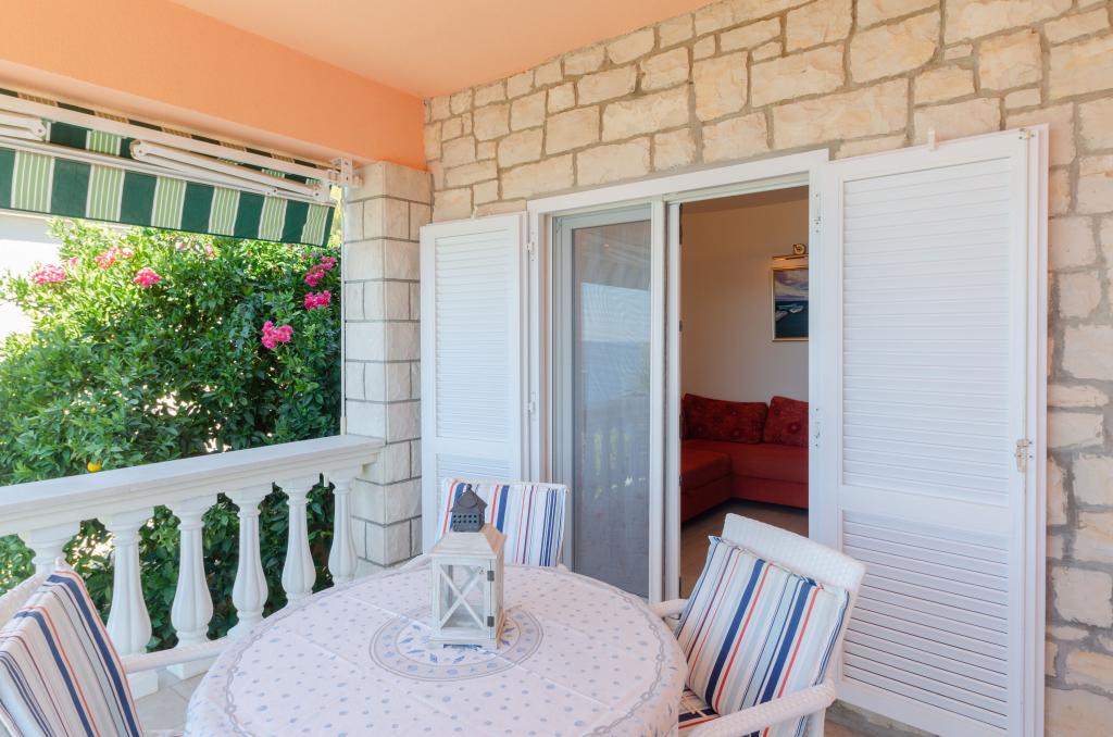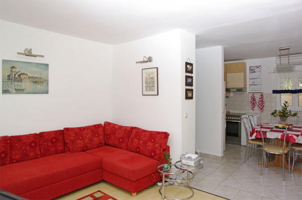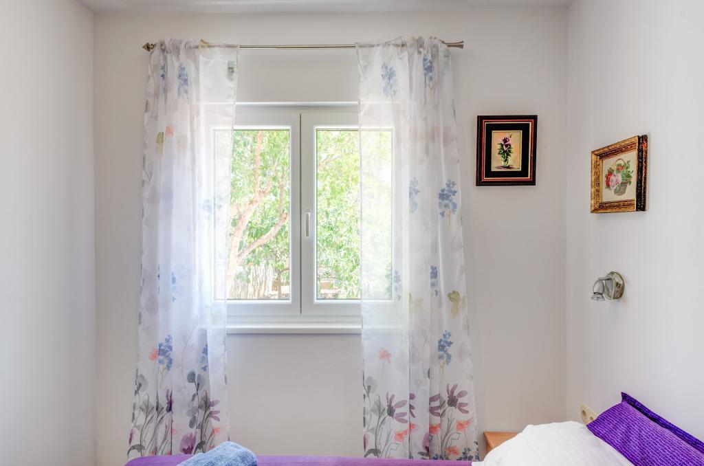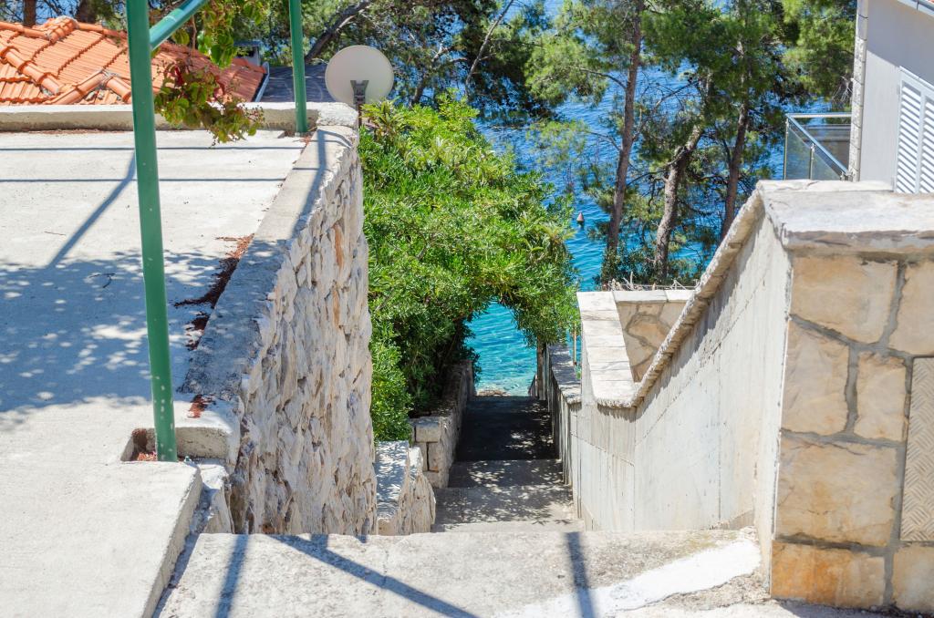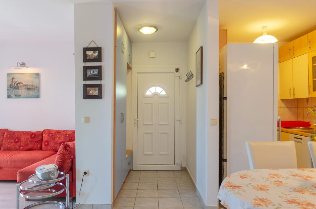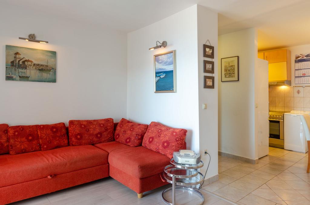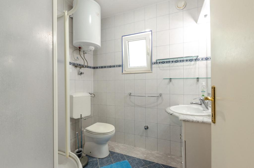 Mieszkanie w rodzinnym domu, orientacja północ-południe, 30m od morza, położone na pierwszym piętrze, składa się z dwóch sypialni, salonu/jadalni z kuchnią, małej garderoby, łazienki/toalety oraz tarasu z widokiem na morze od 12m2 W pobliżu apartamentu znajduje się sklep spożywczy, a do centrum Prizby można dojść pieszo ok. 400m do wszystkich innych obiektów.