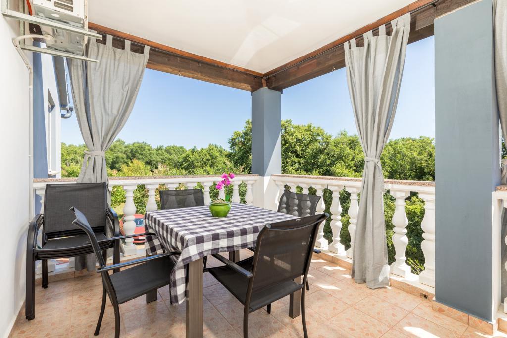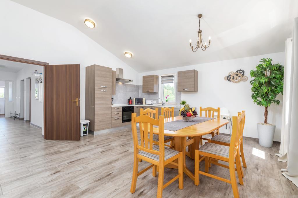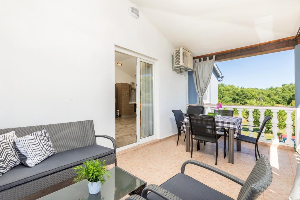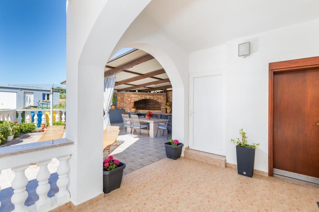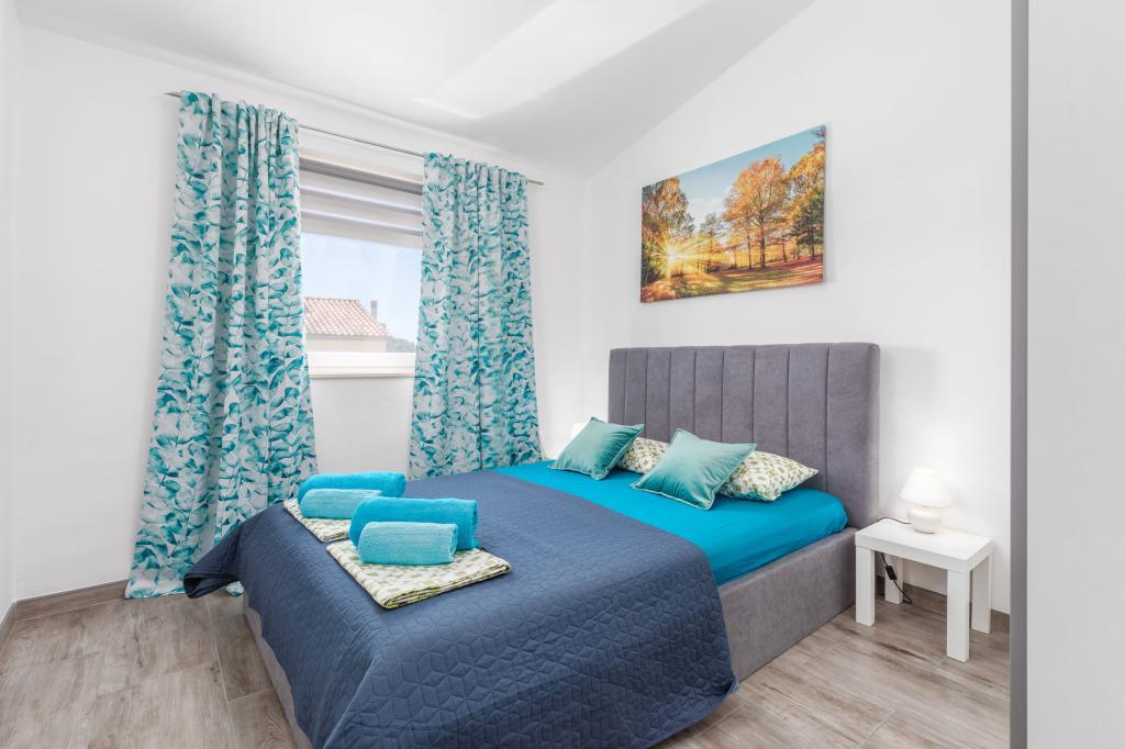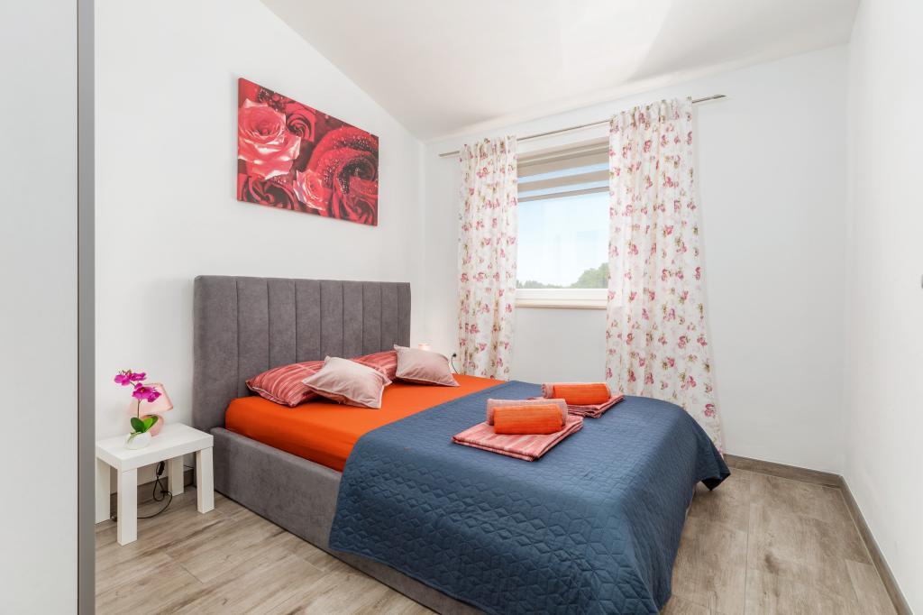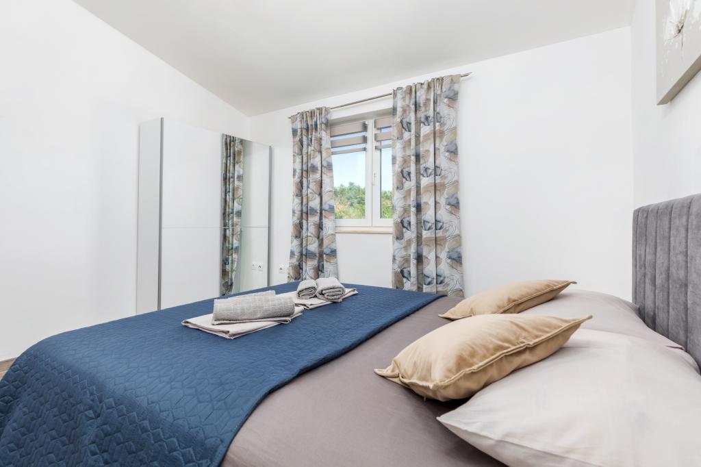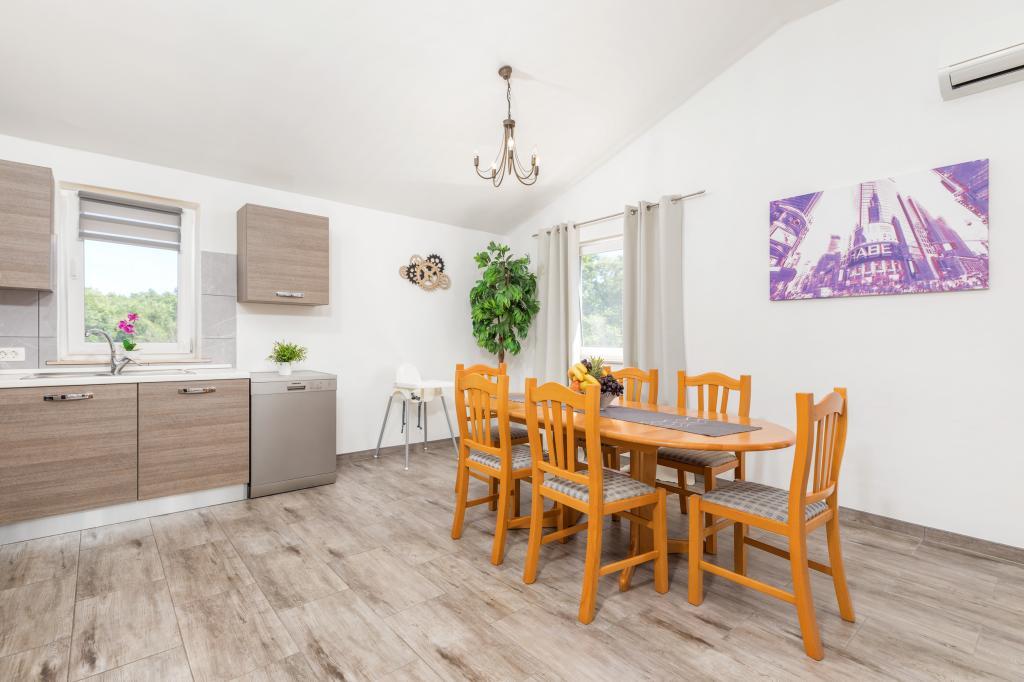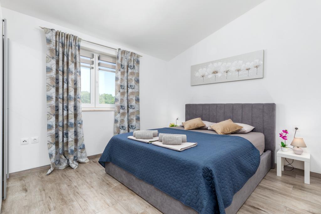Zrelaksujcie się w nowo wybudowanym obiekcie tylko 8 km od centrum Puli i 10 km od pierwszej plaży. Spokojna okolica na skraju lasu, budząca się przy śpiewie ptaków. Mieszkanie na pierwszym piętrze posiada 3 sypialnie, łazienkę wyposażoną w pralkę i prysznic, kuchnię z pralką, jadalnię oraz salon. Zadaszony taras ze stołem jadalnym i meblami wypoczynkowymi, a na parterze grill z towarzyszącym wyposażeniem i dużym ogrodem. Wi-Fi, łóżeczko dla dziecka, karmnik, bezpłatny parking. Blisko plac zabaw i supermarket.