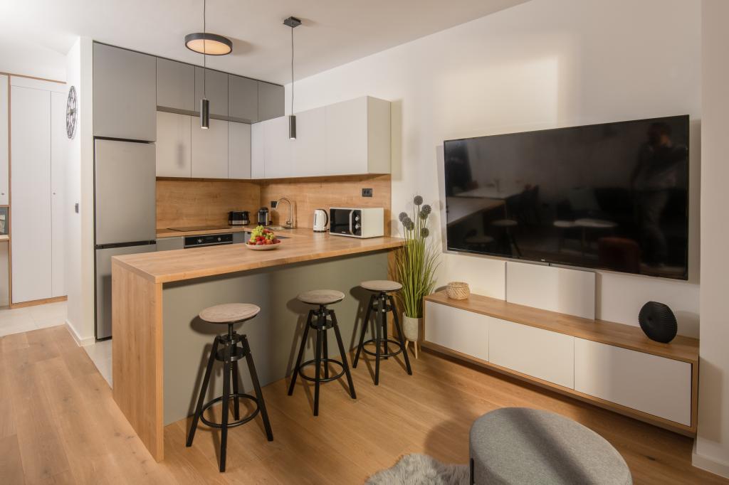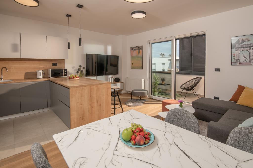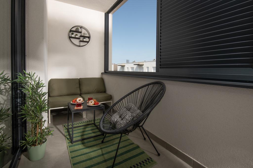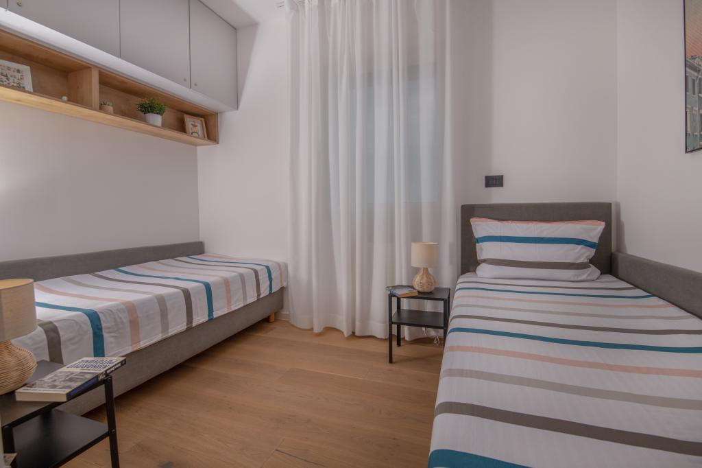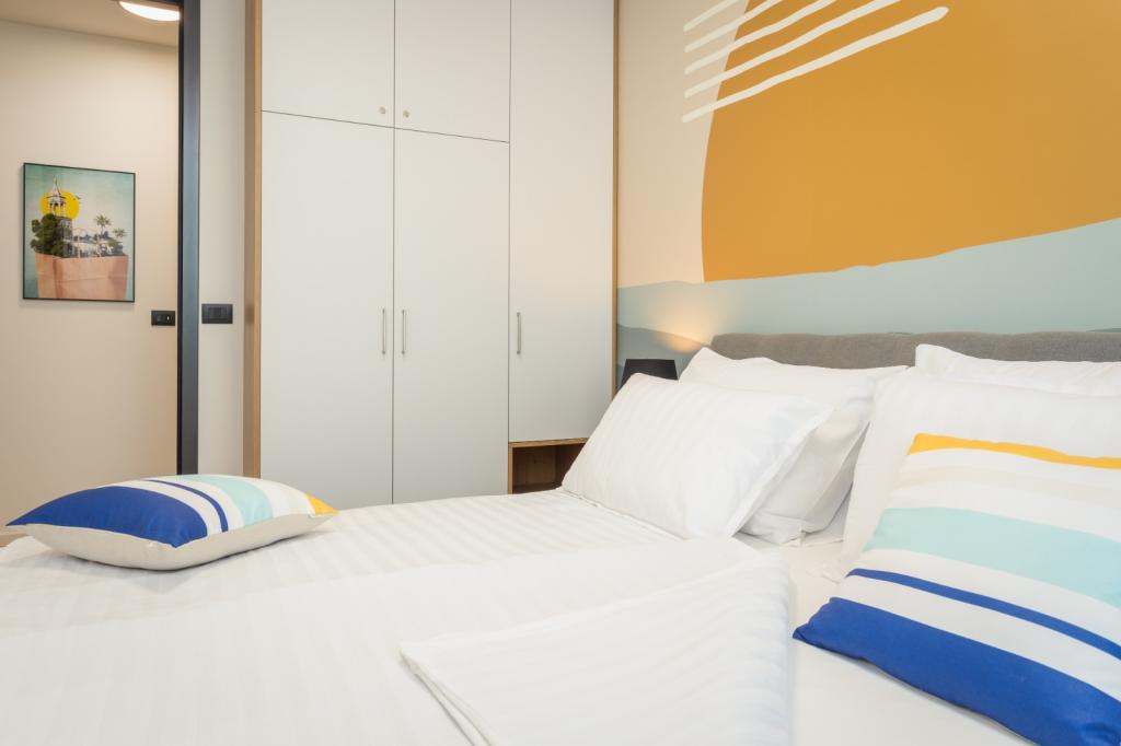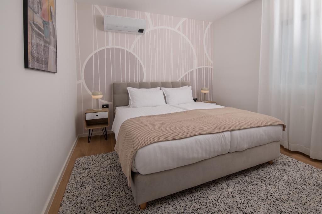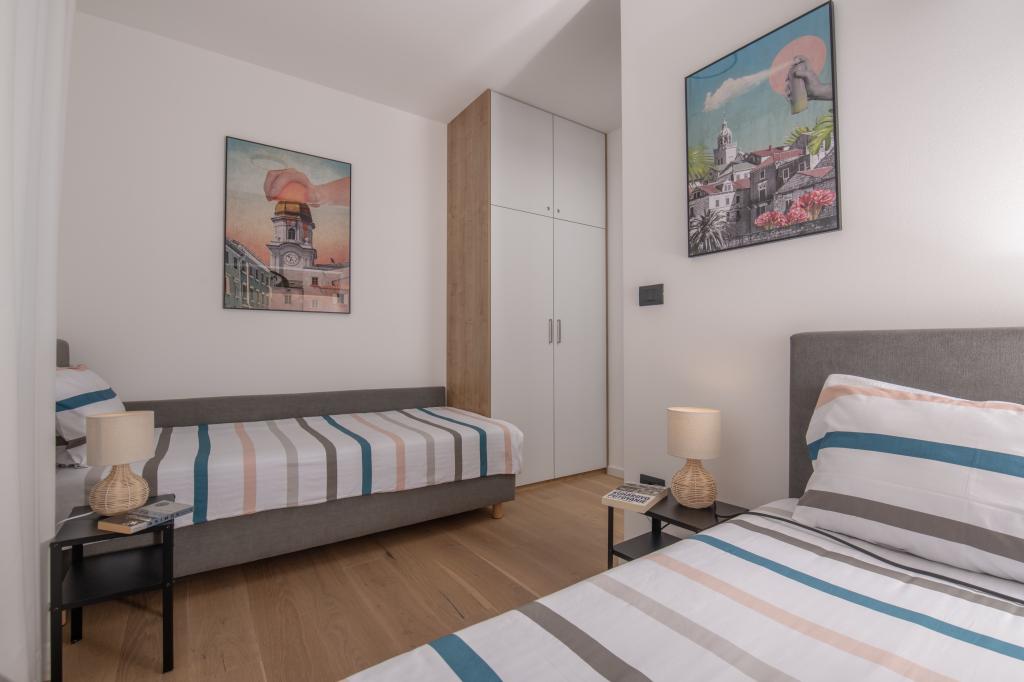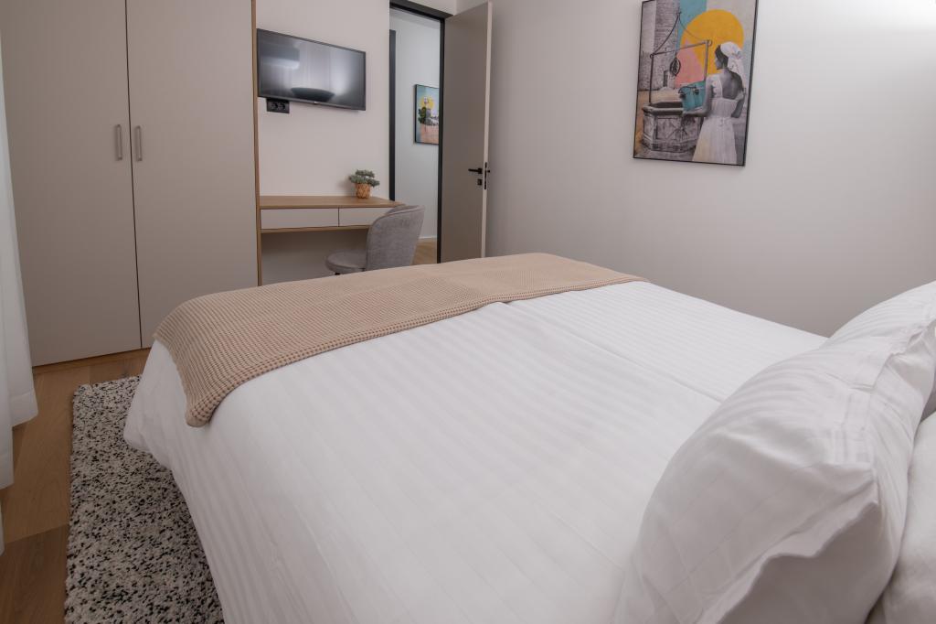 W pełni i nowocześnie wyposażony apartament w nowym budynku z prywatnym parkingiem. Mieszkanie składa się z trzech sypialni, salonu z dużym telewizorem, w pełni wyposażonej kuchni, dwóch łazienek oraz tarasu. W dwóch sypialniach znajdują się bardzo wygodne podwójne łóżka o wymiarach 180x200 cm, natomiast w trzeciej sypialni znajdują się dwa pojedyncze łóżka o wymiarach 90x200 cm. Meble wykonywane są na wymiar, a całe wyposażenie jest nowe. Wyróżniamy: pralkę, zmywarkę, piekarnik, dużą lodówkę z zamrażarką, ekspres do kawy Nespresso, kuchenkę mikrofalową. W kuchni znajdują się wszystkie sprzęty kuchenne, a także wszelkiego rodzaju naczynia, szklanki i sztućce. Mieszkanie zlokalizowane jest w spokojnej części miasta, blisko plaż i centrum miasta. Lotnisko jest bardzo blisko, zaledwie dziesięć minut jazdy samochodem, podobnie jak dworzec autobusowy.