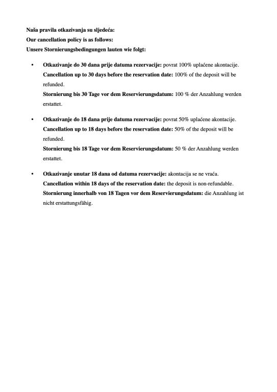 Opłata jest wliczone w cenę. Dokument potwierdzający rezerwację przy rezerwacjiRezygnacja na 30 dni przed dniem rezerwacji - zwracane jest 100% wpłaconej zaliczki. Anulowanie 18 dni przed rezerwacją - zwracane jest 50% wpłaconej zaliczki. Po tym terminie zaliczka nie podlega zwrotowi.
