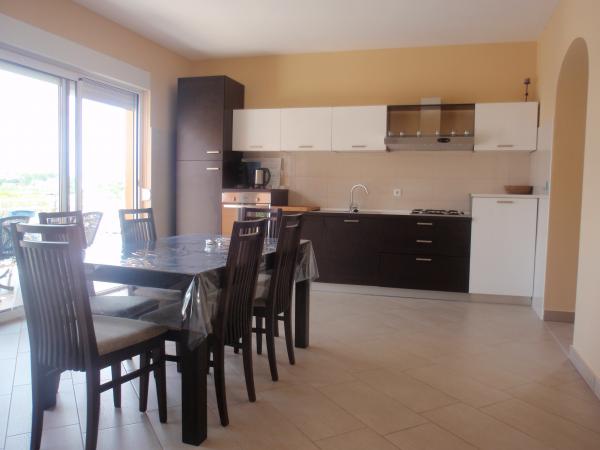 Nowo wybudowany apartament z trzema sypialniami, każda z łazienką i wyjściem na taras, kuchnia, jadalnia, salon z dużym tarasem z widokiem na morze. Położony nad morzem, 10 metrów od plaży, w pobliżu sklepów, restauracji.