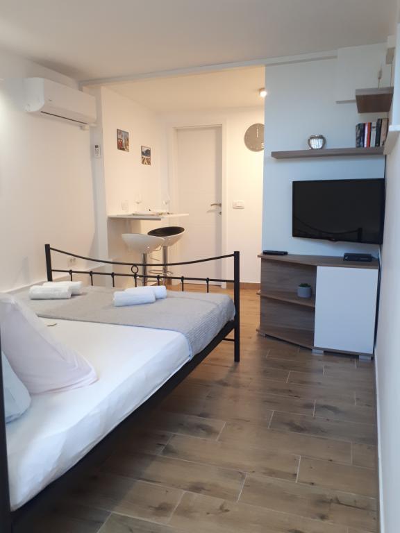 Dom wczasowy Wilson (6+2 osoby) znajduje się 5 m od morza i 30 m od centrum, gdzie znajdują się wszystkie niezbędne udogodnienia dla przyjemnego pobytu. Parter: - Garaż z 2 miejscami postojowymi - Pokój nr. 1 (apartament typu studio) z podwójnym łóżkiem, w pełni wyposażoną kuchnią i łazienką. (TV sat., Wifi, klimatyzacja, pralka) I piętro: - Pokój nr. 2 (pokój dwuosobowy) - Pokój nr. 3 (pokój dziecięcy, łóżko piętrowe), w pełni wyposażona kuchnia z jadalnią i łazienka. (TV SAT, Wifi, klimatyzacja, pralka) - Salon z rozkładaną sofą (160 × 210 cm) - Duży taras z widokiem na morze Łóżeczko dziecięce dostępne na życzenie.