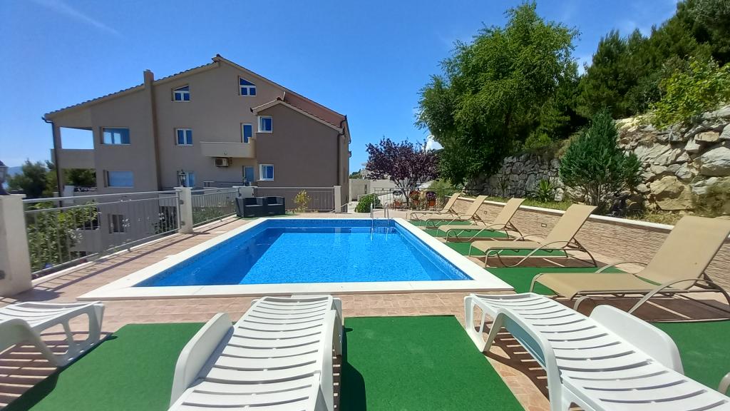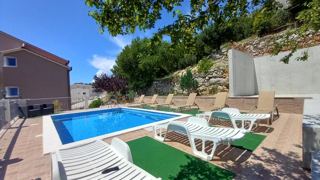 Nowoczesne apartamenty z basenem w małej turystycznej miejscowości Čelina, 5 km od stolicy Omiš. Oferujemy dwa dwupokojowe luksusowe apartamenty. Opis apartamentu: Apartament A 5+1 znajduje się na pierwszym piętrze i składa się z dwóch sypialni, w pełni wyposażonej kuchni, pokoju dziennego, łazienki i toalety. Posiada duży taras od strony południowej z przepięknym widokiem na morze i dwa mniejsze balkony od strony wschodniej i zachodniej. A 4 +1 znajduje się na drugim piętrze i składa się z dwóch sypialni, w pełni wyposażonej kuchni, salonu, łazienki. Posiada duży taras od strony południowej z pięknym widokiem na morze i mały balkon od strony zachodniej. W obu sypialniach znajduje się jedno podwójne łóżko. Do dyspozycji gości bezpłatne WiFi, bezpłatny parking (garaż), basen zewnętrzny z widokiem na morze i wyspę Brač, bezpłatne korzystanie z klimatyzacji (6 godzin dziennie, we wszystkich apartamentach, każda dodatkowa godzina jest płatna) 2 euro (dobra izolacja w domu).