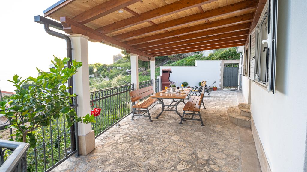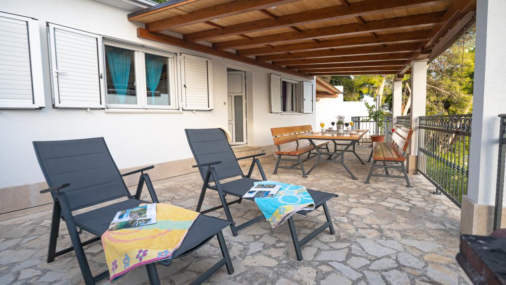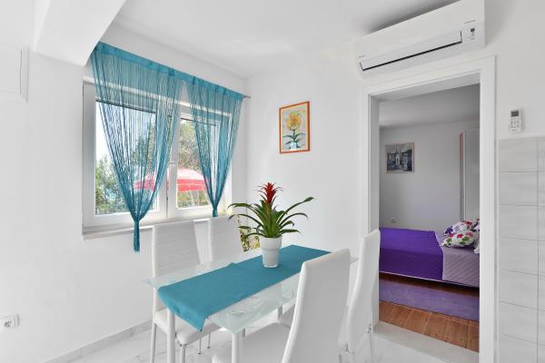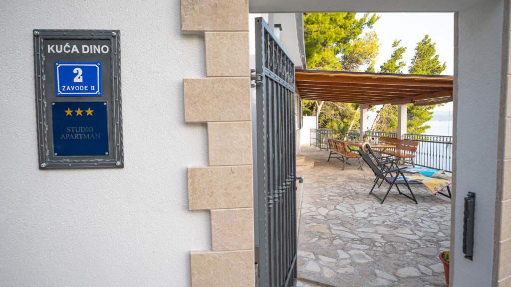 Dom Dino to niezależny obiekt, całkowicie odnowiony w kwietniu 2015 roku z możliwością 4 osób, z możliwością jednej dostawki. Składa się z 2 sypialni, salonu z aneksem kuchennym oraz łazienki o powierzchni 42 metrów kwadratowych. Kuchnia jest w pełni wyposażona w naczynia, sztućce, lodówka, kuchenka, zmywarka, mikrofalówka, ekspres do kawy i czajnik. W kuchni jest stół z czterema krzesłami. Każdy pokój składa się z podwójnym łóżkiem 160 x 200 cm, szafki i półki z lampkami. Dom posiada klimatyzację i telewizor LCD w salonie i bezprzewodowym dostępem do Internetu. Pościel, ręczniki, klimatyzacja, wi-fi i podatki są wliczone. Z tarasu roztacza się piękny, otwarty widok na morze i wyspy Brac. Plaża żwirowa pod domem znajduje się kilka kroków około 100 metrów, aw pobliżu znajduje się kilka pięknych plaż.
