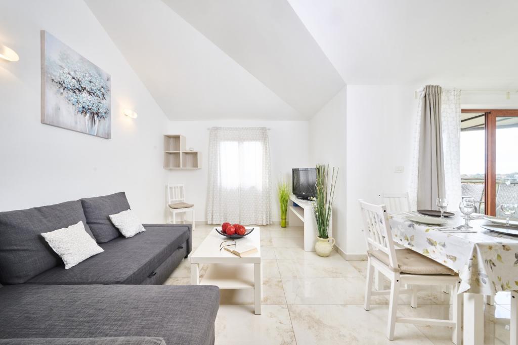 Dwupokojowy, nowoczesny i wyposażony apartament. Jeden pokój z łóżkiem małżeńskim, drugi z łóżkiem piętrowym. Otwarty i przestronny salon, kuchnia ze zmywarką, łazienka z pralką. Taras, klimatyzacja, wifi, telewizja satelitarna. Basen, prywatny parking, zadaszony grill. Odległość od restauracji 300 metrów, odległość od plaży 1300 metrów