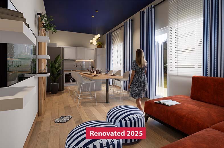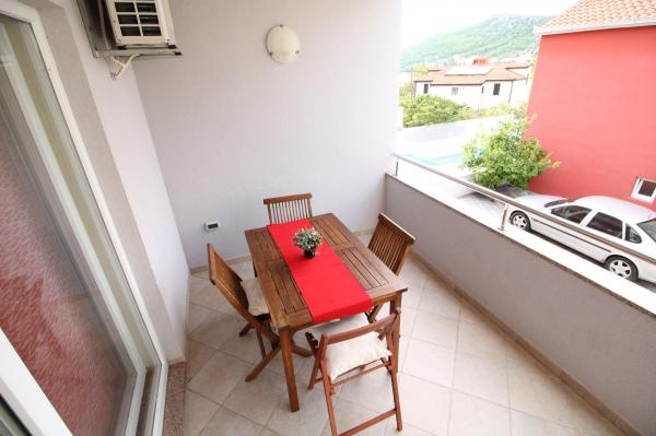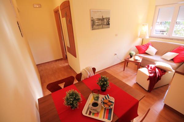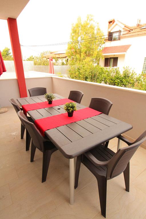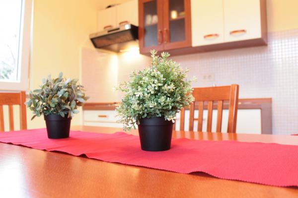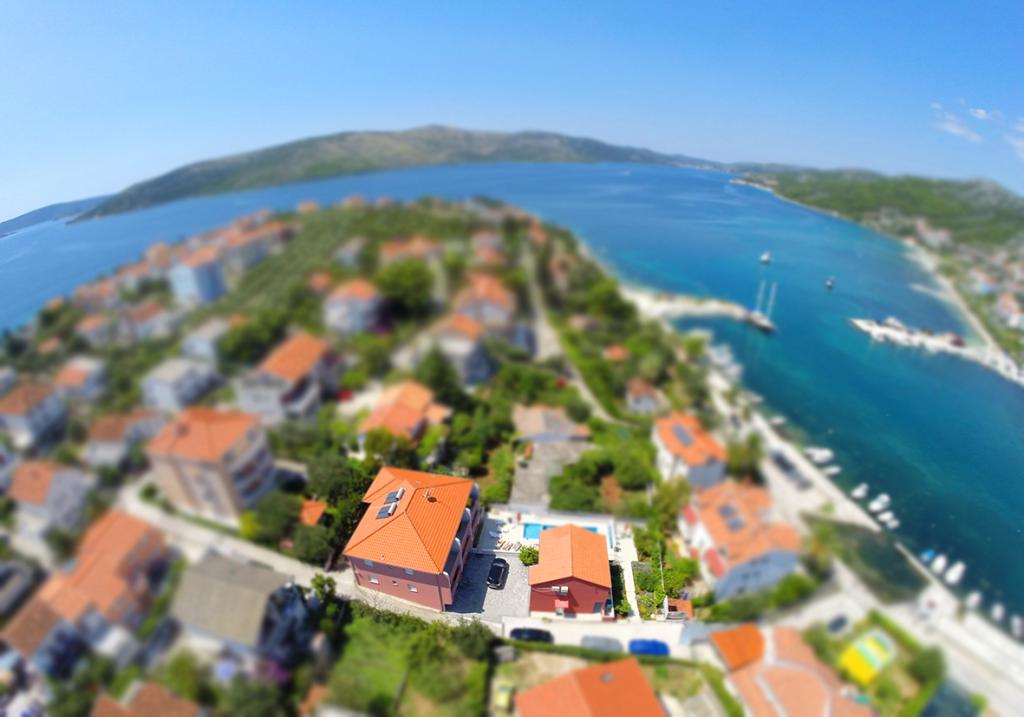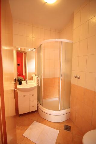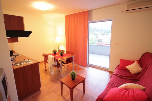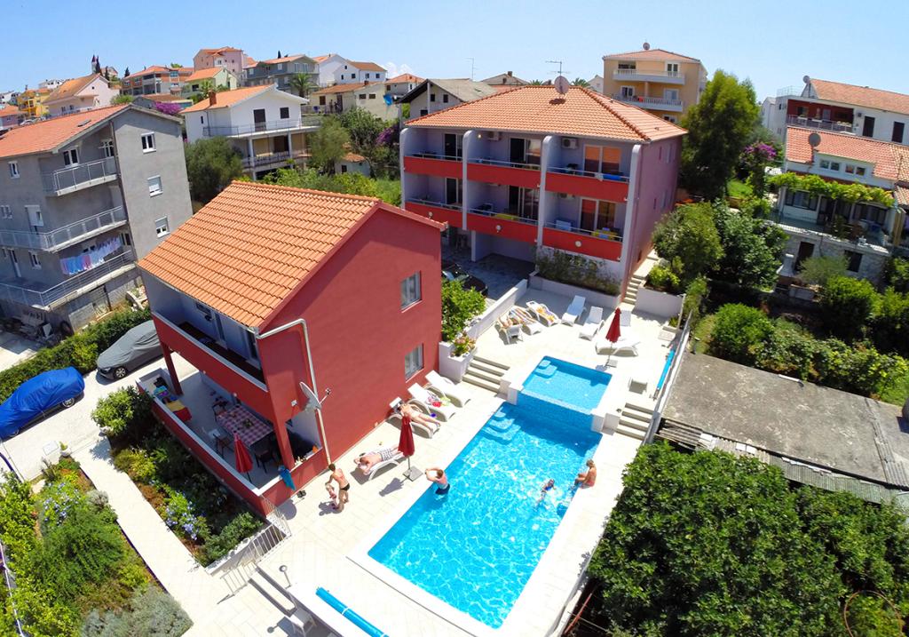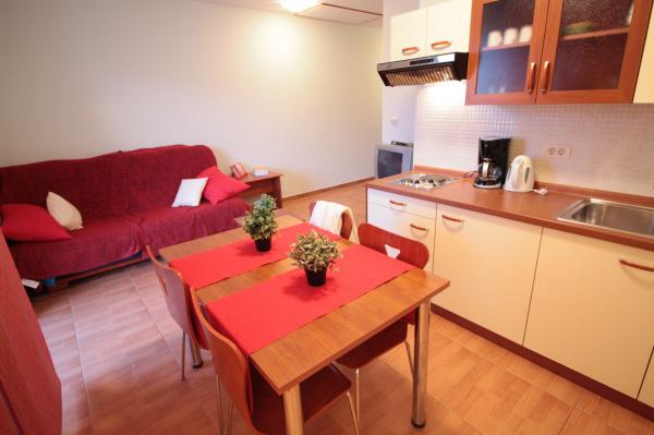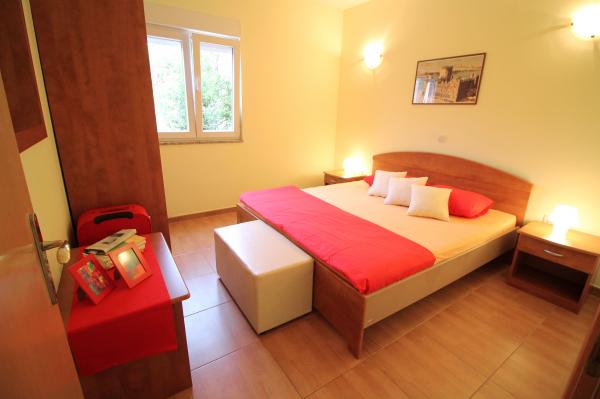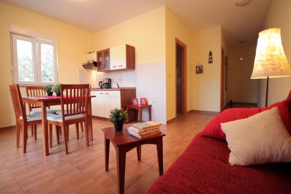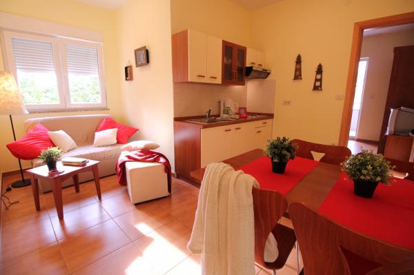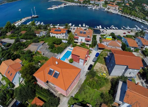W budynku znajduje się 6 apartamentów oraz jeden dom wolnostojący dla 8 osób. Istnieją dwa z dwoma sypialniami, gdzie każdy pokój ma własną łazienkę. Dom posiada 4 pokoje. Pozostałe cztery apartamenty składają się z jednej sypialni, dwóch dodatkowych łóżek w salonie i jednej łazienki. Wszystkie sześć apartamentów posiada duże tarasy (ok. 12m2) z widokiem na morze. Apartamenty znajdują się około 30 metrów od morza i znajdują się w cichym otoczeniu. W cenie pobytu nielimitowane korzystanie z basenu z podgrzewaną wodą, masażerami i przeciwprądem znajdującego się na podwórku, darmowe WIFI, bezpłatne korzystanie z grilla, bezpłatny parking na terenie obiektu. Dzieci mają do dyspozycji brodzik i plac zabaw. Plaża, restauracja i sklep znajdują się 2-3 minuty spacerem od apartamentu. Nasz pensjonat jest dostępny dla gości codziennie.Po wcześniejszym zgłoszeniu oferujemy bezpłatne korzystanie z przystani dla łodzi w bezpośrednim sąsiedztwie apartamentu (40m).