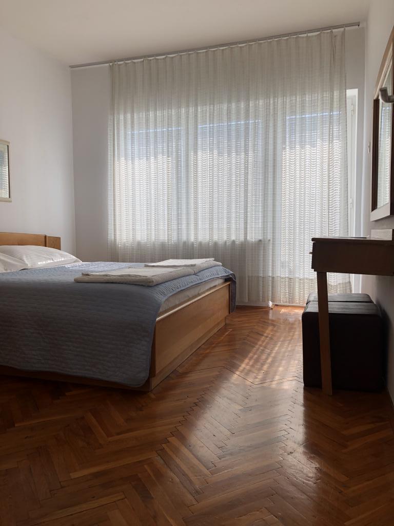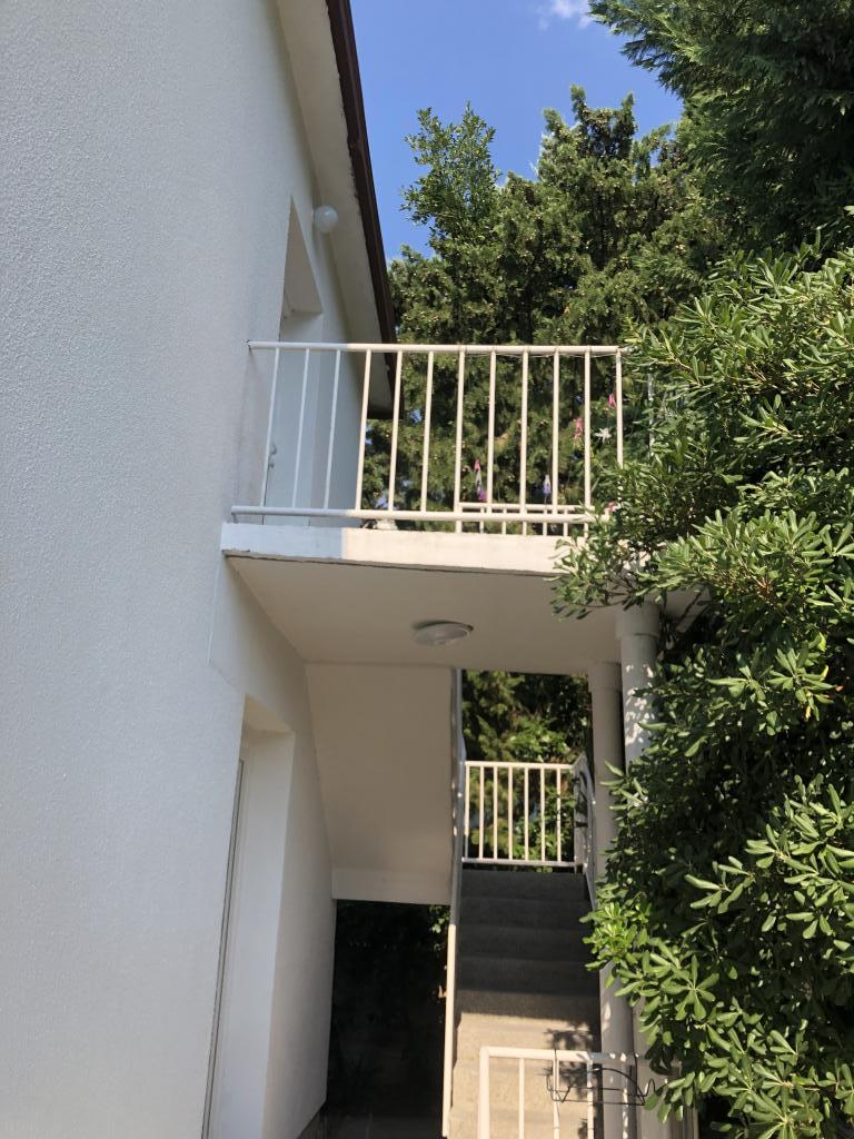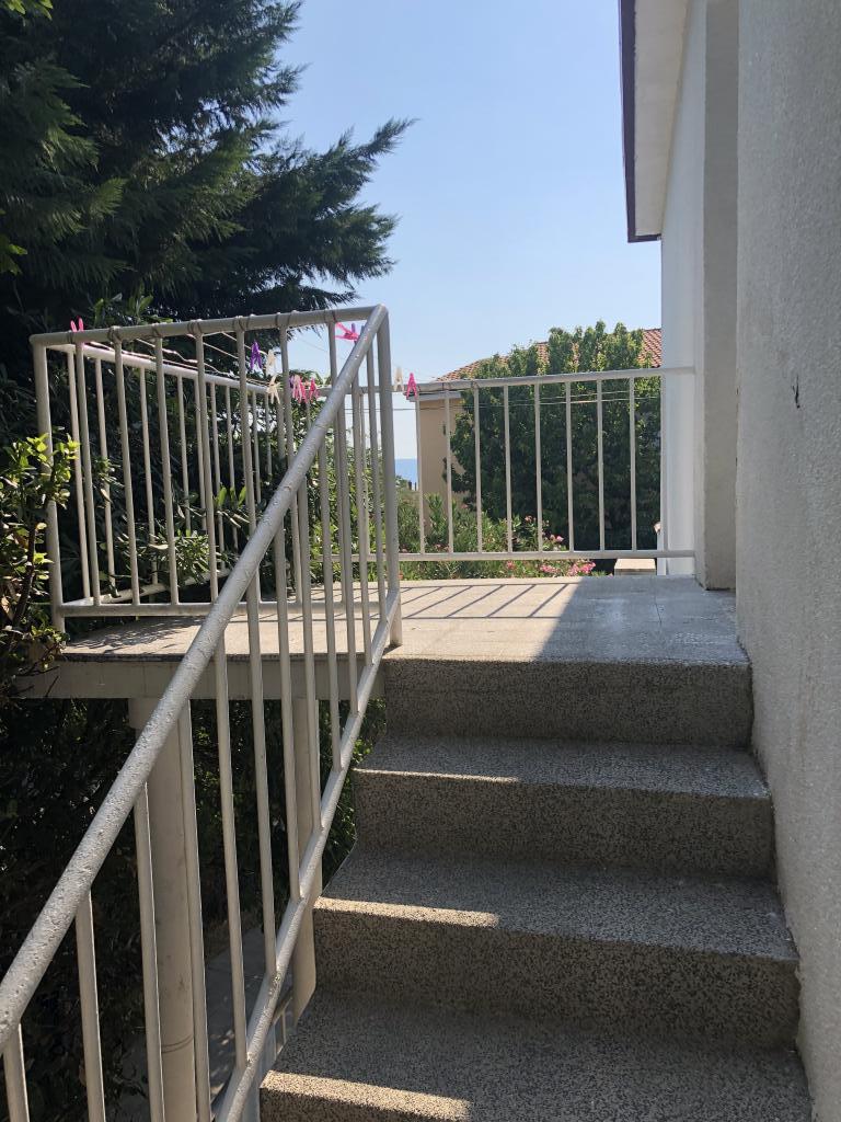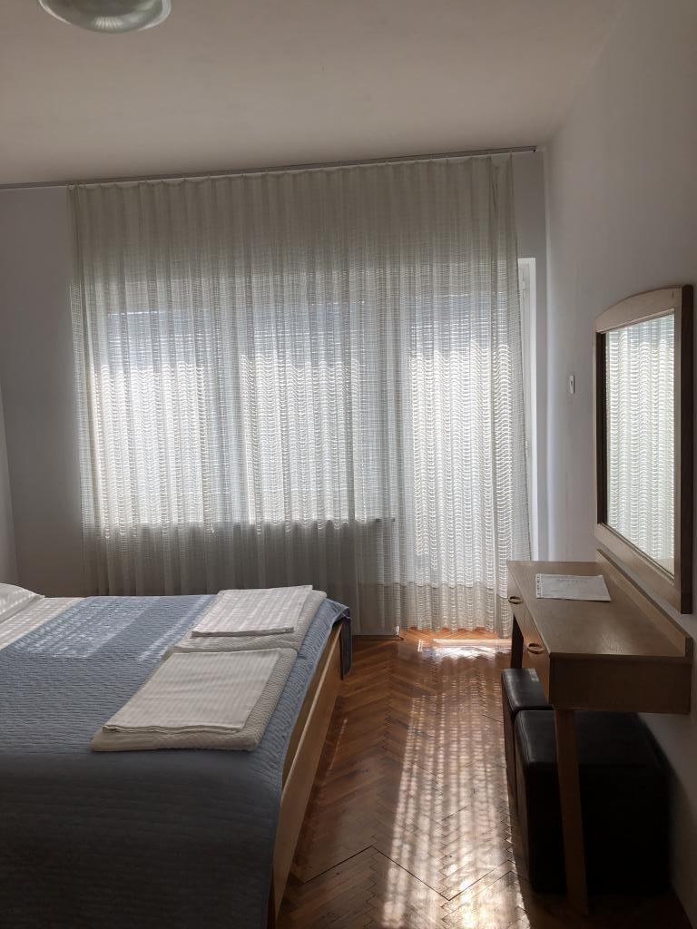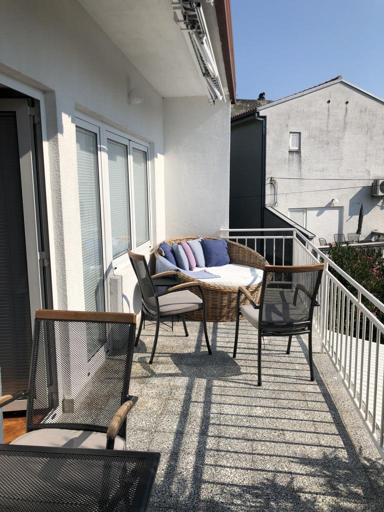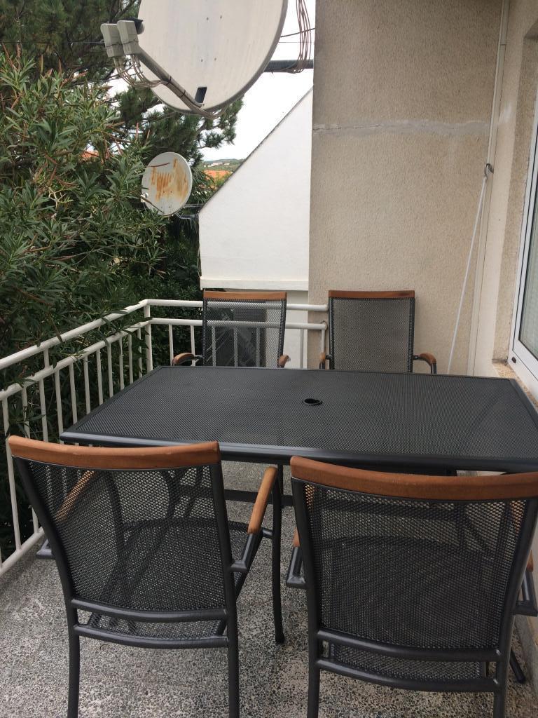 Nowocześnie urządzone mieszkanie położone na pierwszym piętrze domu jednorodzinnego, osobne piętro z osobnym wejściem i miejscem parkingowym. 5 minut spacerem od centrum i dziesięć od plaży. Składa się z przedpokoju, łazienki z wanną, w pełni wyposażonej kuchni wyposażonej w kuchenkę, lodówkę, mikrofalówkę, kompletne naczynia i sztućce. Sypialnie z łóżkiem małżeńskim i szafą wnękową, mniejsze sypialnie z rozkładaną sofą i szafą wnękową oraz salon z telewizorem i narożnikiem. Przed sypialnią i salonem znajduje się wygodny taras z widokiem na morze, zadaszony markizą i wyposażony w jadalnię oraz leżak. Przestrzeń jest klimatyzowana i ma wifi.