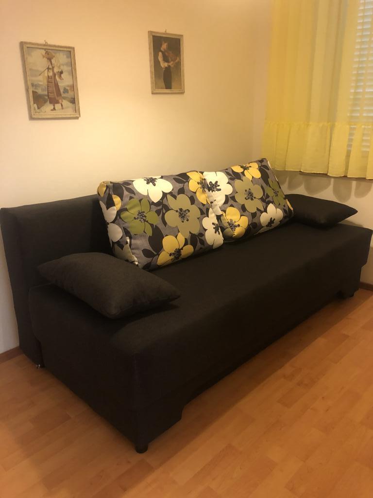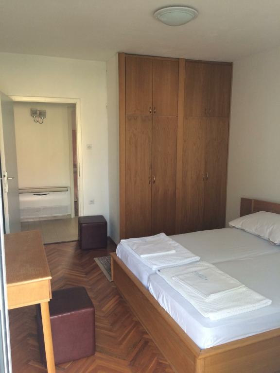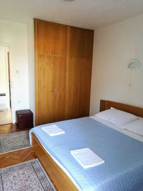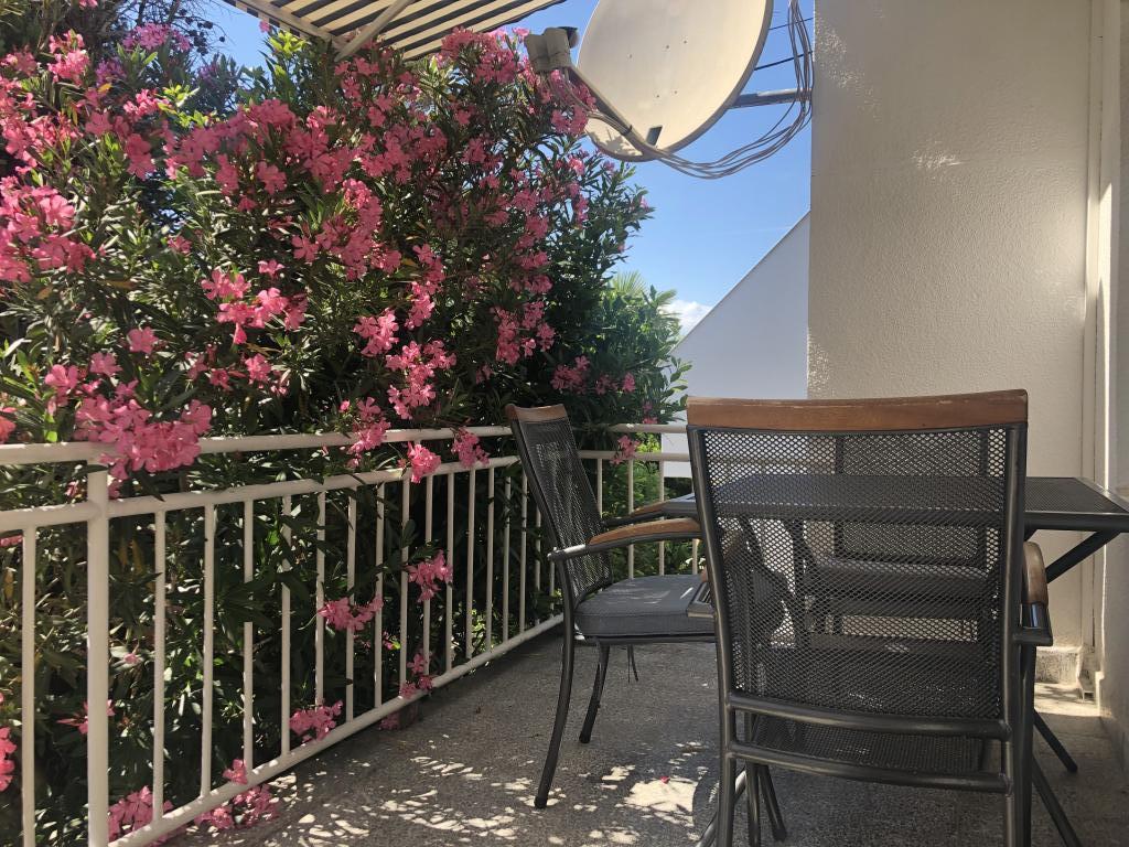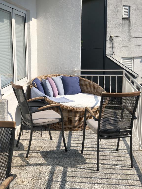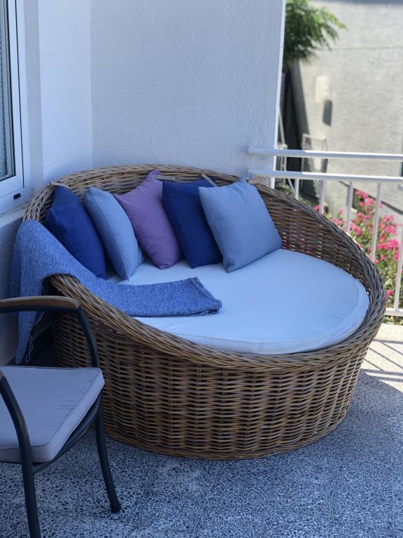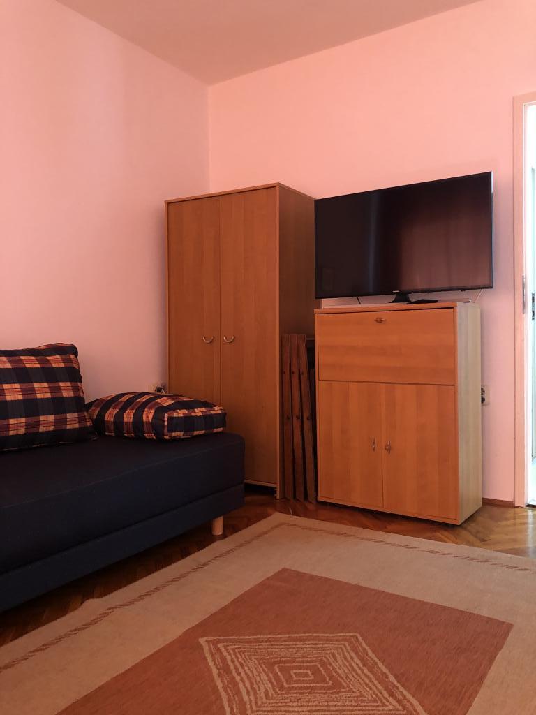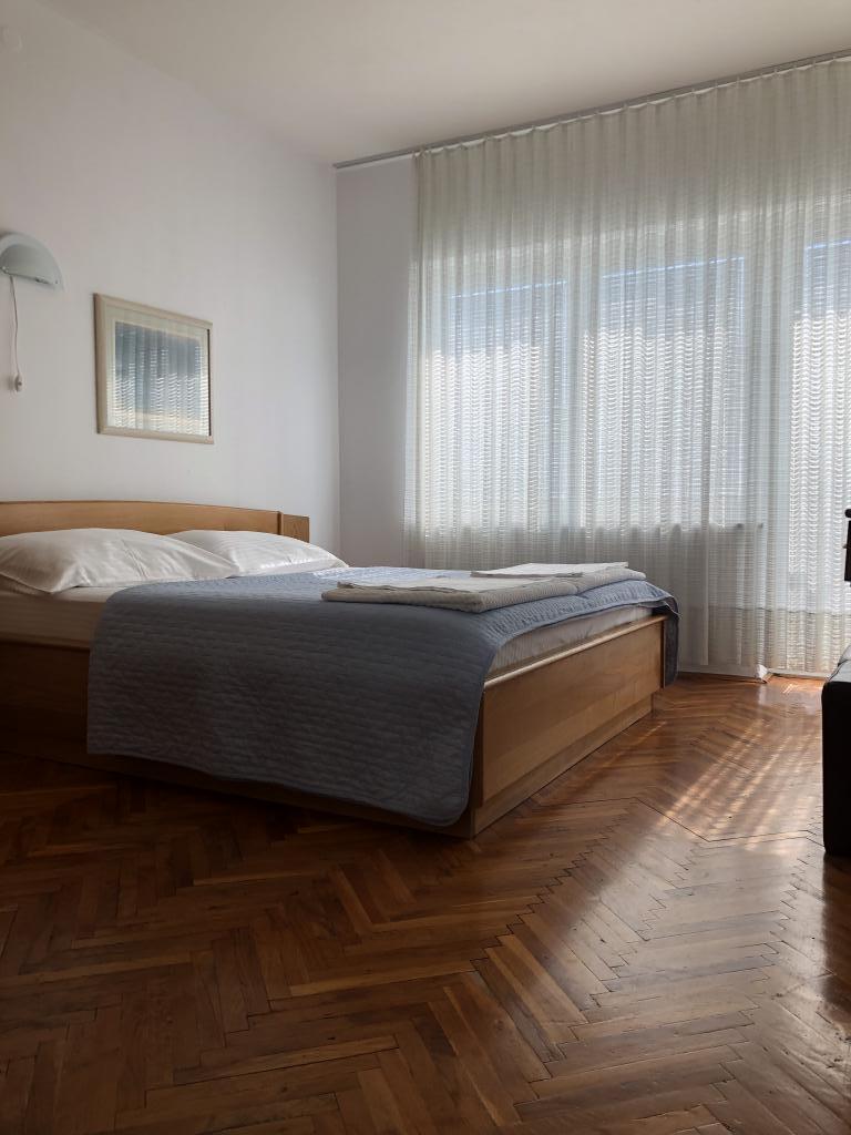 Nowocześnie urządzone mieszkanie położone na pierwszym piętrze domu jednorodzinnego, osobne piętro z osobnym wejściem i miejscem parkingowym. 5 minut spacerem od centrum i dziesięć od plaży. Składa się z przedpokoju, łazienki z wanną, w pełni wyposażonej kuchni wyposażonej w kuchenkę, lodówkę, mikrofalówkę, kompletne naczynia i sztućce. Sypialnie z łóżkiem małżeńskim i szafą wnękową, mniejsze sypialnie z rozkładaną sofą i szafą wnękową oraz salon z telewizorem i narożnikiem. Przed sypialnią i salonem znajduje się wygodny taras z widokiem na morze, zadaszony markizą i wyposażony w jadalnię oraz leżak. Przestrzeń jest klimatyzowana i ma wifi.