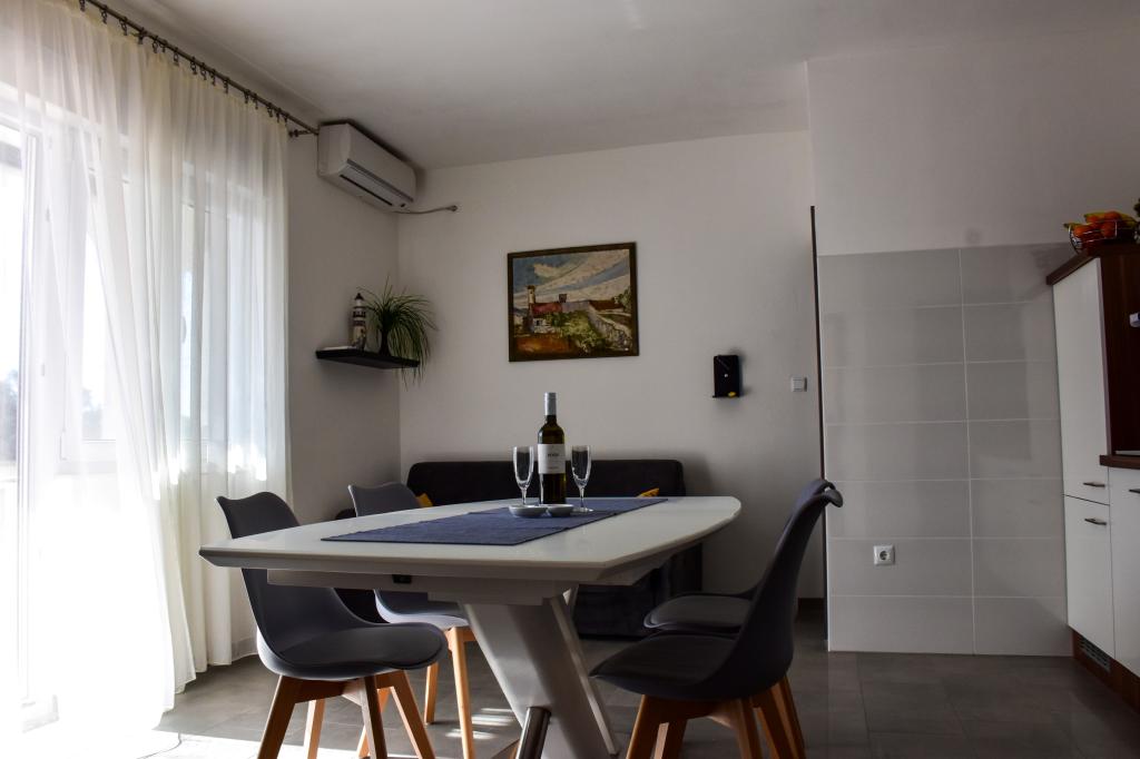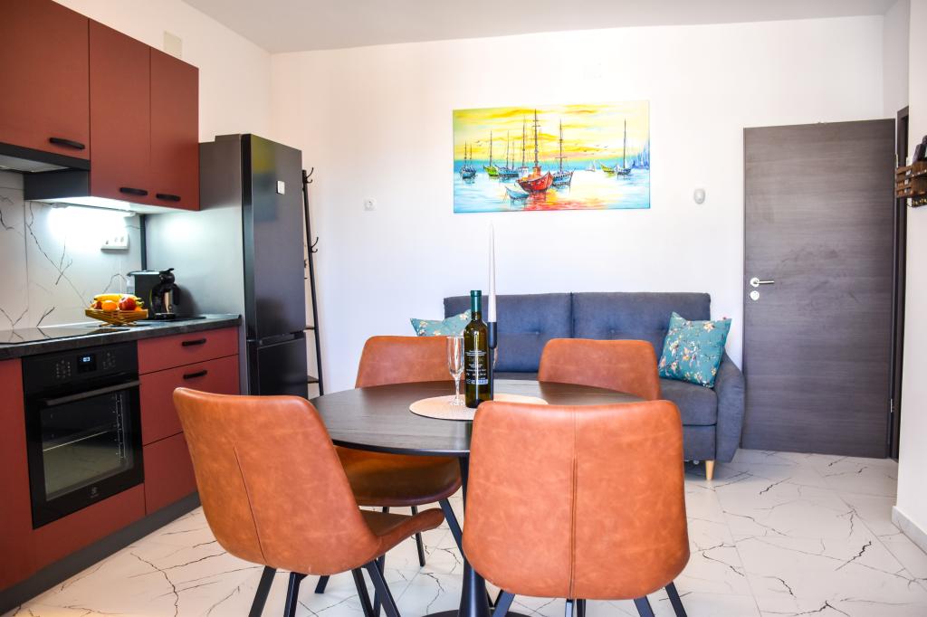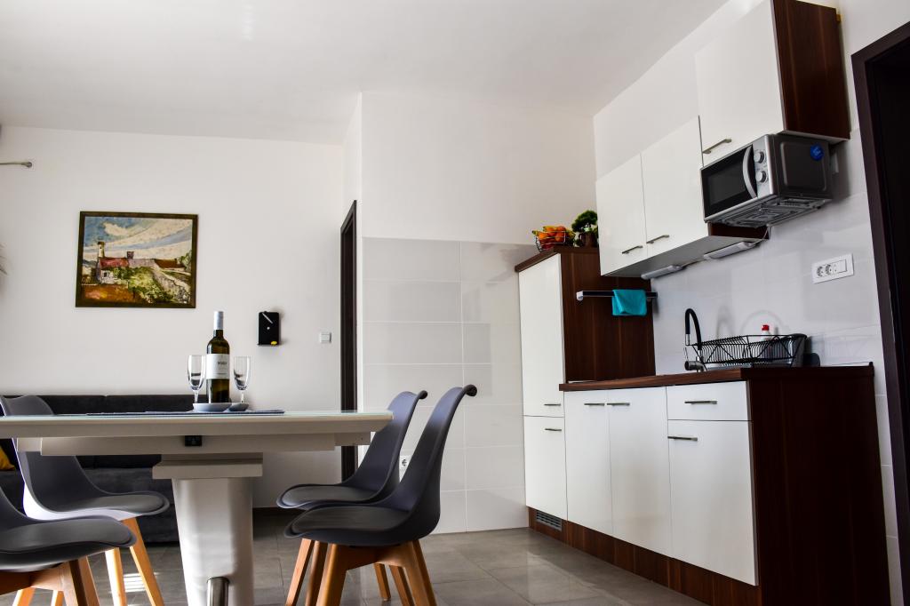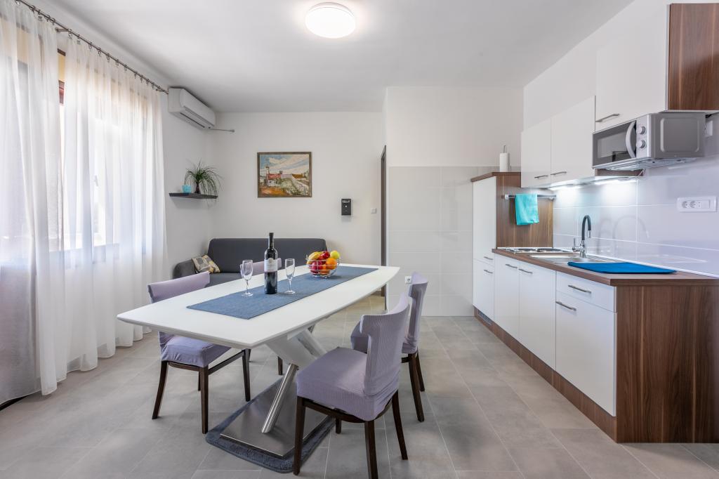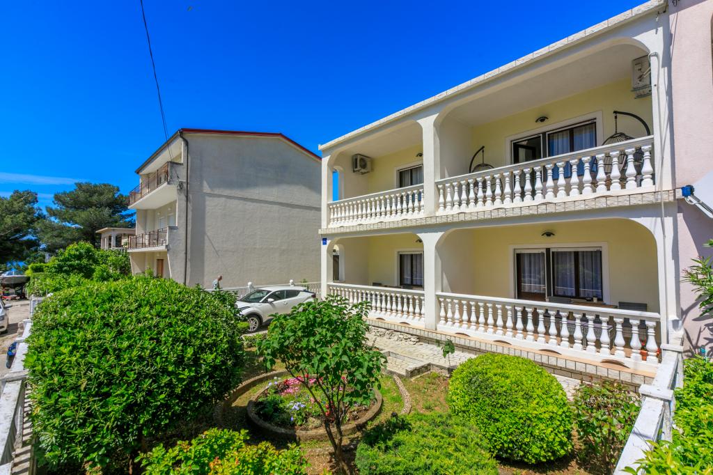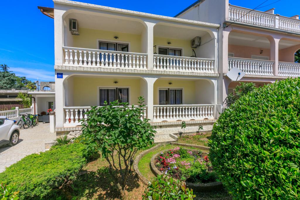 Apartamenty znajdują się w rodzinnym domu, kilka minut spacerem od morza i promenady z licznymi restauracjami, kawiarniami, obiektami sportowymi i sklepami. Apartament "Ema" (2+2) składa się z pokoju dwuosobowego, kuchni z jadalnią, w której znajduje się podwójna rozkładana sofa, którą można rozłożyć na łóżko małżeńskie, łazienki oraz przestronnego tarasu z grillem. Drugi apartament „Gita” (2+1) posiada dwuosobową sypialnię, przestronną kuchnię z jadalnią z rozkładaną sofą, łazienkę i przestronny taras.