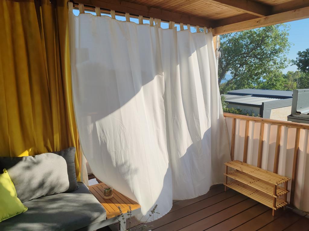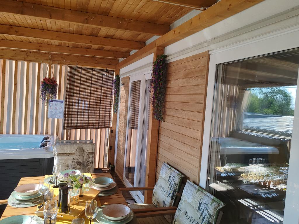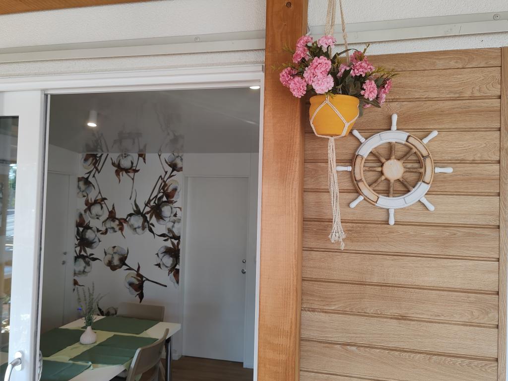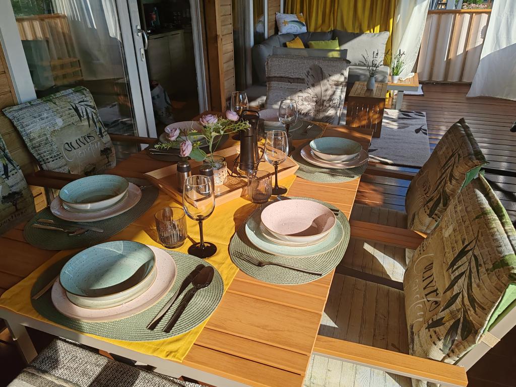 Piękny domek mobilny, w którym poczujesz się jak w domu, ponieważ posiada wysokiej jakości wyposażenie, od łóżek po kuchnię i piękny taras, co zapewnia pełną anonimowość. Sympatyczni właściciele również zapewnili miłe powitanie.