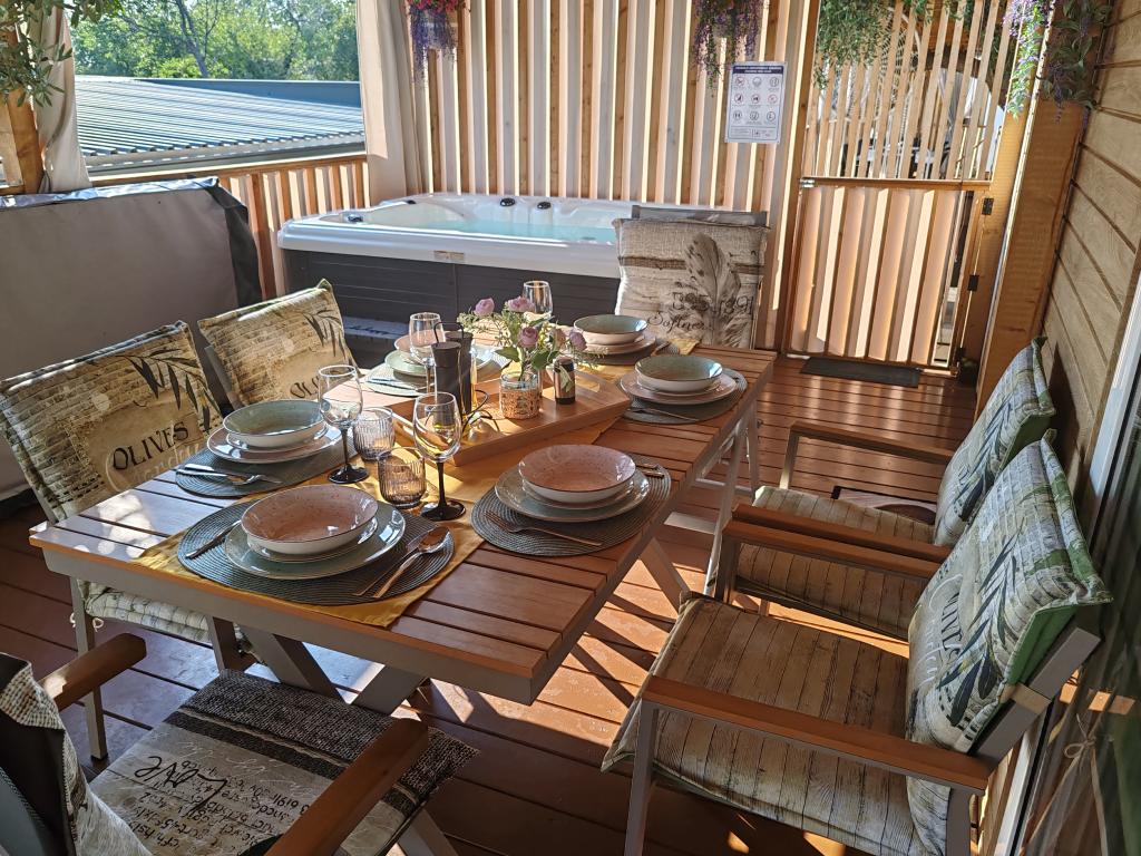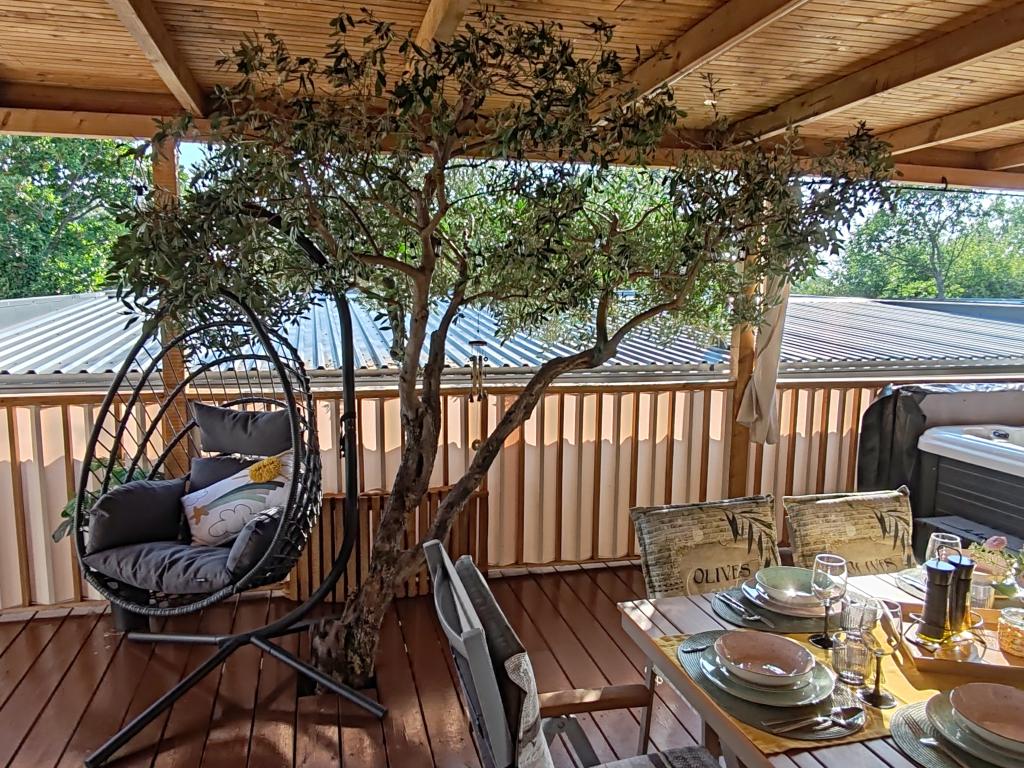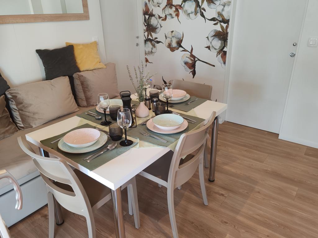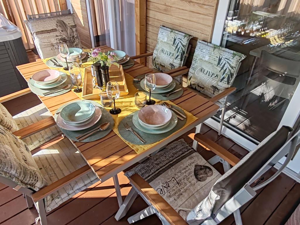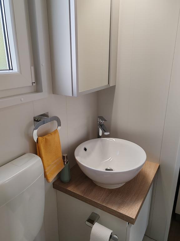 Piękny domek mobilny, w którym poczujesz się jak w domu, ponieważ posiada wysokiej jakości wyposażenie, od łóżek po kuchnię i piękny taras, co zapewnia pełną anonimowość. Sympatyczni właściciele również zapewnili miłe powitanie.