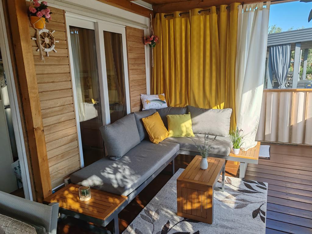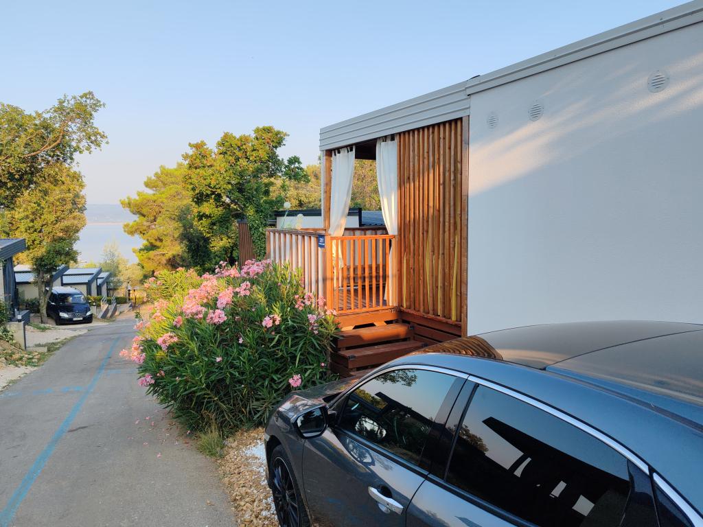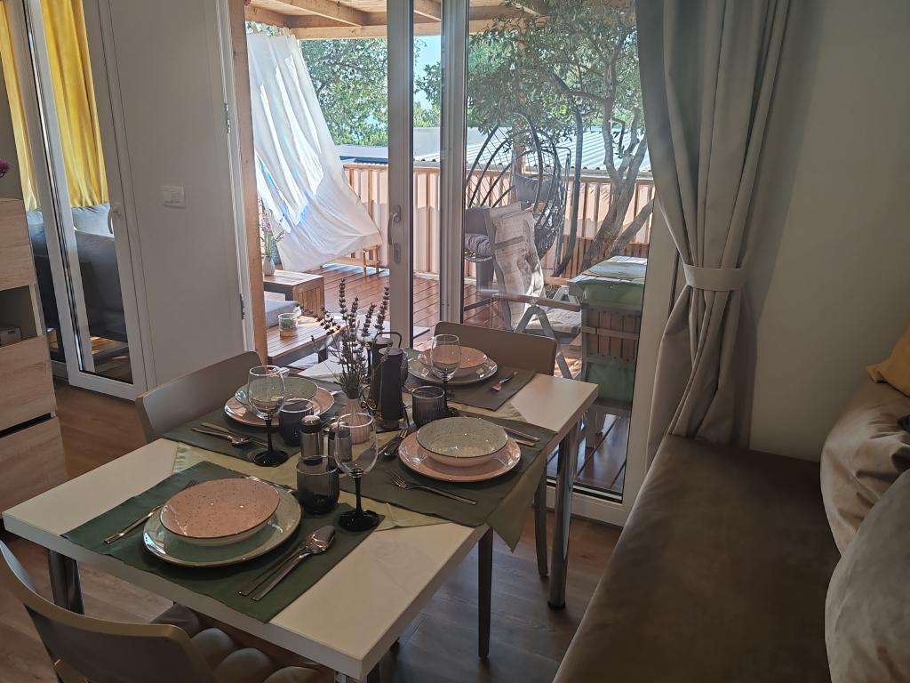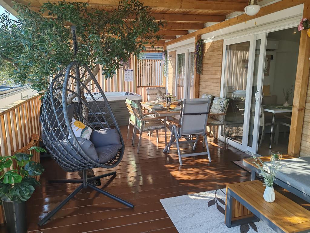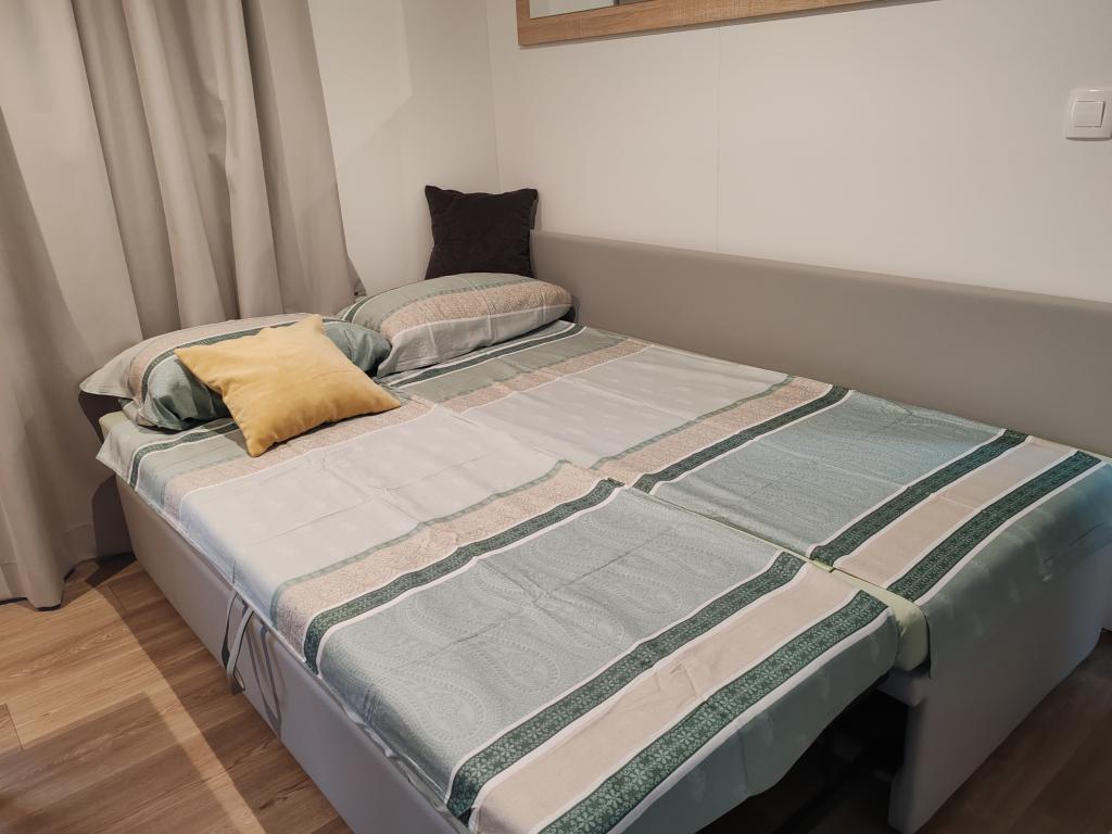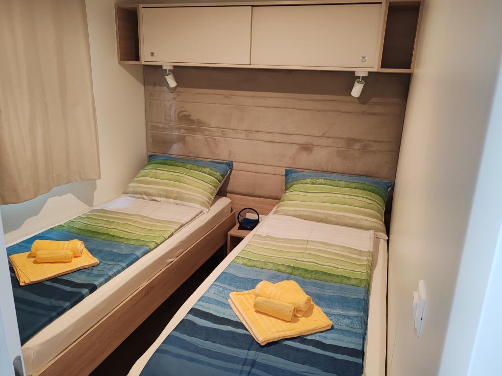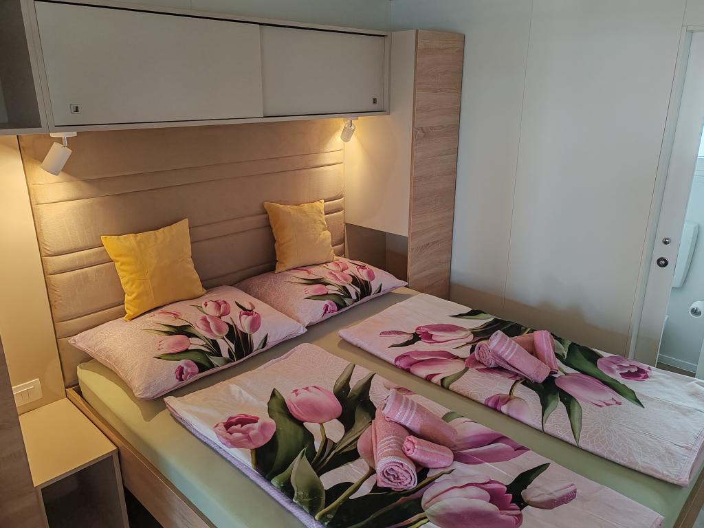 W pełni wyposażony i nowoczesny dom mobilny w doskonałej lokalizacji na znanym i dobrze wyposażonym kempingu, który oferuje wiele udogodnień, szczególnie dla rodzin z dziećmi. Dom o powierzchni 32 m² składa się z 2 sypialni, salonu oraz w pełni wyposażonej kuchni ze wszystkim, czego potrzebujesz, zmywarką, kuchenką mikrofalową, tosterem, ekspresem do kawy Dolce Gusto i czajnikiem. Do dyspozycji Gości są również dwie toalety z prysznicami. Jeden pokój wyposażony jest w łóżko podwójne o wymiarach 140 × 200 cm i własną łazienkę. Drugi pokój wyposażony jest w 2 łóżka pojedyncze o wymiarach 90 × 200 cm. W salonie znajduje się rozkładana sofa dla dwóch osób. Taras o powierzchni 29 m² wyposażony jest w podgrzewane jacuzzi z masażem i miejsca do siedzenia. Dom jest w pełni wyposażony we wszystko, czego potrzebujesz (pościel, ręczniki, kosmetyki itp.). Do dyspozycji Gości jest grill gazowy na świeżym powietrzu. Kompleks basenowy znajduje się zaledwie 100 m dalej, a plaża – ok. 250 m dalej. Do centrum Selc można dojść pieszo w zaledwie 13 minut. Obiekt oferuje prywatny parking i bezpłatny dostęp do internetu dzięki telewizorowi Smart TV.