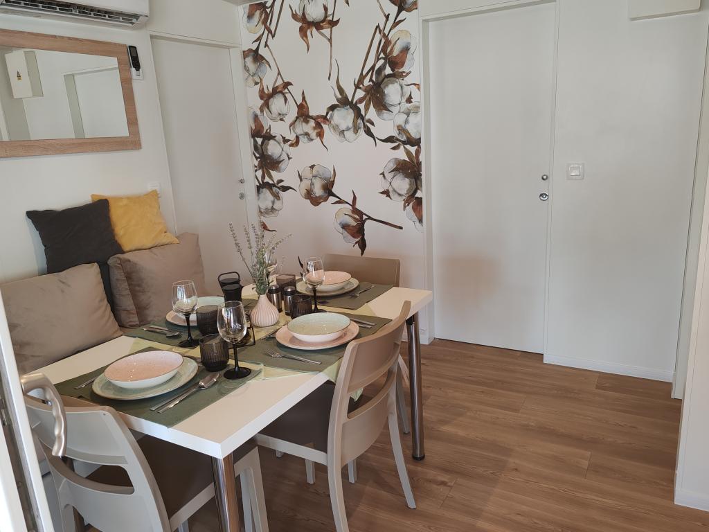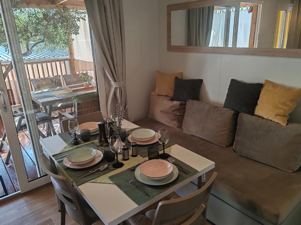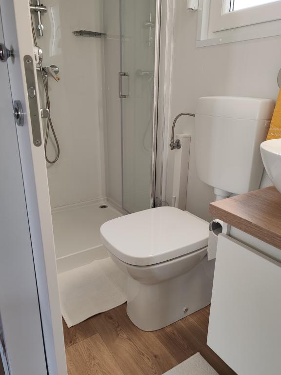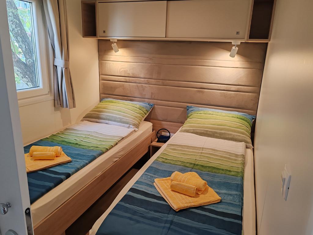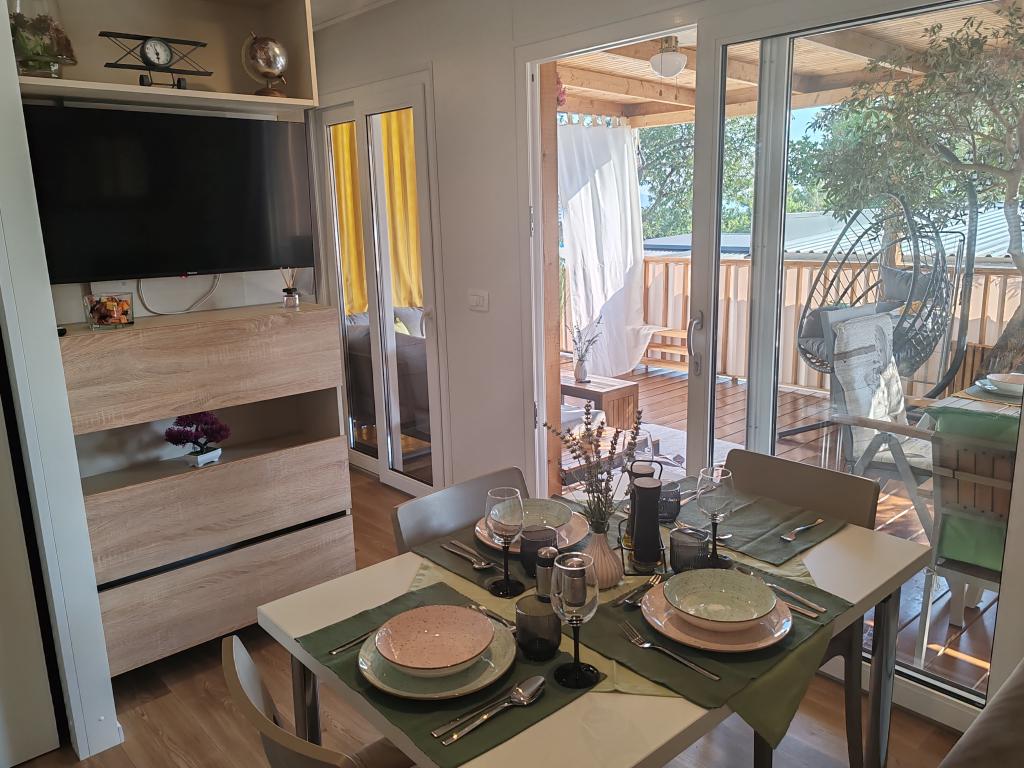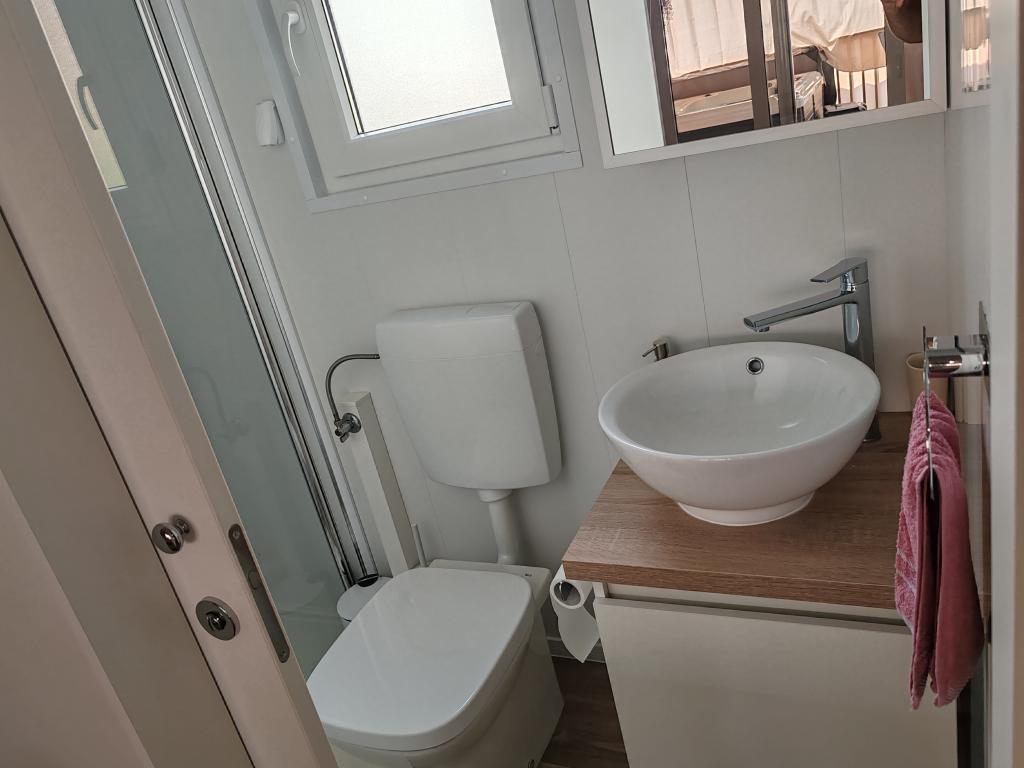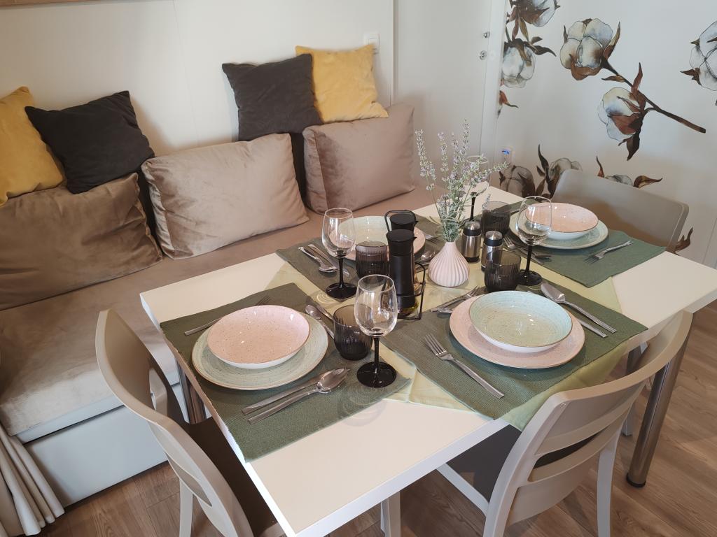 W pełni wyposażony i nowoczesny dom mobilny w doskonałej lokalizacji na znanym i dobrze wyposażonym kempingu, który oferuje wiele udogodnień, szczególnie dla rodzin z dziećmi. Dom o powierzchni 32 m² składa się z 2 sypialni, salonu oraz w pełni wyposażonej kuchni ze wszystkim, czego potrzebujesz, zmywarką, kuchenką mikrofalową, tosterem, ekspresem do kawy Dolce Gusto i czajnikiem. Do dyspozycji Gości są również dwie toalety z prysznicami. Jeden pokój wyposażony jest w łóżko podwójne o wymiarach 140 × 200 cm i własną łazienkę. Drugi pokój wyposażony jest w 2 łóżka pojedyncze o wymiarach 90 × 200 cm. W salonie znajduje się rozkładana sofa dla dwóch osób. Taras o powierzchni 29 m² wyposażony jest w podgrzewane jacuzzi z masażem i miejsca do siedzenia. Dom jest w pełni wyposażony we wszystko, czego potrzebujesz (pościel, ręczniki, kosmetyki itp.). Do dyspozycji Gości jest grill gazowy na świeżym powietrzu. Kompleks basenowy znajduje się zaledwie 100 m dalej, a plaża – ok. 250 m dalej. Do centrum Selc można dojść pieszo w zaledwie 13 minut. Obiekt oferuje prywatny parking i bezpłatny dostęp do internetu dzięki telewizorowi Smart TV.