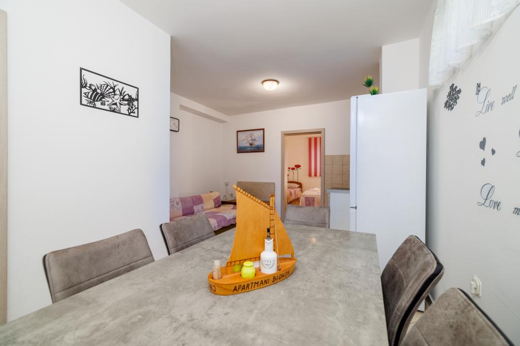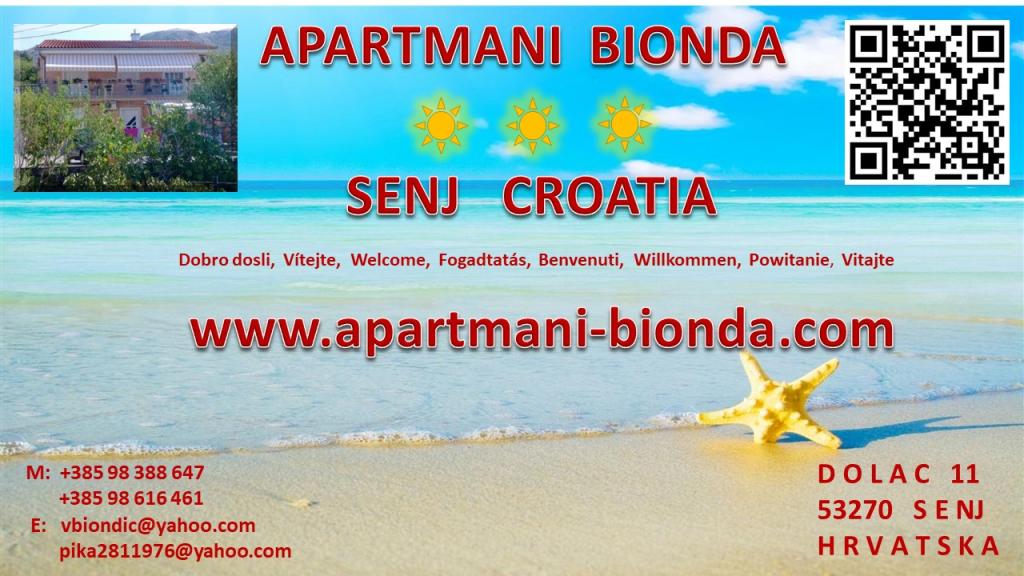 Apartamenty BIONDA są nowo wybudowane, w pełni i nowocześnie wyposażone, w spokojnej części miasta Senj. Znajdują się one w oddzielnym budynku, czyli domu jednorodzinnym. Każdy apartament ma osobne wejście, własny balkon lub taras, dostępny stół i krzesła na balkonie, telewizję satelitarną, bezprzewodowy internet, WI-FI, mini bar, klimatyzację, elektryczne płyty grzewcze i parking dla samochodu. W bezpośrednim sąsiedztwie miasta Senj znajduje się Park Narodowy Jezior Plitwickich, parki przyrody Velebit, Zavratnica, wyspy Goli, Grgur, Prvić, Krk i Rab. Apartamenty wynajmowane są przez cały rok.