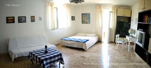 MIESZKANIE W DOMU NA WYBRZEŻU, Z FANTASTYCZNYM WIDOKIEM, Z DALEKO OD TŁUMU! Apartament Merara znajduje się tuż nad brzegiem morza, w zatoce Stari Trogir między Marina i Rogoznica, Trogir i Primošten. Jest daleko od osady, co zapewnia spokój i radość w naturalnym środowisku sosen. Dostęp jest możliwy samochodem i łodzią. Dostępny jest parking na dwa samochody i miejsce do cumowania łodzi, a także dodatkowe miejsce do kotwiczenia w pobliżu domu. W dwóch sypialniach i salonie może zamieszkać do 6 osób. Łazienka z WC, kuchnia z jadalnią, kominek z grillem na dużym tarasie ze wspaniałym widokiem. Ogród z roślinnością śródziemnomorską to jedyna rzecz, która oddziela dom od morza. Chociaż jest odizolowany, dzięki systemowi energii słonecznej i generatorowi prądu, jest tam cały komfort, do którego jesteś przyzwyczajony: ciepła woda, telewizja / SAT, prąd, WiFi itp.