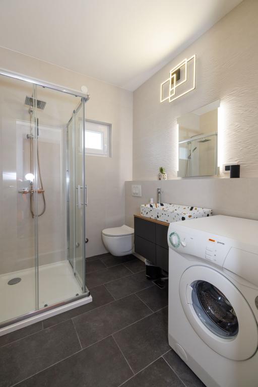 Dom położony jest 200 m od plaży w spokojnej okolicy. Przed domem jest parking na 2-3 samochody. Mieszkanie znajduje się na pierwszym piętrze. Powierzchnia mieszkania to 65 m2, a balkon 10 m2. Posiada 2 sypialnie. Sypialnia 1 ma duże łóżko (1,60 x 2,00 cm) i prywatną łazienkę wewnątrz pokoju, o łącznej powierzchni 16m2. Jest też wyjście na główny balkon. Sypialnia 2 ma duże łóżko (1,60 x 2,00 cm) i mały balkon o powierzchni 5 m2. Apartament posiada 2 łazienki z prysznicem. W jednej łazience znajduje się pralka. W salonie o powierzchni 15m2 znajduje się rozkładana sofa dla jeszcze jednej osoby, jest też telewizor LCD z kanałami satelitarnymi. Salon prowadzi na główny balkon. Do dyspozycji Gości jest również w pełni wyposażona kuchnia z kuchenką, czajnikiem, zmywarką, lodówką z zamrażarką, kuchenką mikrofalową i przelewowym ekspresem do kawy. Apartament posiada również klimatyzację i bezpłatny bezprzewodowy dostęp do Internetu.