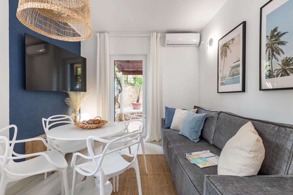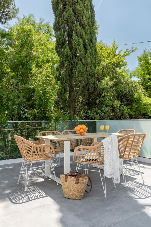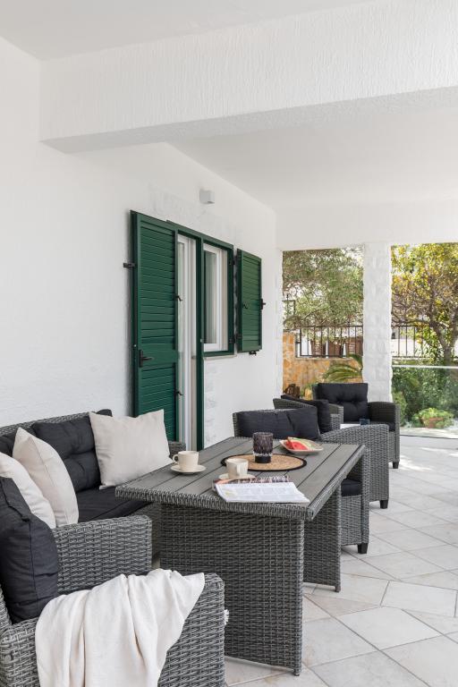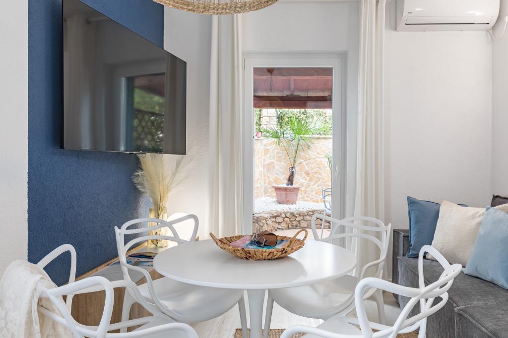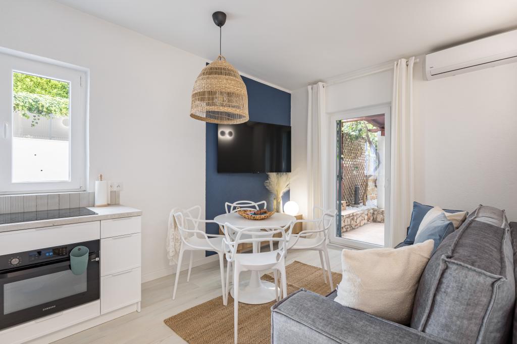Apartamenty w Marina House: A, B, C i E mają bezpośredni widok na morze, taras 25 m2, w pełni wyposażone. Apartament D nie ma widoku na morze, a przed domem duży, ogrodzony ogród, dobry dla dzieci. W ogrodzie masz grilla i duży stół. Na plaży, która ma 35 metrów długości, plaża jest piaszczysta i masz cień. Na lato 1 czerwca budowany jest teraz duży basen. jest otwarciem