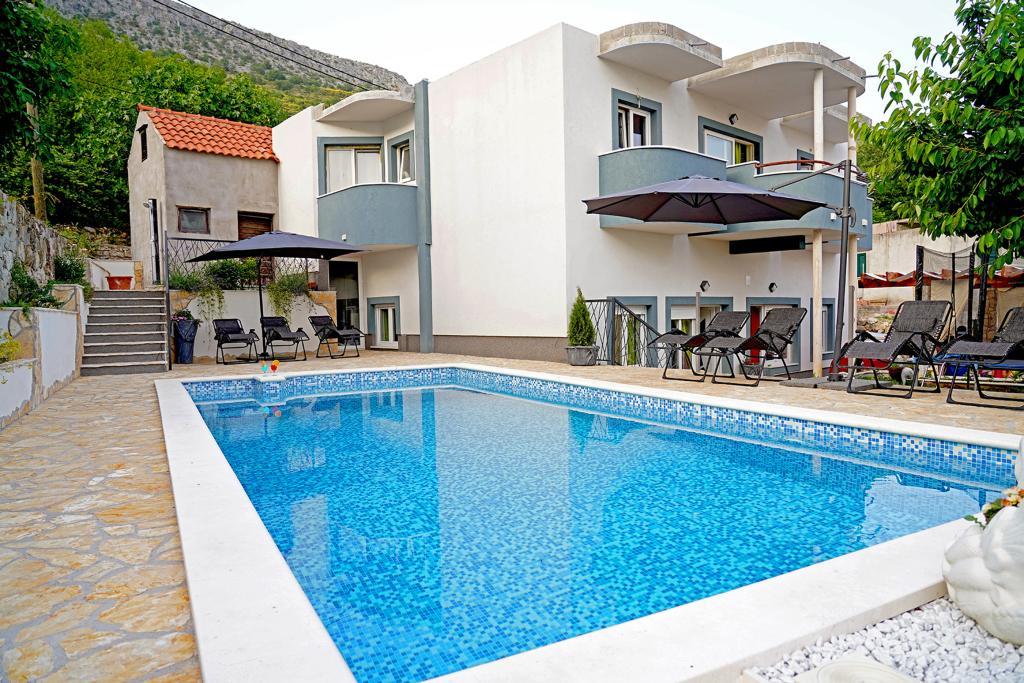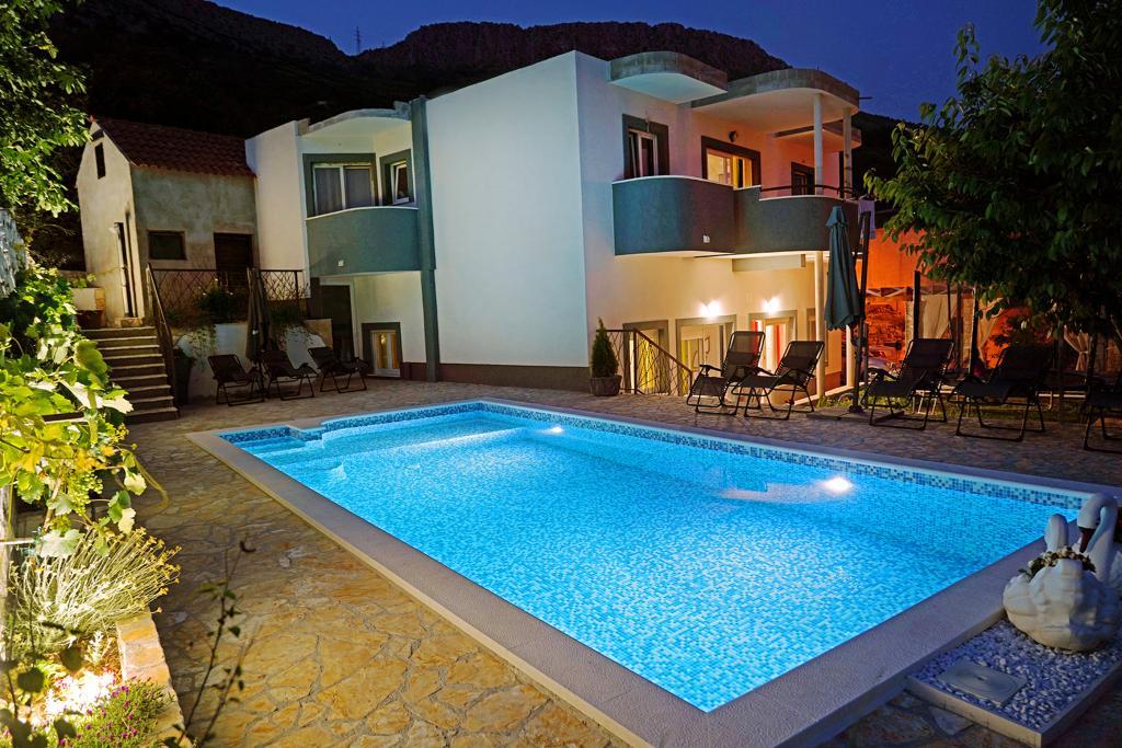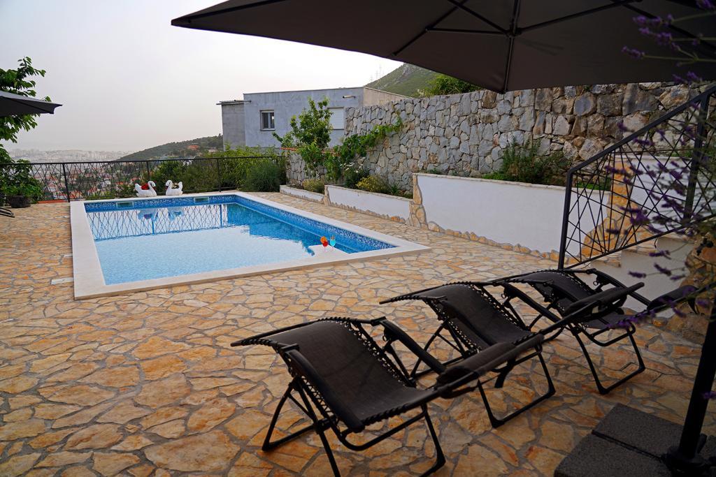 Na zboczach wzgórza Kozjak, w Solinie, zaledwie 8 km od Splitu, znajduje się ten piękny dom z basenem. Poznaj bogate dziedzictwo kulturowe i historyczne miasta Split, Trogir i starożytną Salonę. DOM SKŁADA SIĘ Z DWÓCH NOWOCZESNIE WYPOSAŻONYCH LOKALI MIESZKALNYCH NA PARTERU. Idealny dla dwóch rodzin. Każda kwatera składa się z jednej sypialni z łóżkiem małżeńskim, z własną łazienką oraz pokoju wyposażonego w dwa pojedyncze łóżka z możliwością połączenia w łóżko małżeńskie. Klimatyzowany salon z rozkładaną sofą i telewizją satelitarną. Przestronna toaleta z wanną z hydromasażem. Przed domem goście mogą korzystać z prywatnego basenu z magicznym widokiem na Adriatyk i wyspy oraz miasto Split. Mają też grill na świeżym powietrzu i altanę z miejscami do siedzenia, gdzie można zjeść romantyczną kolację. Strzeżone miejsce parkingowe na podwórku (nie całkowicie ogrodzone).