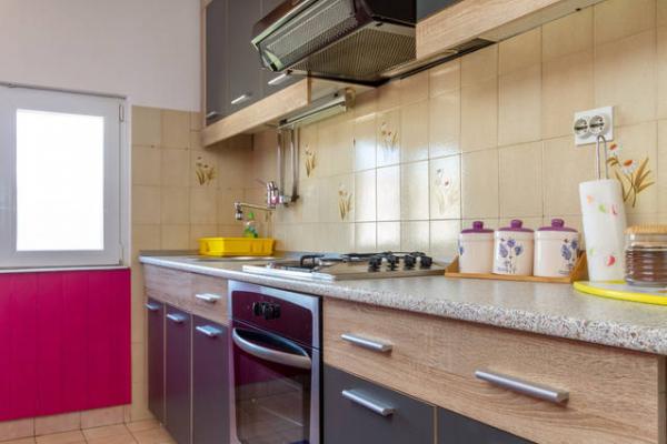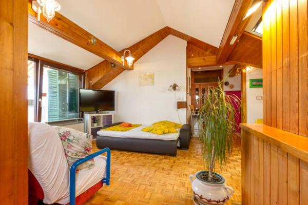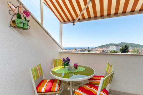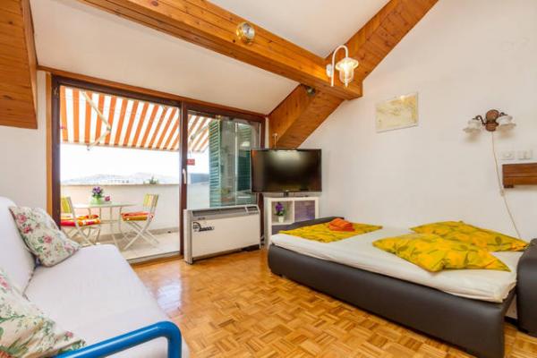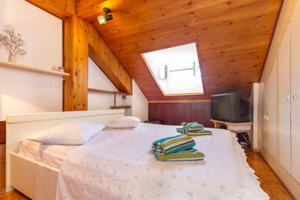 Apartament znajduje się w prywatnym domu, który jest 70 lat Willę Leontić, w centrum miasta, 800 metrów od pałacu, w spokojnej okolicy, dom otoczony jest zielenią i palmami, goście mają swój własny, prywatny parking, a centrum jest tylko kilka minutowego spaceru. Mieszkanie położone jest w cichej ulicy, z widokiem na morze, wygodne, przytulne i duży 80 m2, posiada dwie sypialnie, jedna i druga mają podwójne łóżko dla dwóch osób, duży salon 35 m2 i dodatkowe łóżko dla dwóch osób. Apartament przeznaczony jest dla sześciu osób. W salonie znajduje się taras z widokiem na morze i zieleń wokół domu. W salonie znajduje się duży telewizor LCD z dostępem do ponad 40 kanałów. Jest on dostępny 24/7.