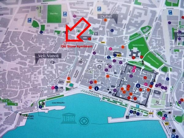 Old Stone House znajduje się w samym sercu Splitu, w części miasta zwanej Vela Varos. Miasto jest pełne starych kamiennych domów ozdobionych kwiatami i małych uliczek (ulic) charakterystyczny dla Dalmacji. Apartament znajduje się 650 m od Diklecijanove pałacu, 400 metrów od nabrzeża. Spokojnie 15 minut spacerem można dostać się na wzgórze Marjan, na którego brzegu można popływać i odpocząć w cieniu sosen. Piaszczysta plaża Bačvice, znajduje się około 1300 m od domu (15 min pieszo). Bardzo blisko są Peskarija (rynek ze świeżych ryb), a rynek (rynek ze świeżymi owocami i warzywami). Apartament mieści się na trzech piętrach. Na parterze znajduje się dziedziniec z grillem, który jest przeznaczony wyłącznie dla osób, które są aktualnie korzystających z mieszkania. Na pierwszym piętrze znajduje się taras, dwie sypialnie i łazienka. Na drugim piętrze znajduje się pokój dzienny z kuchnią i jadalnią. W kuchni znajduje się lodówka, piekarnik, kuchenka mikrofalowa, czajnik elektryczny, ręczniki, serwetki ... W łazience są mydło, szampon, zasilacz, włosy, torby higieniczne ...
