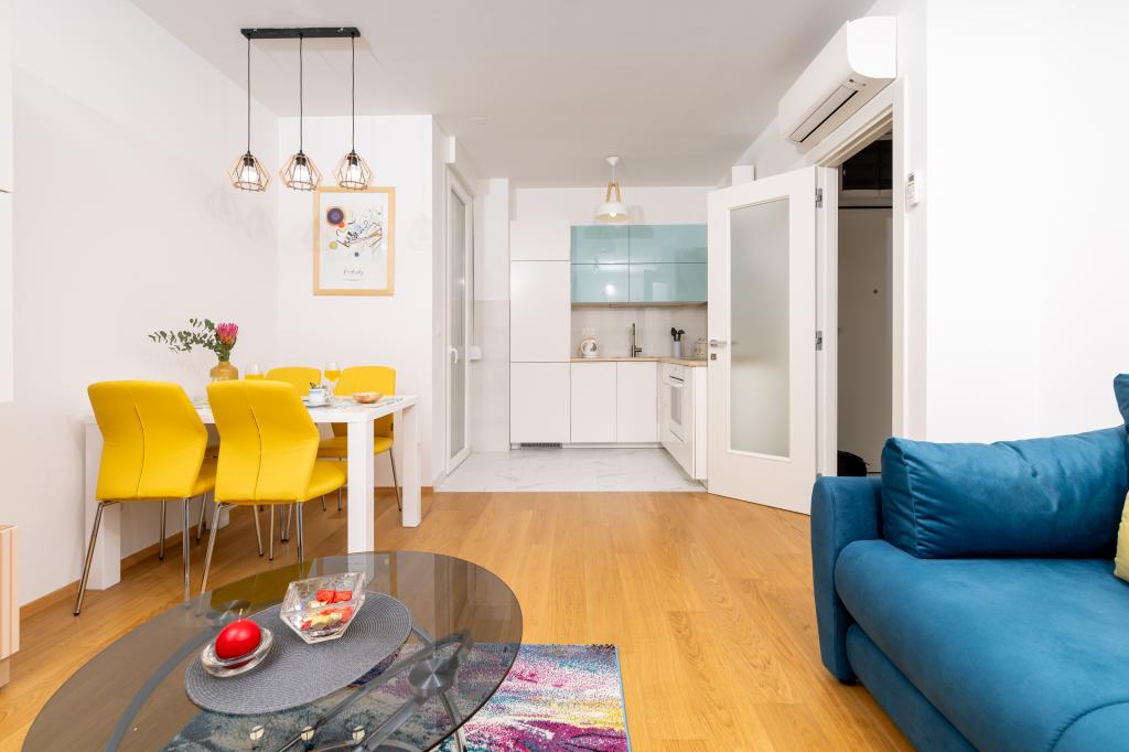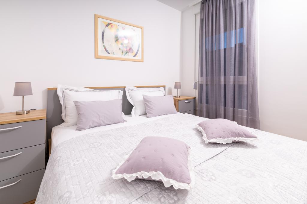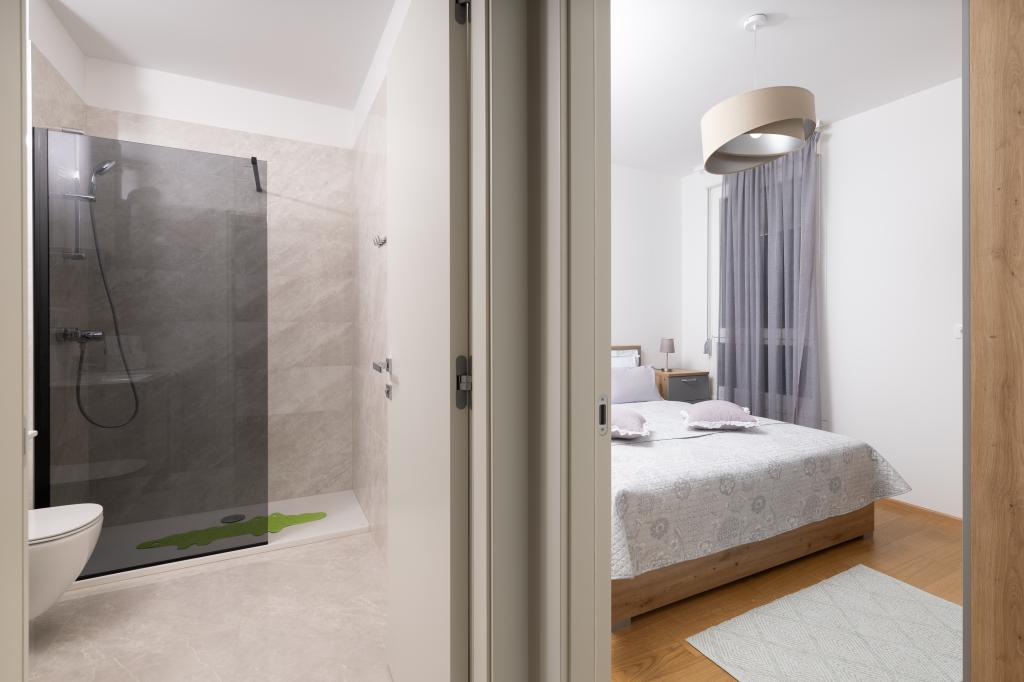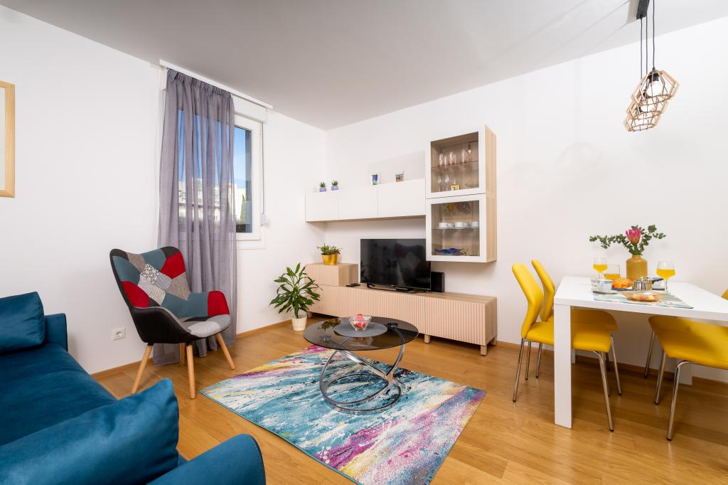 W pełni i nowocześnie wyposażone mieszkanie w nowym budynku w mieście Split, Split - Środkowa Dalmacja. Budynek położony jest w spokojnej części miasta (Trstenik), 300 metrów od morza i dużej plaży żwirowej. Gospodarze nie mieszkają w budynku. W apartamencie jest bezpłatny dostęp do internetu. W promieniu 1 km znajdują się: sklep, targ, apteka, pogotowie ratunkowe, bankomat, bank, klub nocny, restauracja, kawiarnia. Centrum, dworzec autobusowy, port promowy znajdują się w odległości ponad kilometra. W apartamencie może nocować 2+1 gości. Łóżka są rozmieszczone w sypialni i salonie. Goście mogą podziwiać widok na morze z własnego balkonu. Goście mogą korzystać z garażu po uzgodnieniu. Garaż znajduje się w budynku, połączony z apartamentem windą.