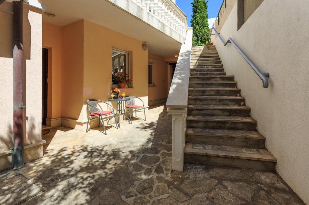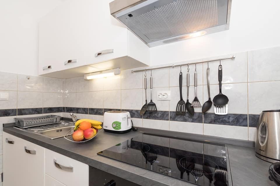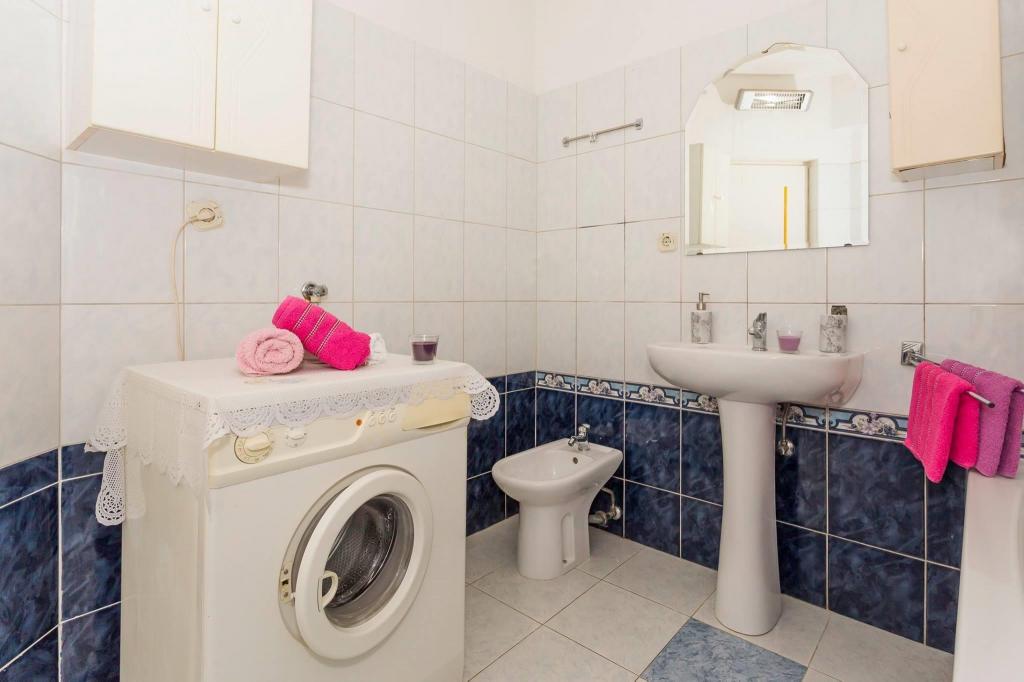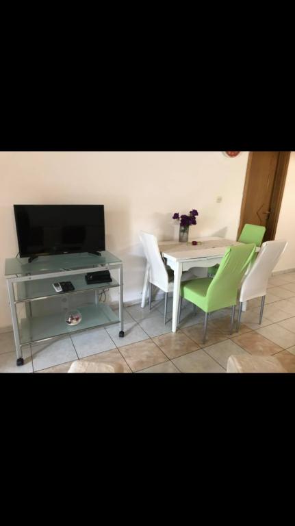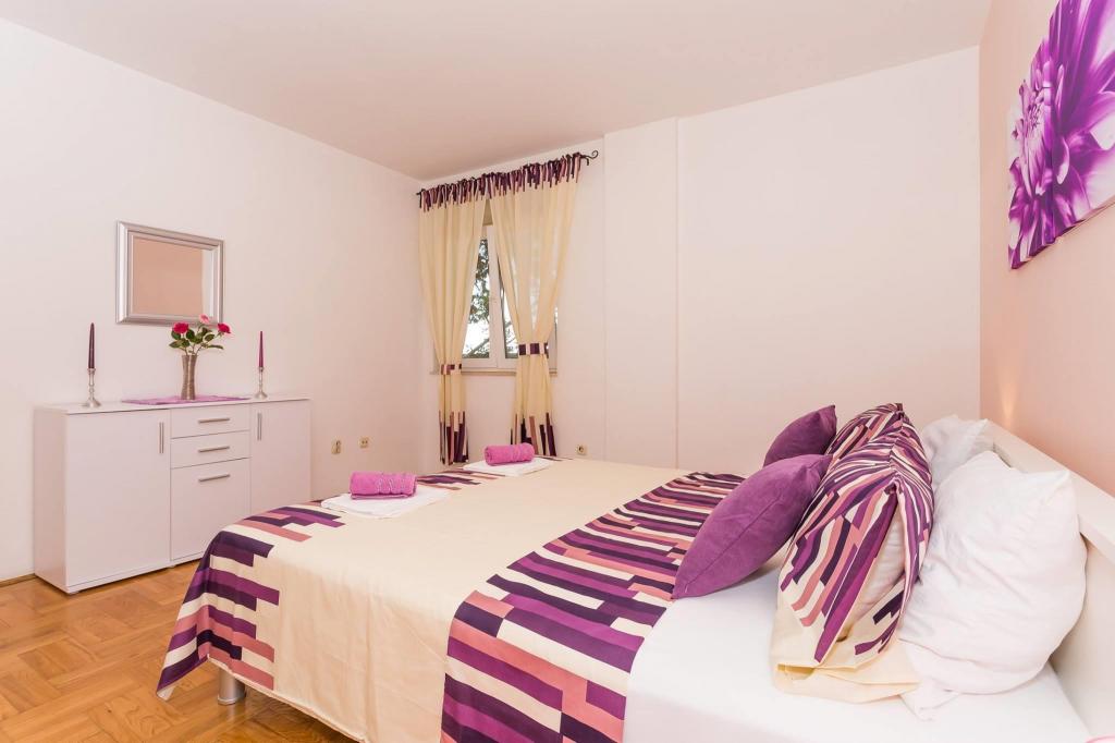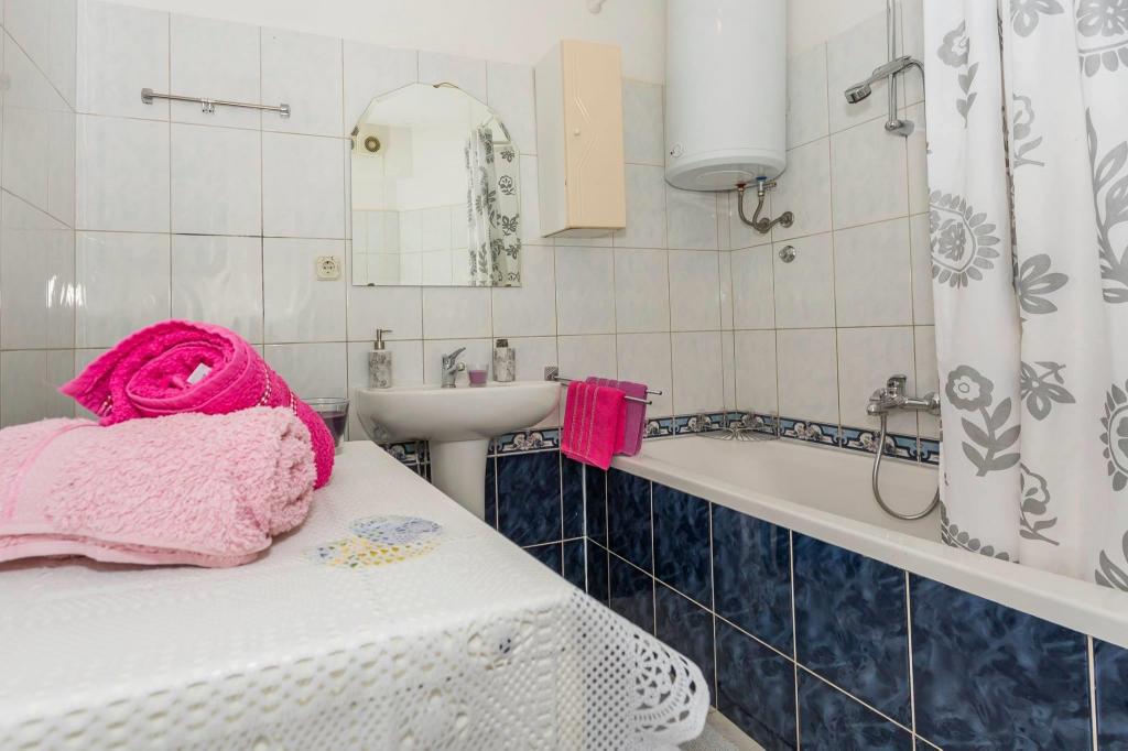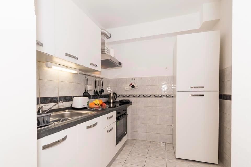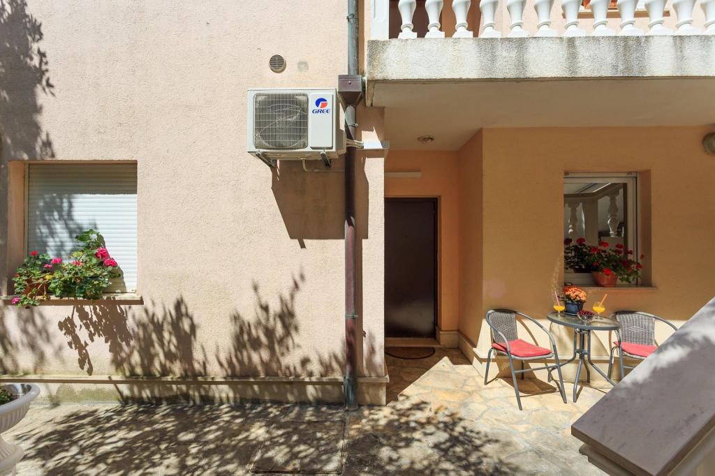 Mieszkanie znajduje się w pierwszym rzędzie do morza w nowym budynku. W apartamencie znajdują się dwie duże sypialnie z podwójnymi łóżkami, dwie toalety, kuchnia, jadalnia, salon i taras. Apartament znajduje się 200 m od pierwszej żwirowej plaży i 300 m od piaszczystej plaży. Odległość do pierwszej kawiarni i restauracji to mniej niż 100 m, kawiarnia Renato, bar tenisowy i Mythos, restauracja Velo Misto i Barkarola. Odległość do centrum miasta to około 20 minut pieszo. W odległości 100 m znajdują się korty tenisowe do wynajęcia.