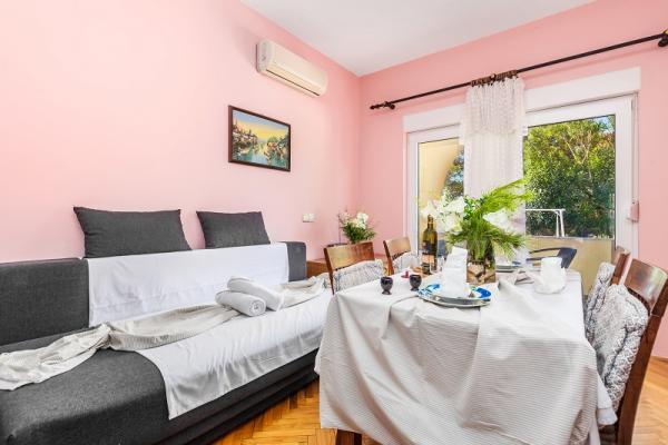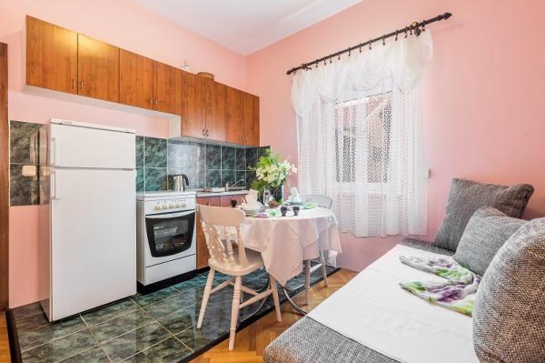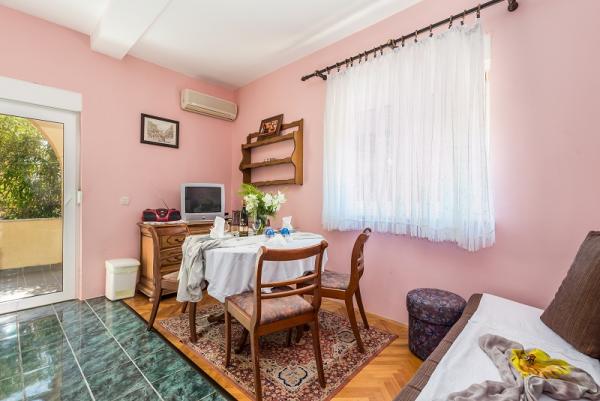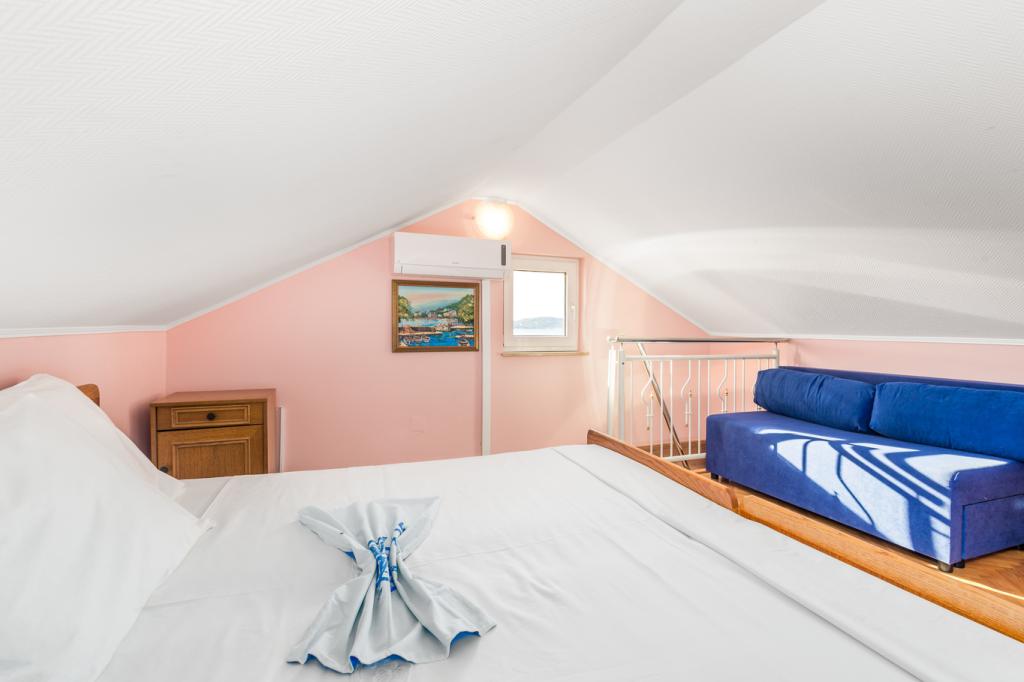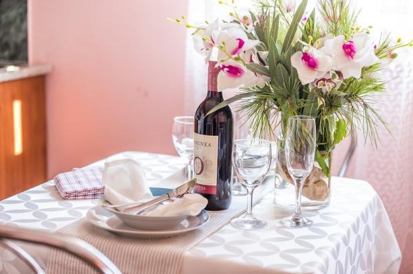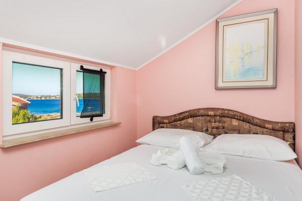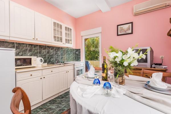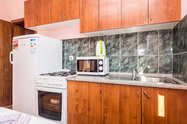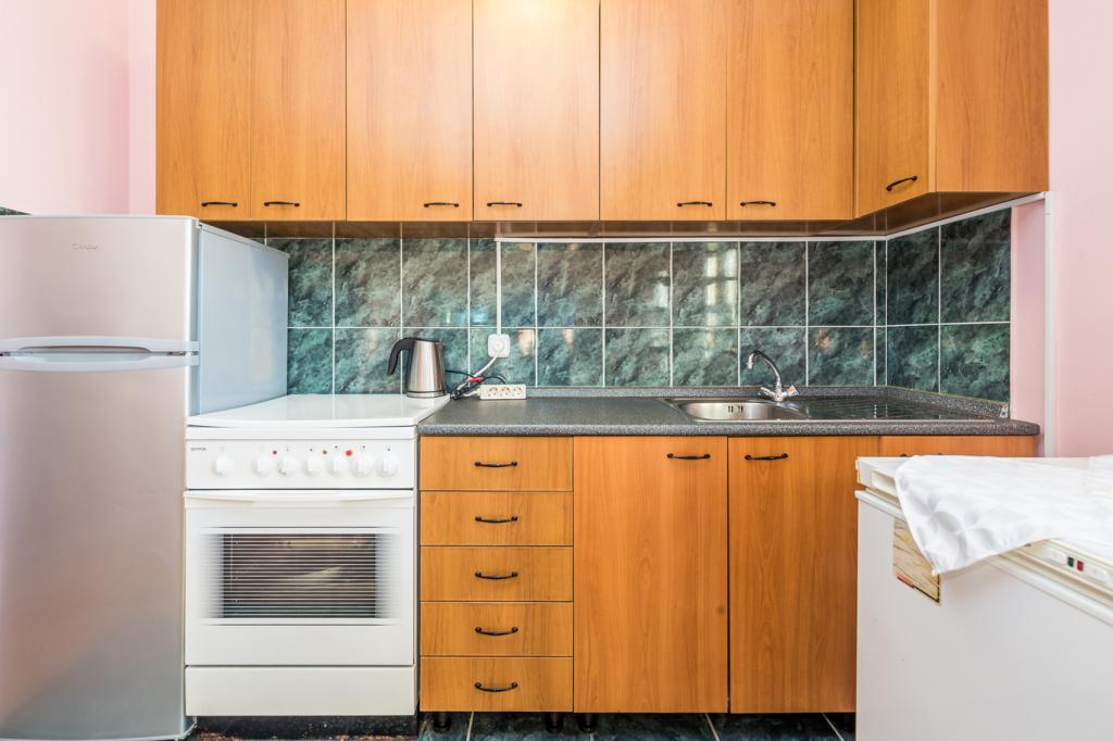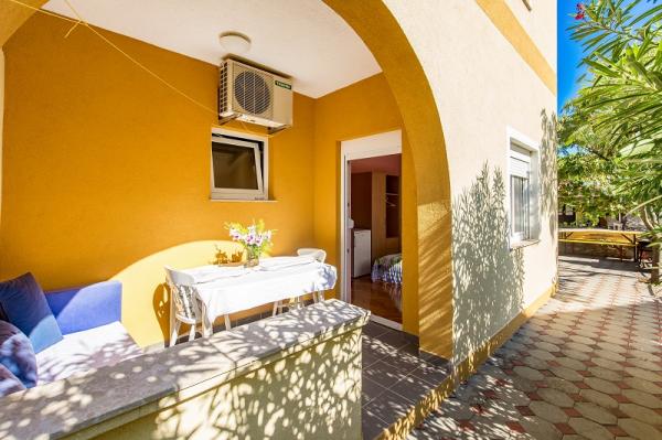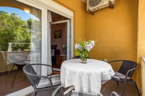 trzy gwiazdki, pierwszy rząd do morza (50 m do piaszczystej plaży), apartamenty dwu- i trzypokojowe, w pełni umeblowane (klimatyzacja, telewizor, internet WiFi). Każdy apartament posiada kuchnię, łazienkę i balkon z widokiem na morze. Istnieje również grill na świeżym powietrzu.