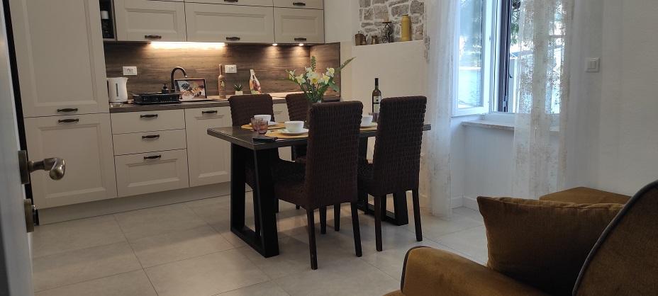 Wyspa Šolta, STOMORSKA - Poczuj ducha starego dalmatyńskiego miasta w apartamentach znajdujących się w prywatnym domu położonym pośrodku malowniczego nabrzeża (pierwszy rząd do morza). Z tarasu piękny widok na miejscowość, morze, zatokę. Kawiarnie, restauracje, sklepy, plaże... wszystko jest blisko apartamentu, zaledwie kilka minut spacerem. Większy apartament posiada dwie sypialnie, dwie łazienki oraz salon z kuchnią i tarasem. Mniejszy apartament posiada kuchnię z salonem, oddzielną sypialnię z łazienką. Przed apartamentem znajduje się część wypoczynkowa. Apartamenty zostały zaprojektowane i wyposażone tak, aby spełnić wszystkie Twoje potrzeby, po prostu przyjdź i ciesz się nimi. Dom posiada zielony dziedziniec urządzony w stylu dalmatyńskim, kominek i prysznic na świeżym powietrzu. Do dyspozycji gości są gospodarze, a także miejsca parkingowe