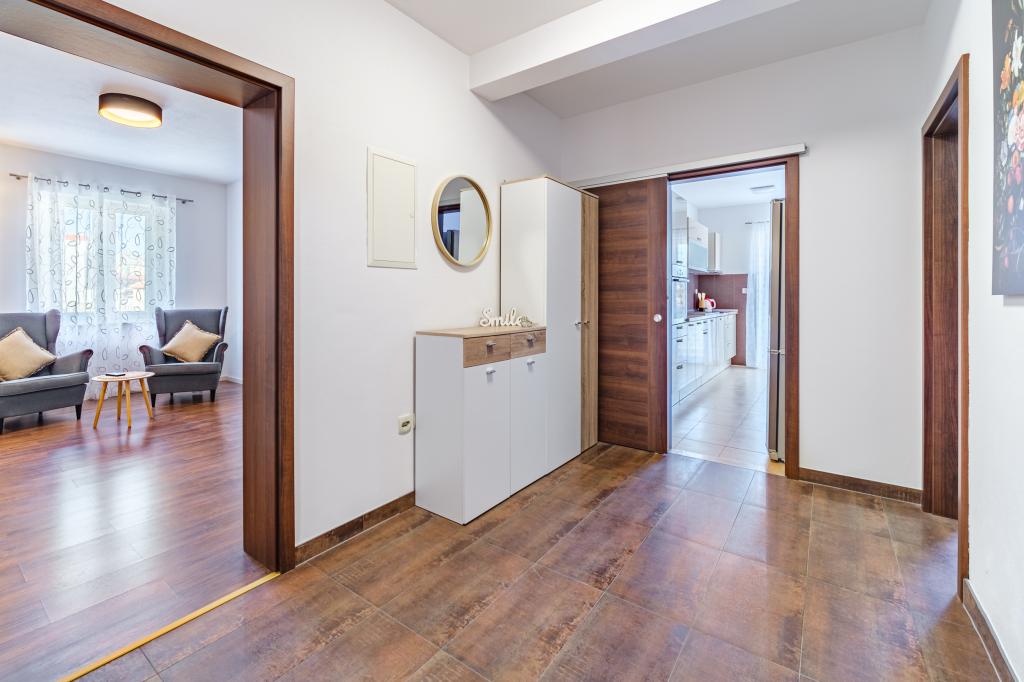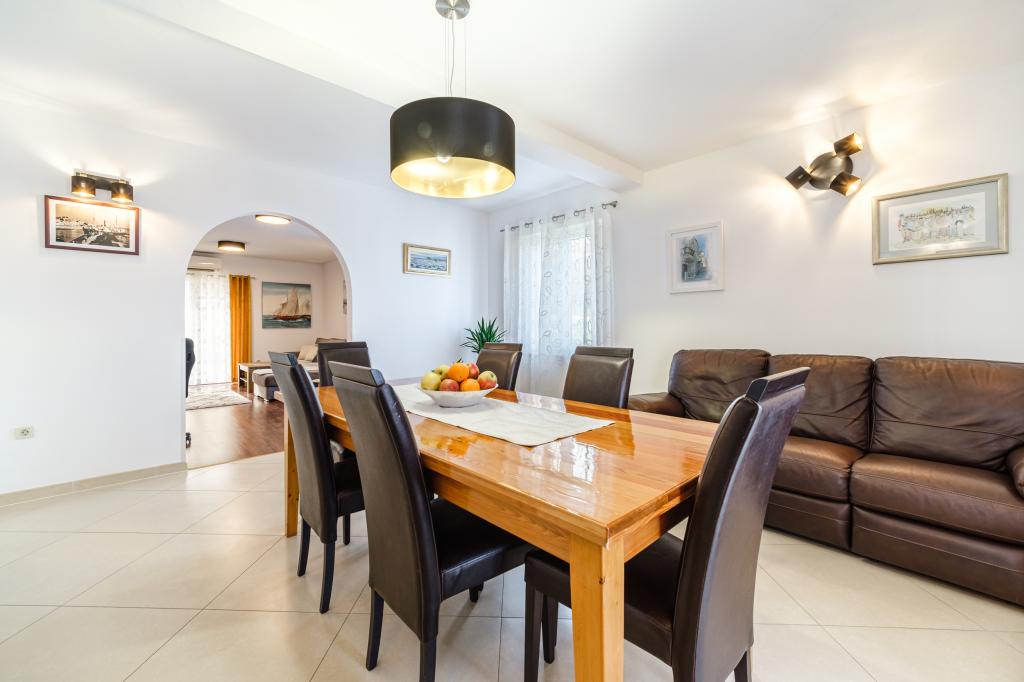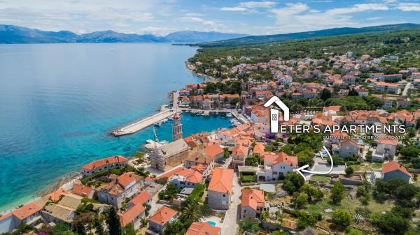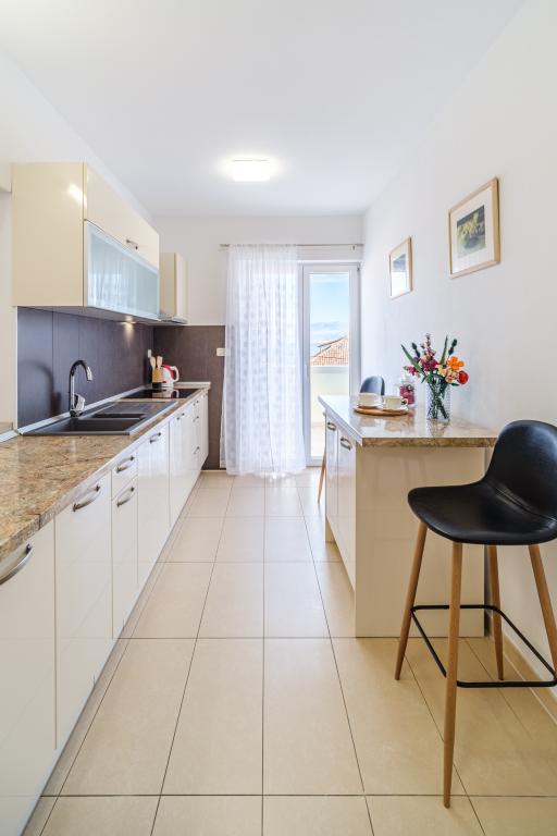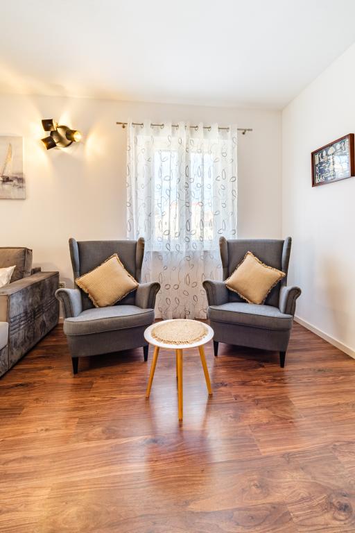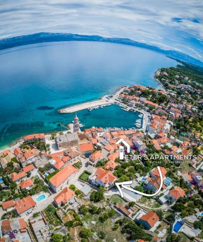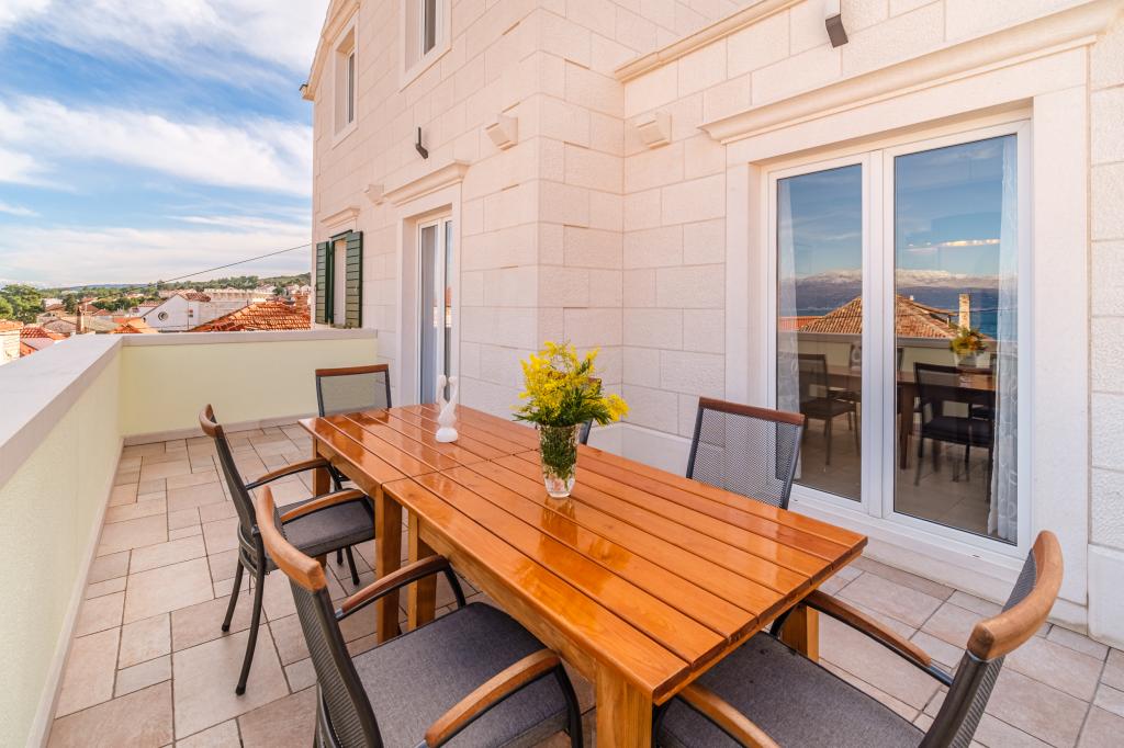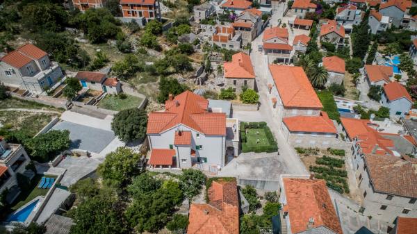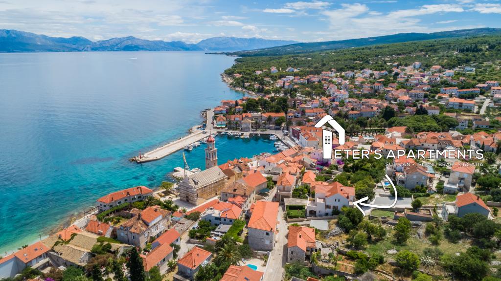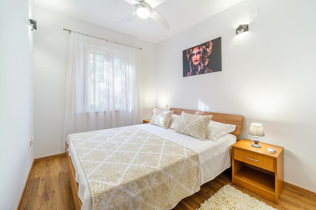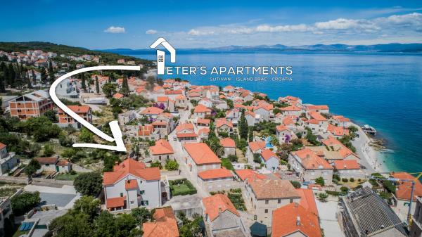 W pełni nowocześnie wyposażony apartament w luksusowym domu w spokojnej dzielnicy Sutivan, położony w samym centrum miasta, w drugim rzędzie od morza. Obiekt jest położony 2 minuty spacerem od pierwszej plaży, w samym centrum miasta. Obiekt oferuje usługi noclegowe w jednym apartamencie. W apartamencie może nocować 6 osób, a w razie potrzeby na dostawce mogą nocować jeszcze dwie osoby. Do apartamentu przynależy miejsce parkingowe w garażu. Obiekt oferuje usługi grillowania, specjalnie wyposażoną jadalnię, bar i zlew. Apartament posiada dwa tarasy, z czego jeden o powierzchni 20 m2 z widokiem na morze, a drugi od strony południowej o powierzchni 8,5 m2. Obiekt oferuje pralnię. Apartament składa się z 3 sypialni, 2 łazienek i jednej dodatkowej toalety. Salon i jadalnia stanowią jedną przestrzeń o powierzchni 50 m2.