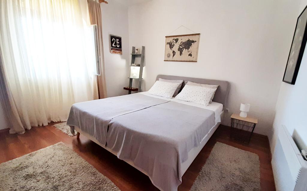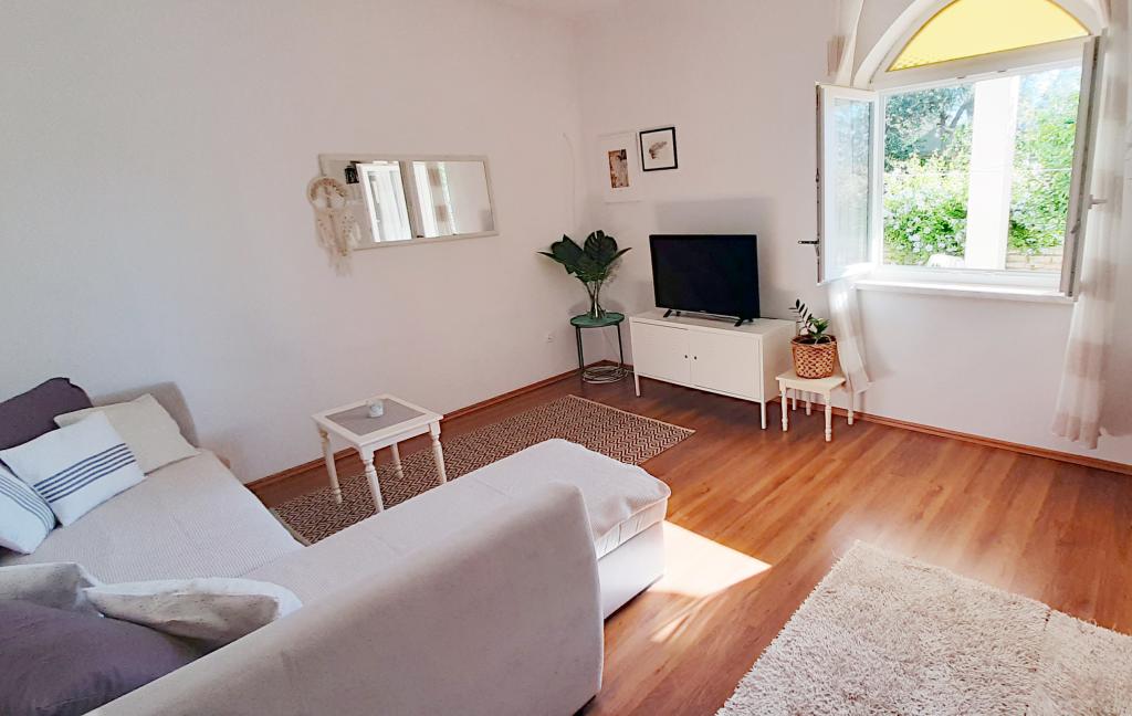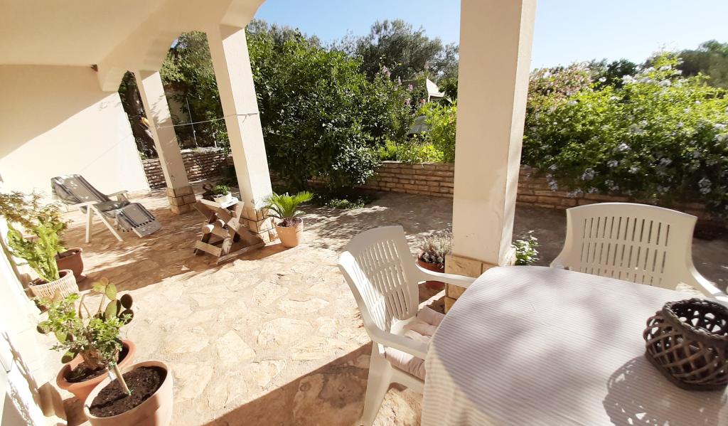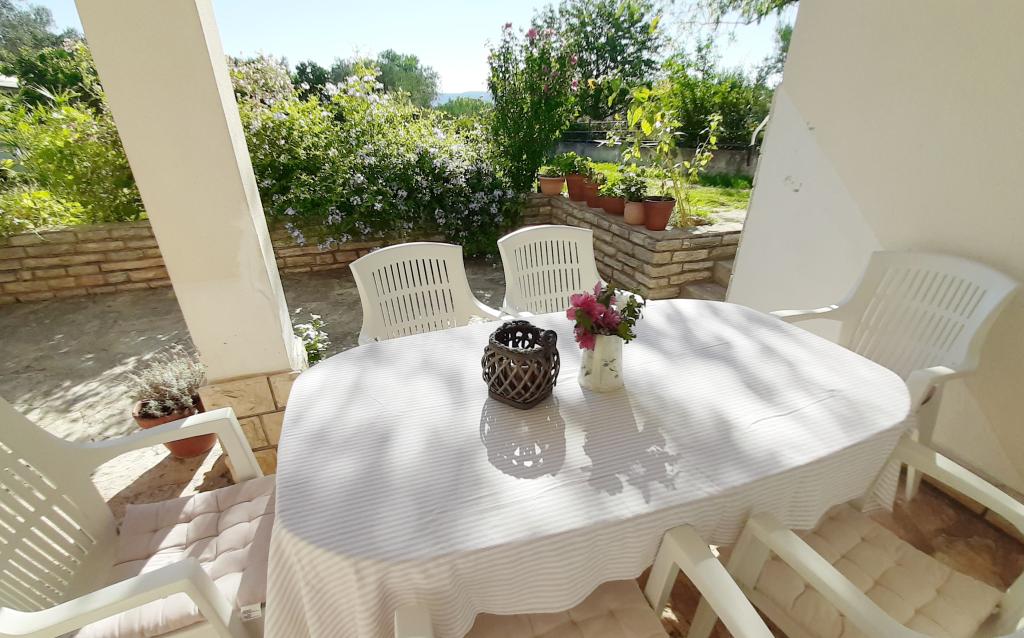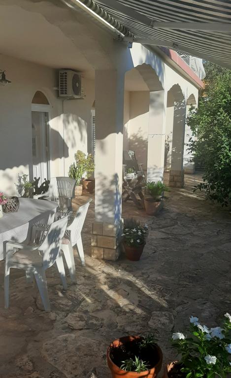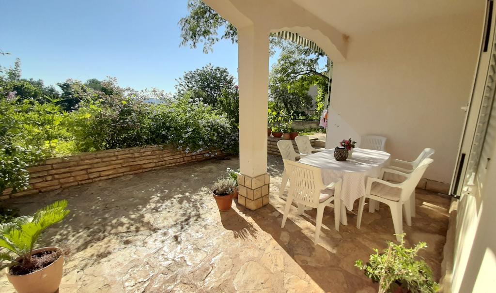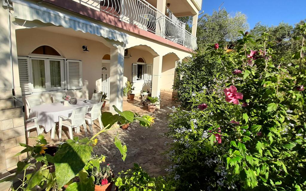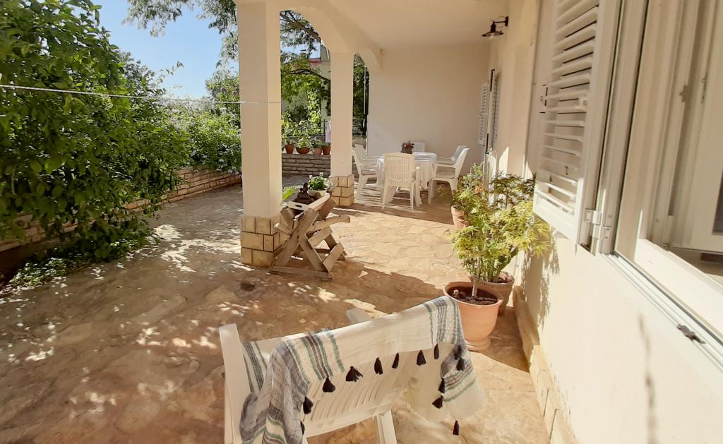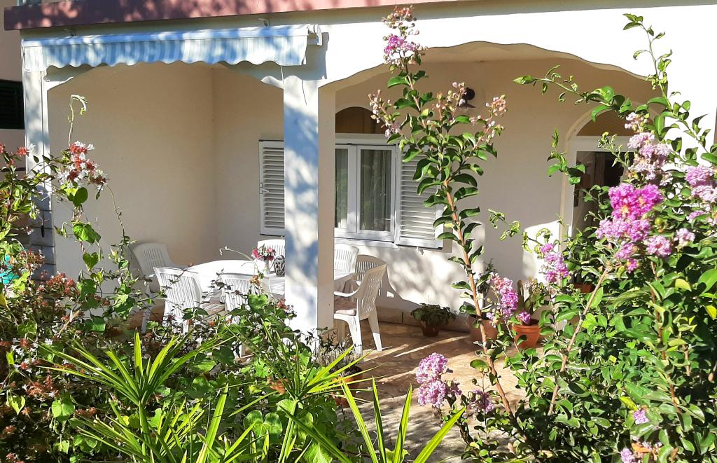 Apartament znajduje się na parterze rodzinnego domu, który jest pierwszym rzędem do morza, zaledwie 100m od plaży. Posiada 2 sypialnie z podwójnym łóżkiem, łazienkę, przestronny salon oraz dobrze wyposażoną kuchnię. Mieszkanie ma 100m2. Do dyspozycji Gości jest również duży i przyjemny taras z miejscami do siedzenia i prysznicem na świeżym powietrzu z pięknym widokiem na ogród i gaj oliwny. Apartament jest klimatyzowany, posiada strzeżone miejsce parkingowe na 1-2 samochody, wi-fi oraz posiada możliwość korzystania z grilla. Opłata klimatyczna i klimatyzacja są wliczone w cenę.