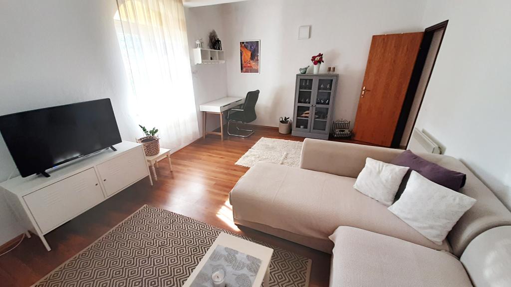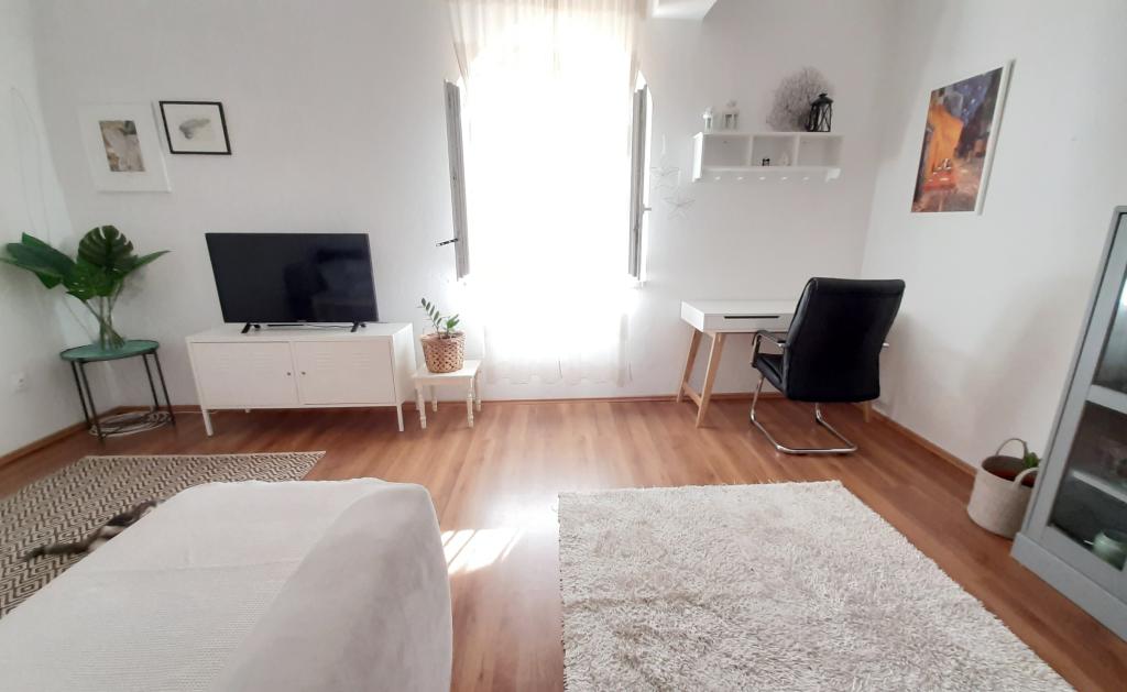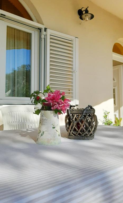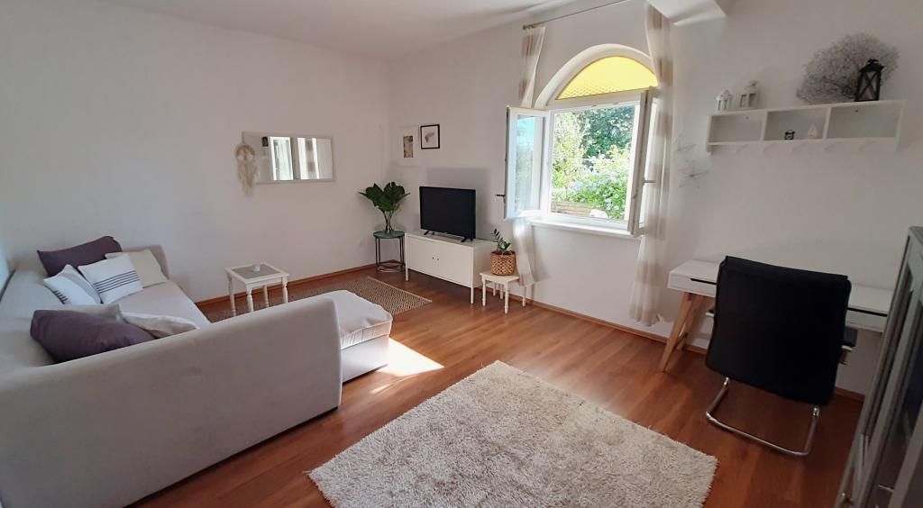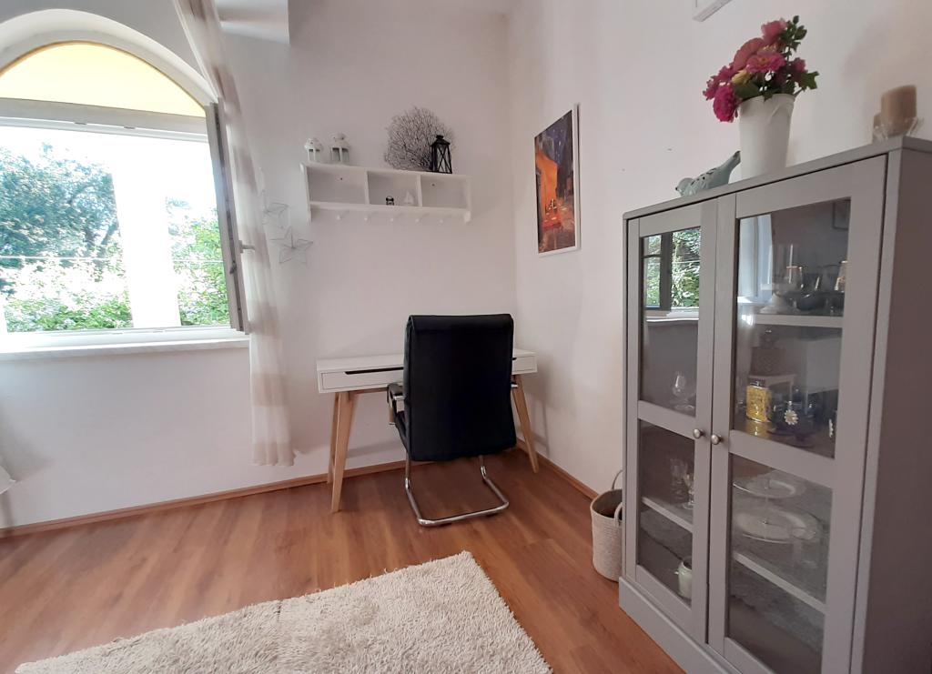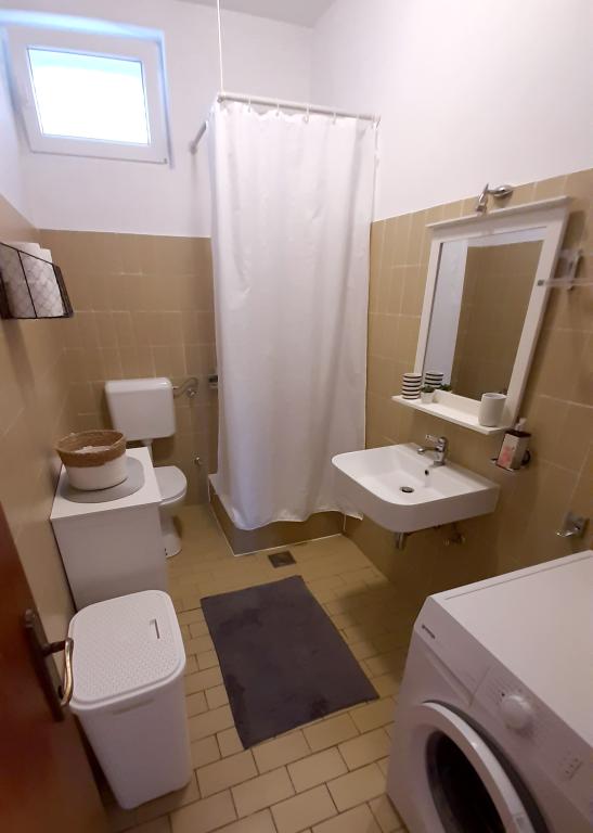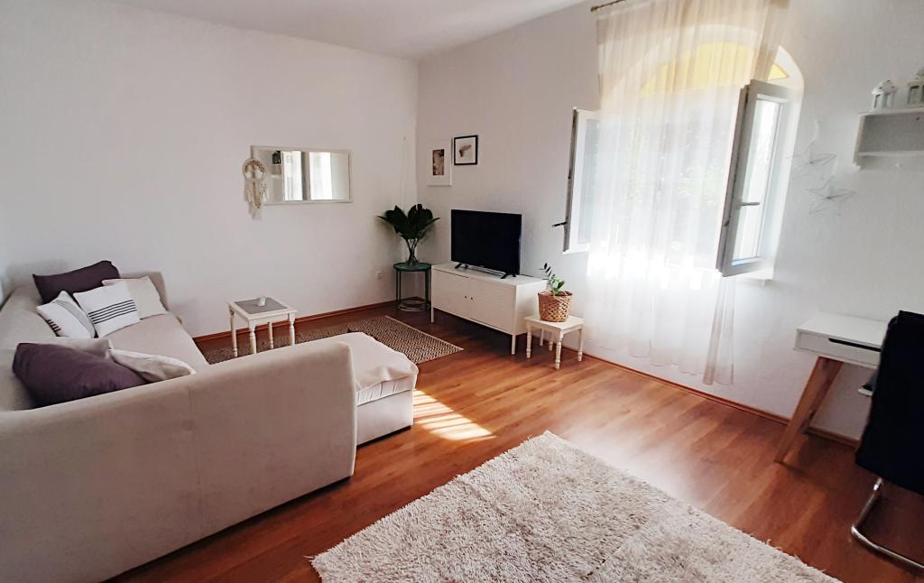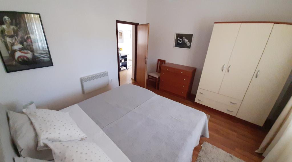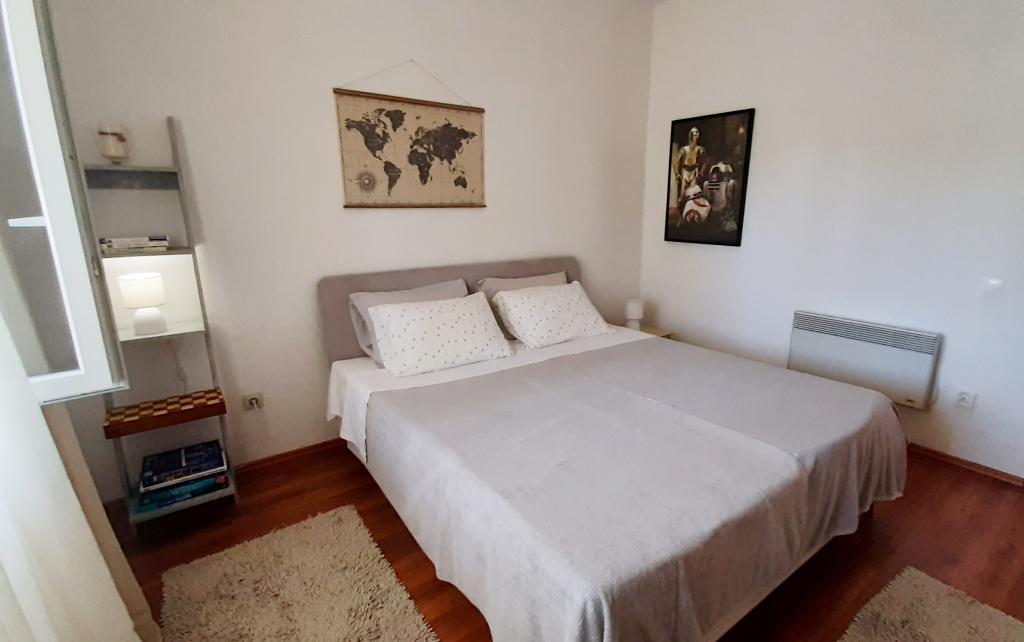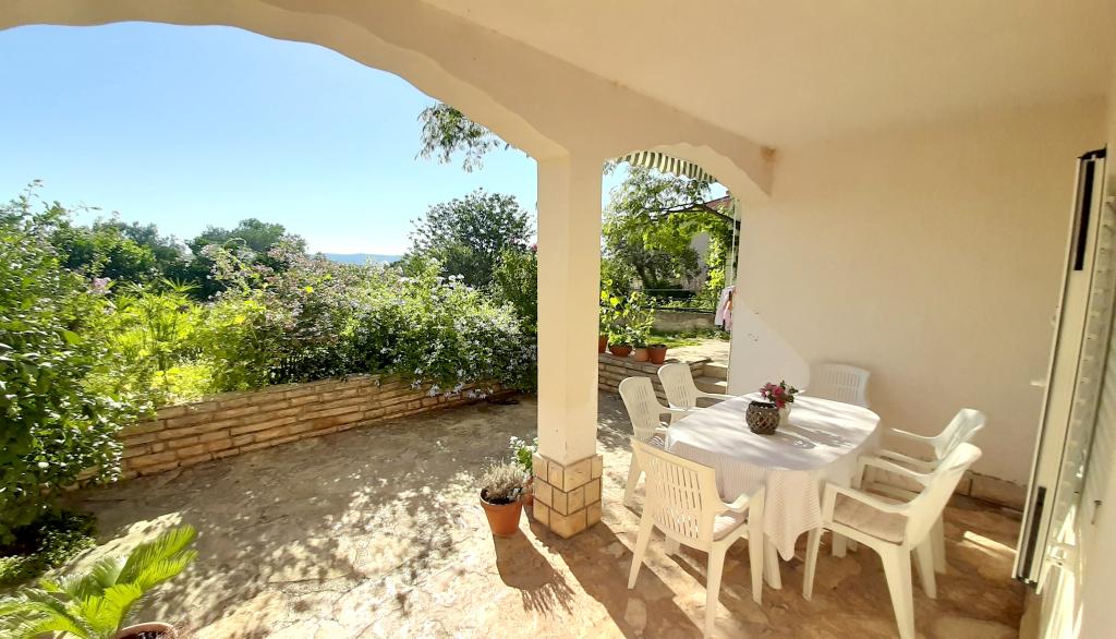 Apartament znajduje się na parterze rodzinnego domu, który jest pierwszym rzędem do morza, zaledwie 100m od plaży. Posiada 2 sypialnie z podwójnym łóżkiem, łazienkę, przestronny salon oraz dobrze wyposażoną kuchnię. Mieszkanie ma 100m2. Do dyspozycji Gości jest również duży i przyjemny taras z miejscami do siedzenia i prysznicem na świeżym powietrzu z pięknym widokiem na ogród i gaj oliwny. Apartament jest klimatyzowany, posiada strzeżone miejsce parkingowe na 1-2 samochody, wi-fi oraz posiada możliwość korzystania z grilla. Opłata klimatyczna i klimatyzacja są wliczone w cenę.