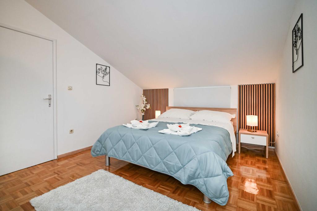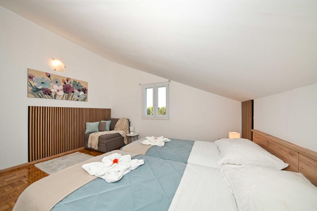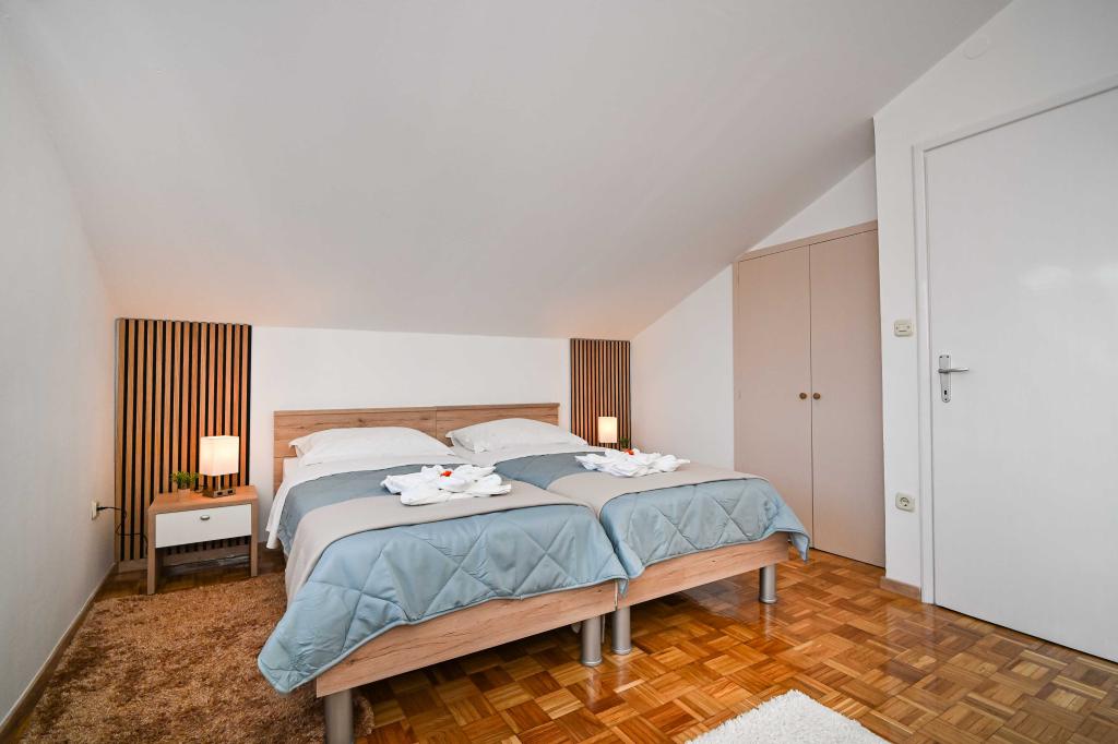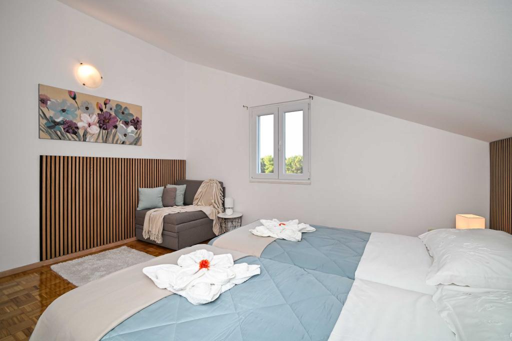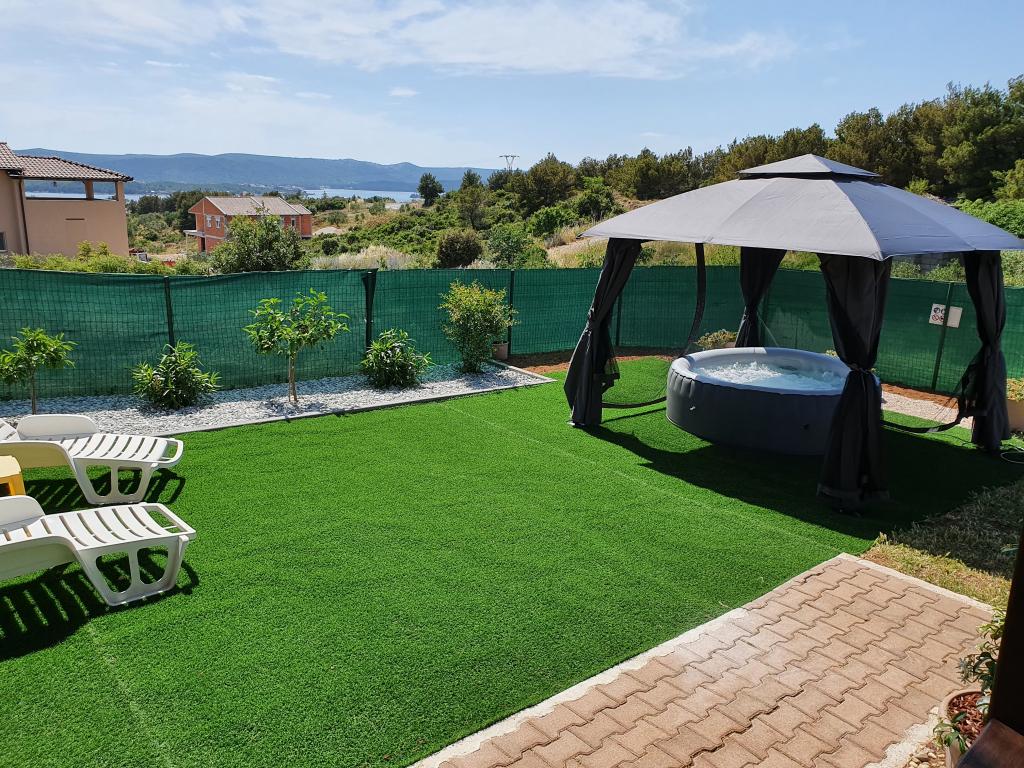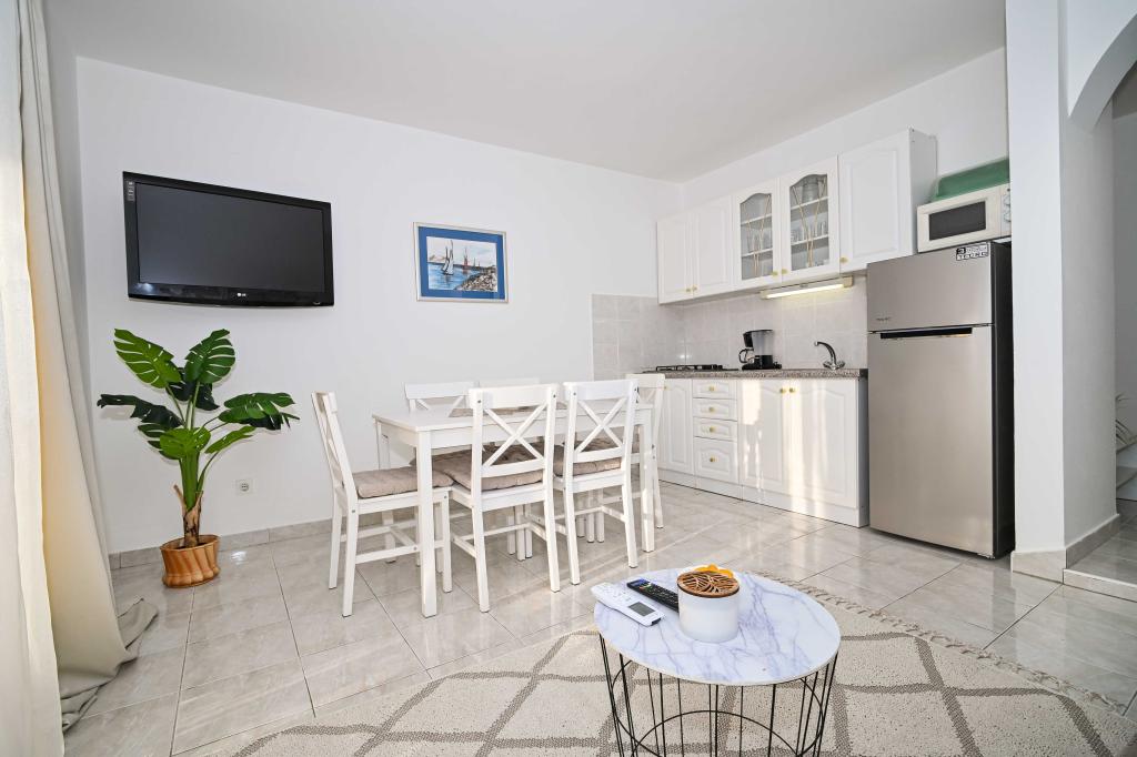 Daj nam szansę i swoje niezapomniane wakacje będzie doświadczenie tylko przez nas. W naszych apartamentach znakomicie krajobrazowy w pobliżu sosnowego lasu i morza twój urlop będzie kompletna. Promenada i pobliski widokowa, ścieżki rowerowe, w pobliżu parku przyrody Jezioro Vrana i Parków Narodowych Kornati i Krka wodospady, starożytne miasta Zadar i Sibenik, z pewnością spełni oczekiwania nawet najbardziej wymagających gości. Nasz kompleks jest wielkości 2500m2, w otoczeniu drzew oliwnych i lasów sosnowych. Z dziedzińca znajduje się ładny widok na morze Pasman Channel. Na terenie obiektu znajduje się: • dom rodzinny, w którym znajdują się dwa oddzielne mieszkania (dla 4 i 6 osób). • Apartamenty wyposażone są w klimatyzację, TV, bezprzewodowy dostęp do Internetu oraz tarasem z widokiem na morze i basen. • Basen: Obok domu znajduje się basen z pięknym otoczeniu i leżakami • Basen znajduje, są dwie łazienki z prysznicem i dwie łazienki, wydzielone miejsce do prania, który jest Opremjen z pralka i
