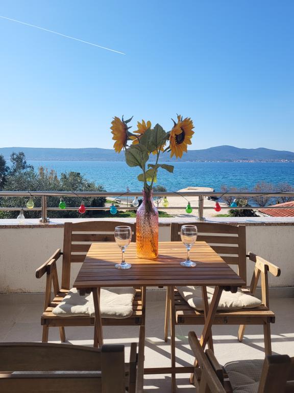 Apartament znajduje się w domu rodzinnym tuż nad morzem. Znajdziesz u nas wszystko, czego potrzebujesz na rodzinne wakacje, a także piękny widok z tarasu, z którego możesz podziwiać jeden z najpiękniejszych zachodów słońca na świecie. Dwie sypialnie oraz sofa z łóżkiem typu queen-size, które po zastosowaniu nakładki na materac może zamienić się w wygodne łóżko dla jednej osoby dorosłej. Łazienka wyposażona jest w prysznic i dodatkową, oddzielną toaletę. Przed domem znajduje się piękna kamienista plaża z drzewami, przy której znajdują się leżaki dla naszych gości. Posiadamy rodzinne pole kempingowe w domu z toaletami i prysznicami, z których możesz korzystać podczas pobytu na plaży. 5 minut spacerem od domu, wzdłuż wybrzeża, znajduje się pizzeria i bar na plaży, gdzie można napić się kawy lub koktajlu. Obiekt położony jest w okolicy, gdzie znajdują się głównie prywatne kempingi rodzinne, dzięki czemu jest tu dość cicho i wcale nie ma tłoku. Nie jesteśmy nowicjuszami w tej branży, więc jeśli interesują Cię opinie o naszym obiekcie, znajdziesz je w zakładce „rezerwacja”. Istnieje również możliwość zwodowania łodzi o długości do 6 metrów i zacumowania jej do boi.