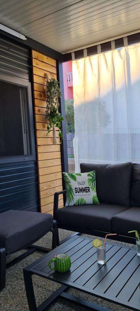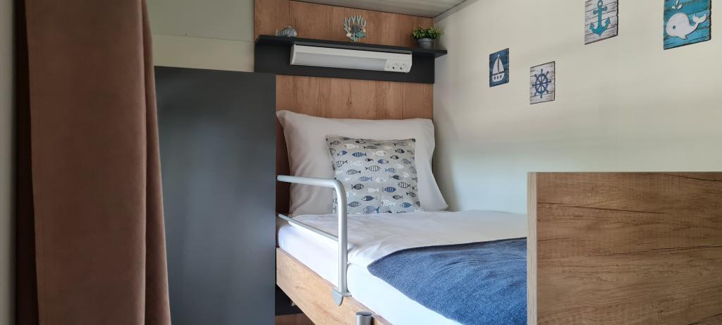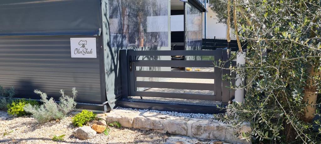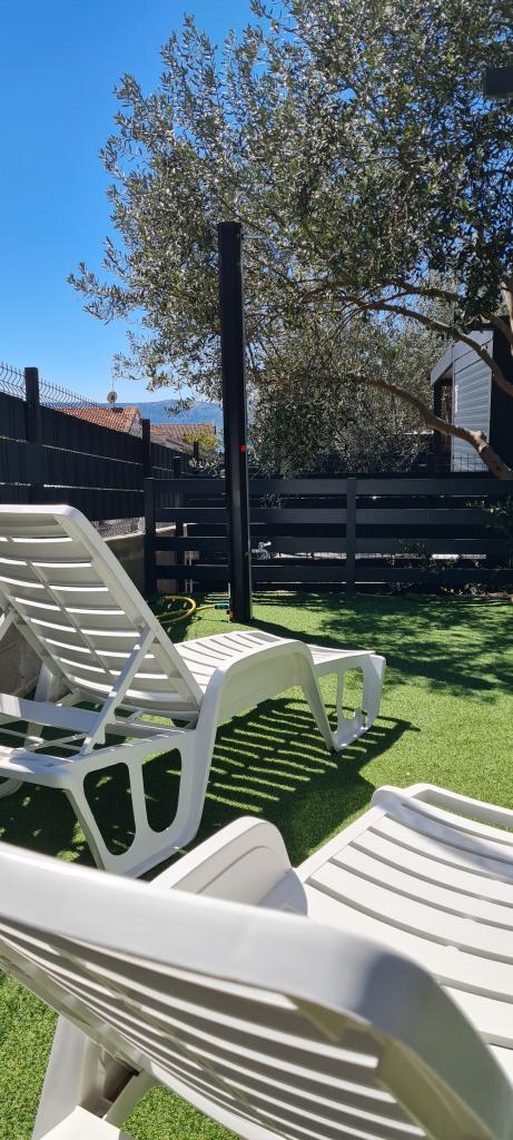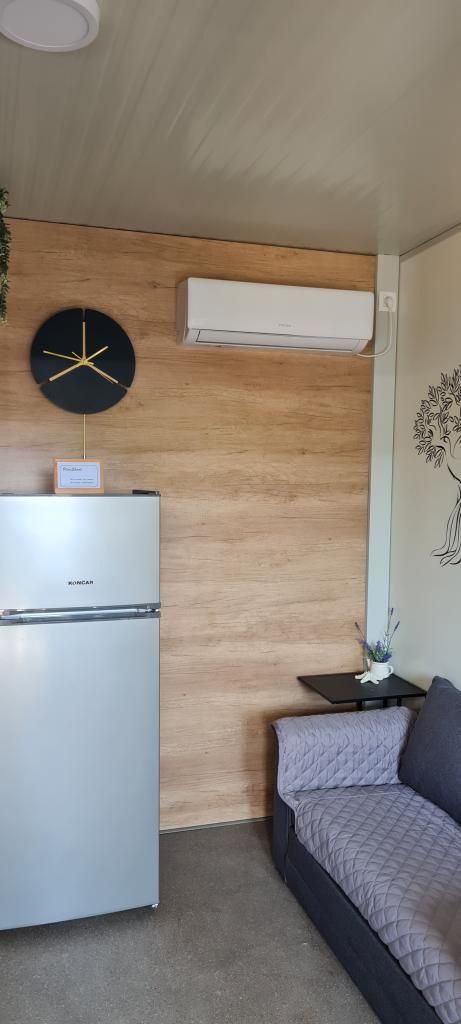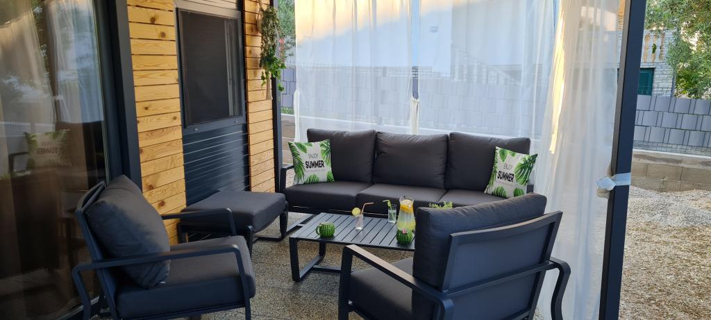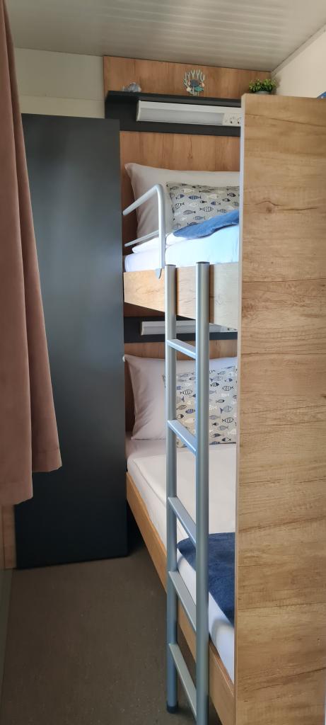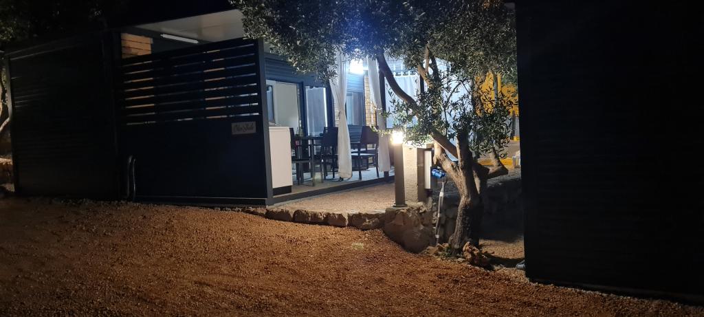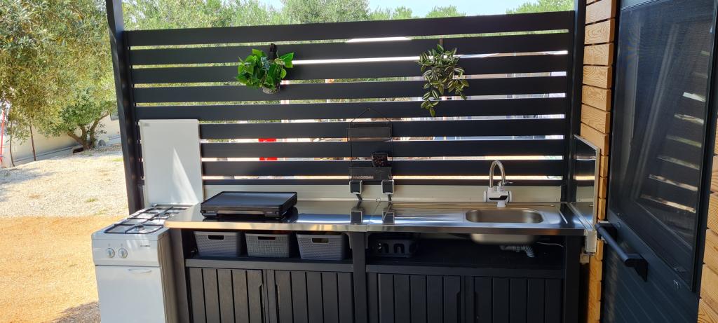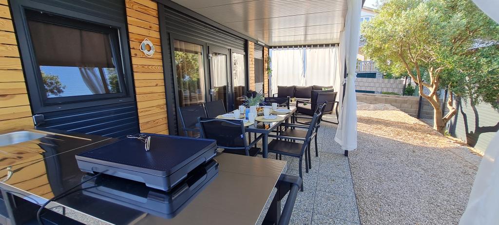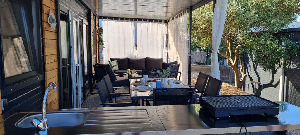 Domek mobilny 24 m2 + taras 40 m2 (zadaszony 24 m2) + prywatne miejsce do opalania w małym, cichym obozie. Do 5 osób. Dwie sypialnie (duże łóżko podwójne i łóżko piętrowe) + dodatkowe łóżko, kabina prysznicowa, toaleta, suszarka do włosów, papier toaletowy, pościel, przybory kuchenne, lodówka, czajnik, kuchenka mikrofalowa, mini piekarnik elektryczny, grill elektryczny, jadalnia na świeżym powietrzu, na zewnątrz kuchnia ze zlewem i kuchenką gazową, szafa, meble do siedzenia, leżaki i miejsce do opalania obok domu, telewizja satelitarna (850 programów), bezpłatne Wi-Fi, klimatyzacja. Uwaga: ręczniki i ściereczki nie są wliczone w cenę.