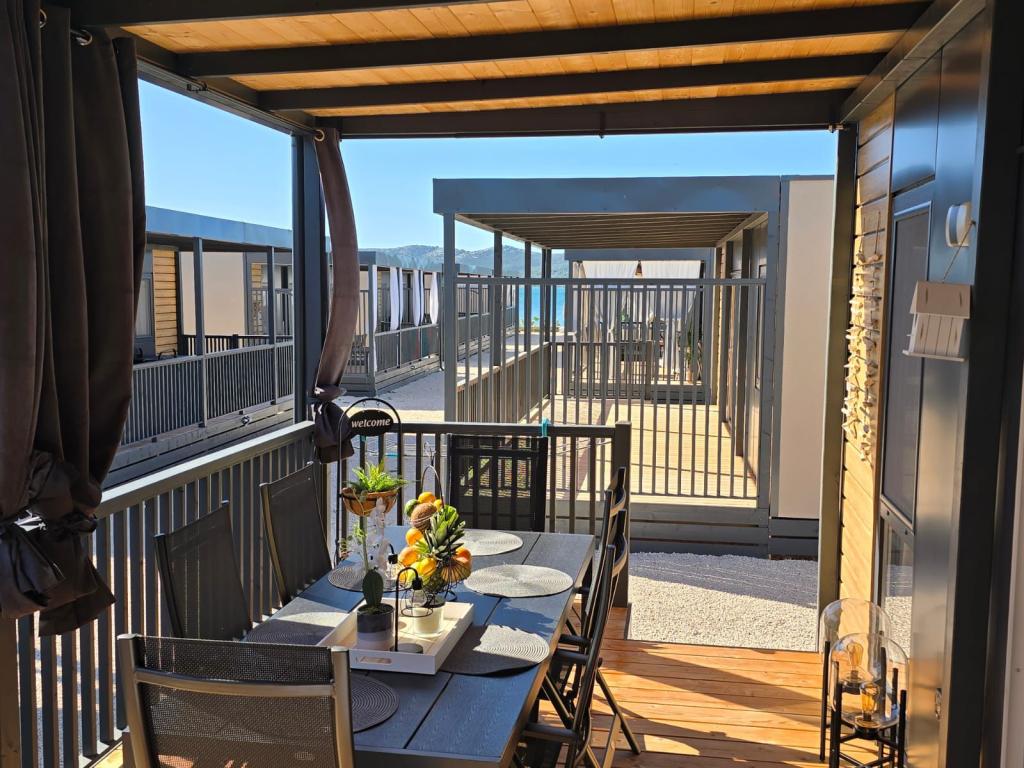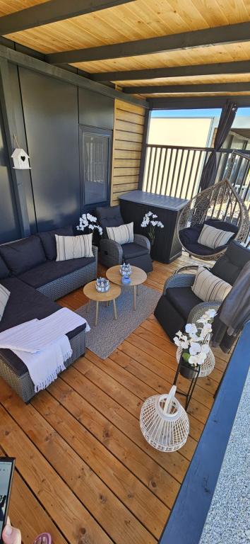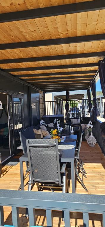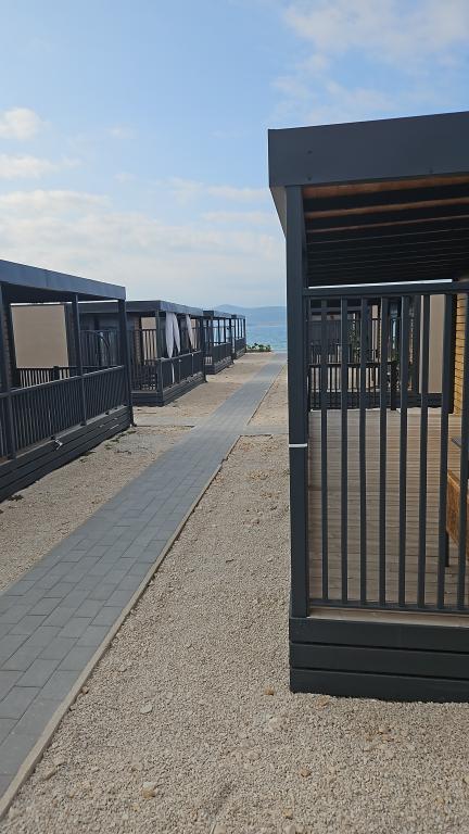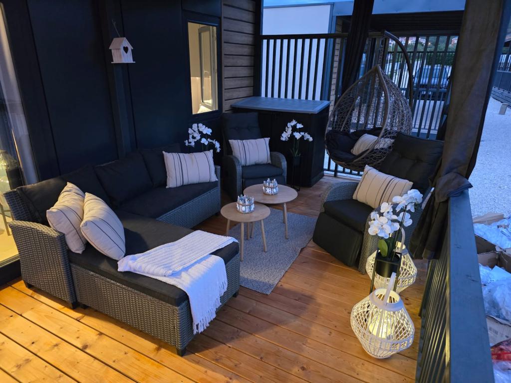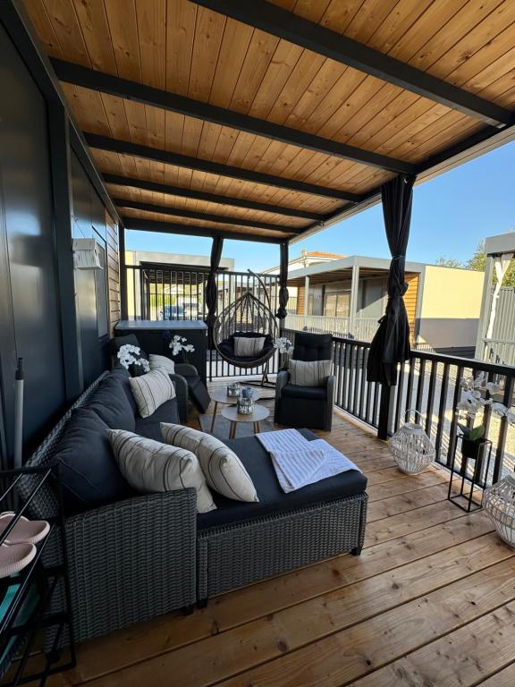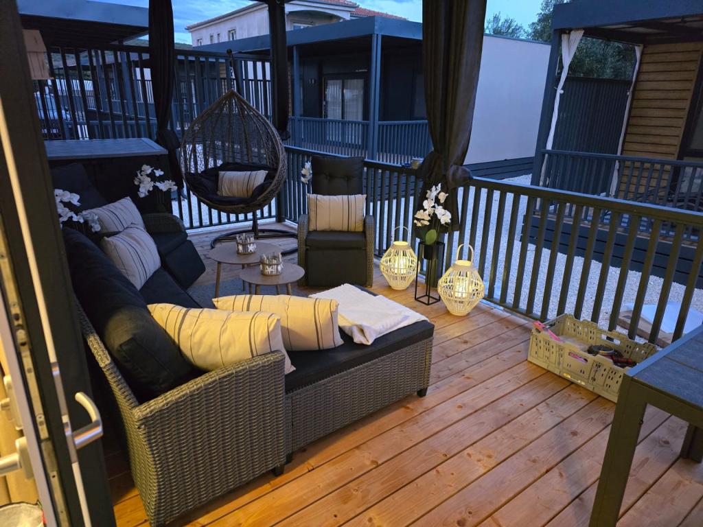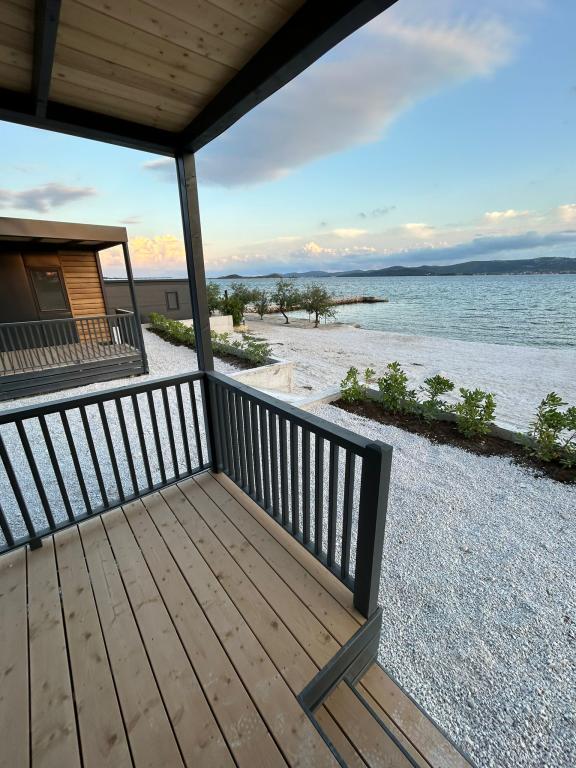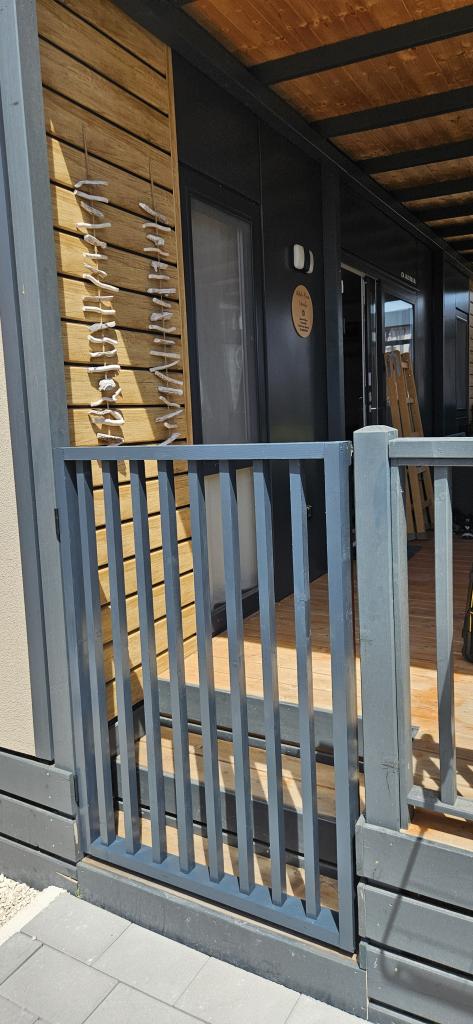 Domek mobilny położony na cichym kempingu, zaledwie 40 metrów od plaży, duży taras z grillem gazowym i wentylatorami sufitowymi, a także dodatkowe udogodnienia wypoczynkowe, huśtawka i fotele. Dom wyposażony jest we wszystkie dodatkowe sprzęty i naczynia, których potrzebujesz, aby móc cieszyć się wakacjami jak w domu. Na terenie obozu obowiązuje zakaz wjazdu pojazdów, tak aby dzieci mogły się beztrosko bawić, podczas gdy rodzice odpoczywają.