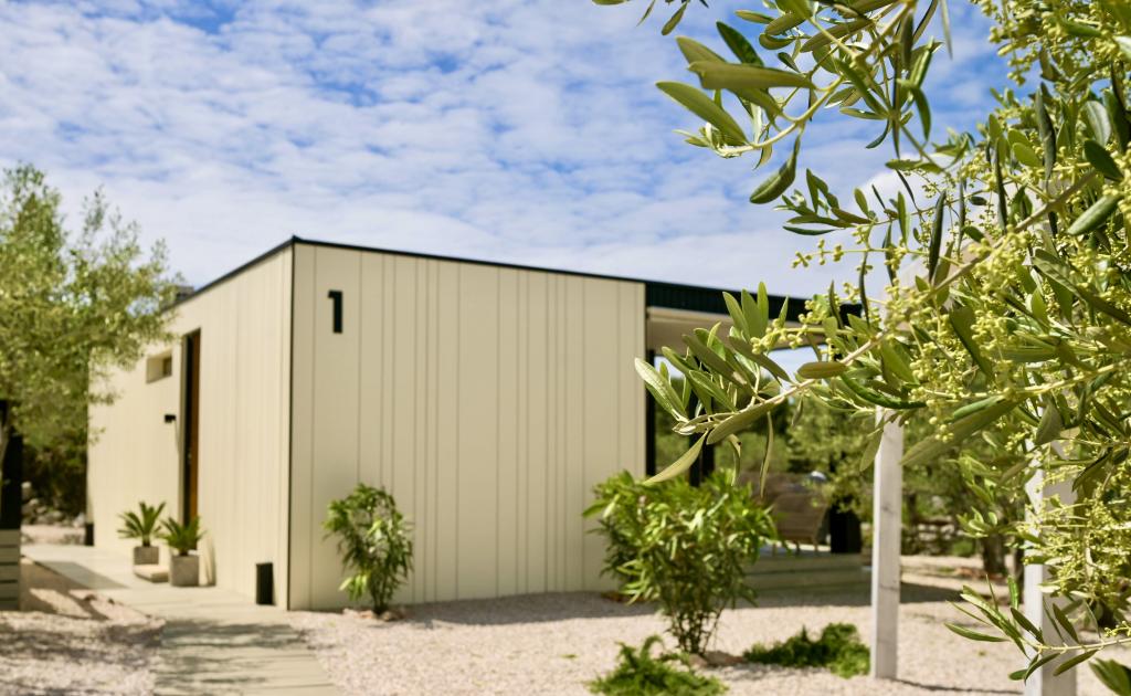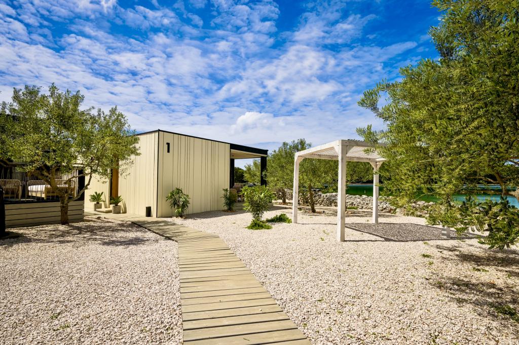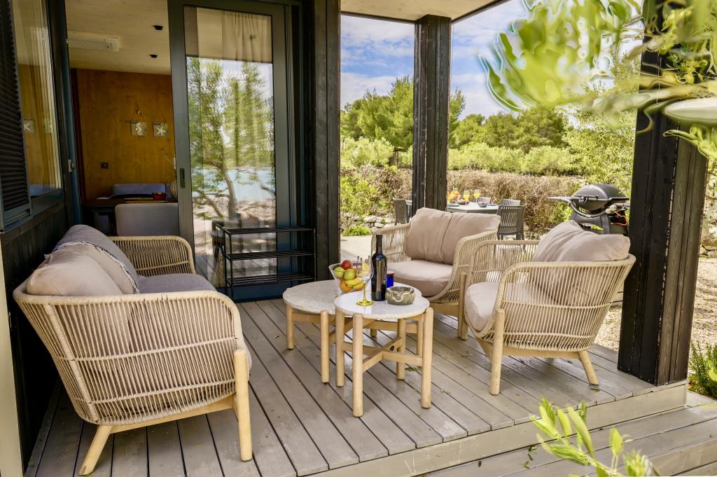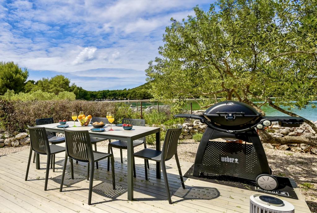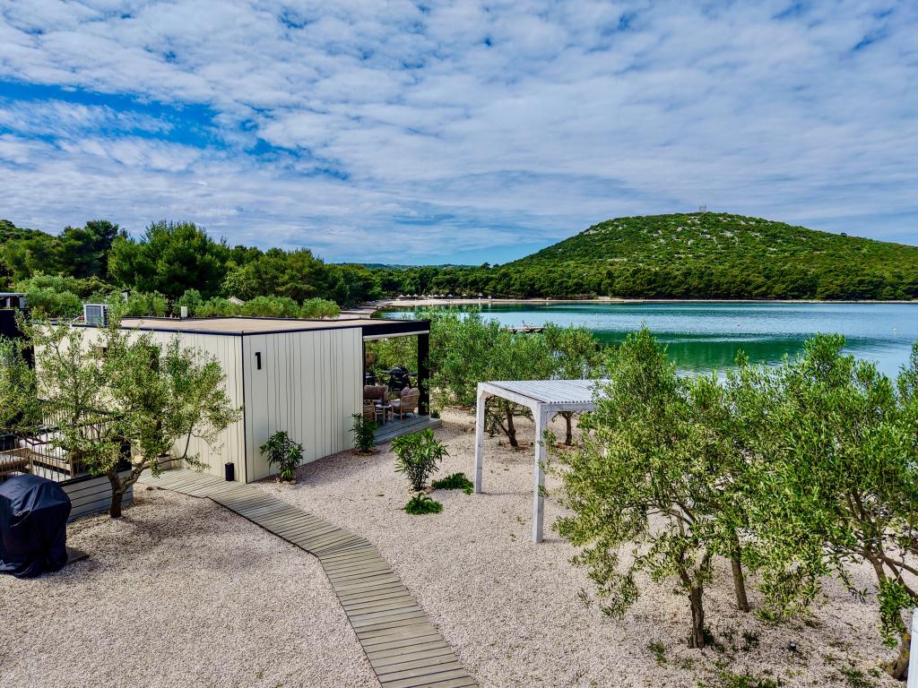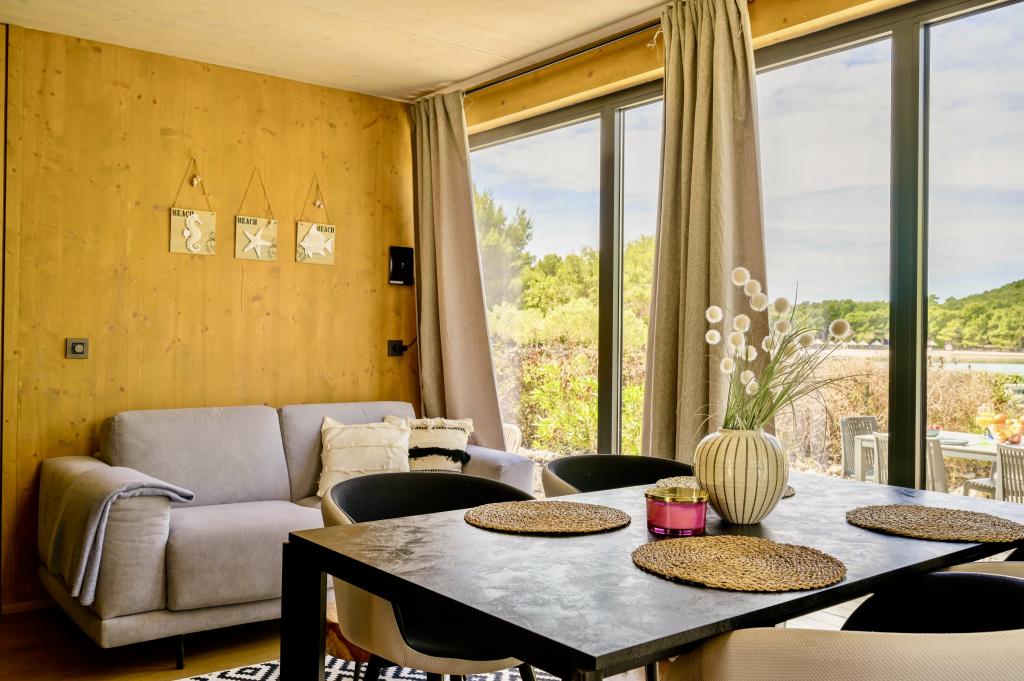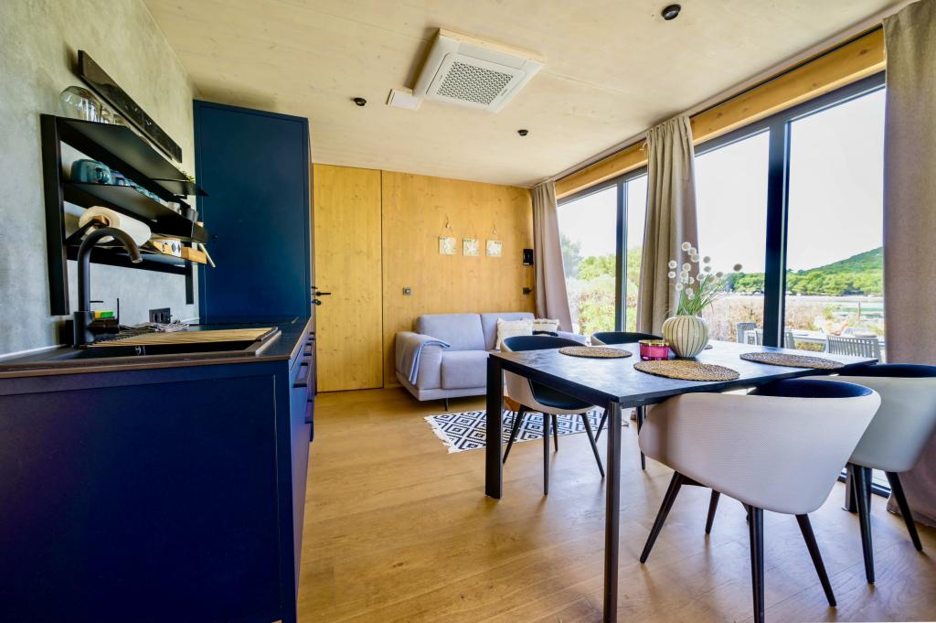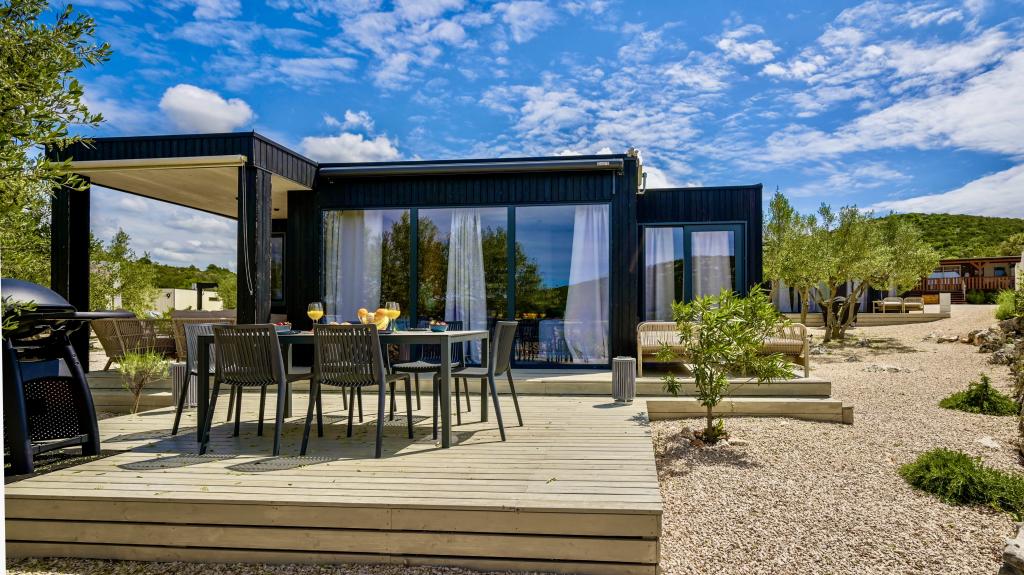 Dom mobilny znajduje się zaledwie kilka kroków od morza. Nowoczesne wnętrze apartamentu nawiązuje do typowej Dalmacji. Wokół znajdują się białe kamyki i zielone drzewa oliwne, a przed nami rozciąga się bezkresny błękit. Morze, słońce i wiatr tworzą nieopisaną grę, która zachwyca wszystkie zmysły. Niezależnie od tego, czy śpisz w jednej z dwóch sypialni, możesz cieszyć się błękitem morza i blaskiem porannego słońca. A z w pełni wyposażonej kuchni ze wszystkim, czego potrzebujesz (w tym zmywarką i zamrażarką) oraz przestronnego stołu jadalnego roztacza się niesamowity widok na taras i wszystkie uroki, jakie oferują słońce i morze. Niezależnie od tego, czy przygotowujesz posiłek w kuchni, czy grillujesz na tarasie, masz gwarancję pełnego spokoju i prywatności. Celem każdych wakacji jest pozostawienie za sobą codzienności i rutyny, a właśnie to oferuje nasz ośrodek. Mimo że wokół Ciebie znajduje się 8 podobnych budynków, możesz cieszyć się całkowitą prywatnością i spokojem, ponieważ wszyscy będą Cię wspierać. Jedynym ograniczeniem jest niebo i morze.
