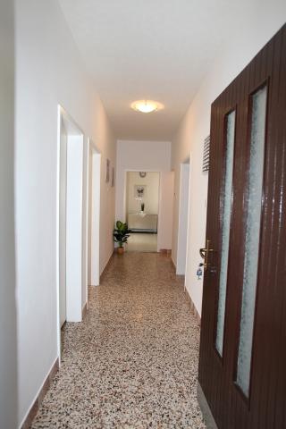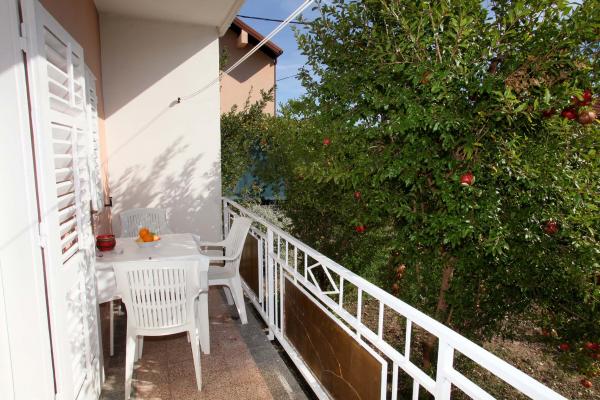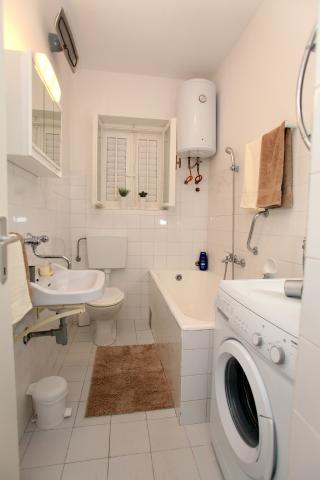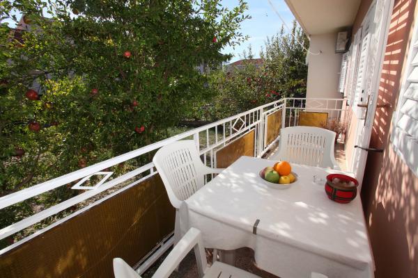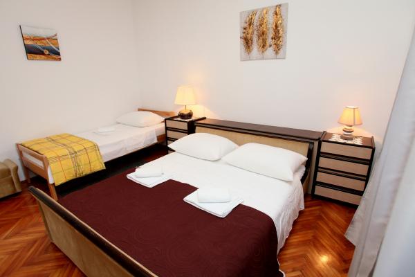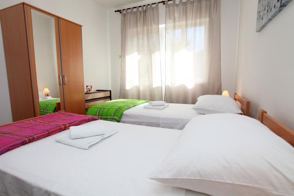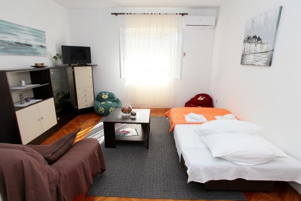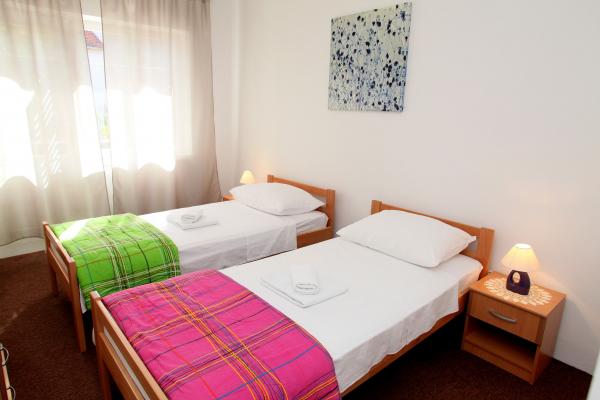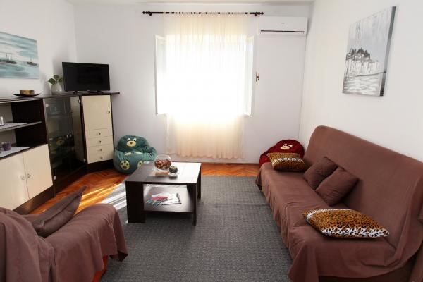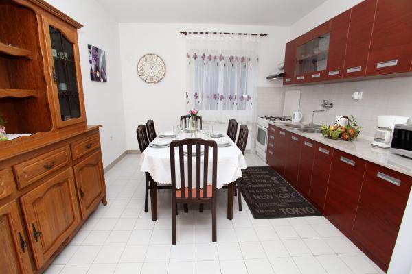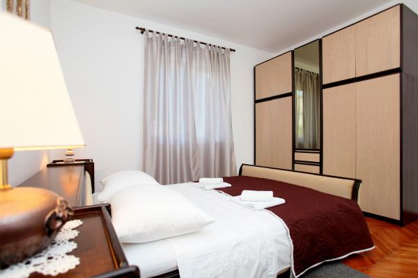 Mieszkanie 80 m2, wygodne i otoczony zielenią i znajduje się w domu rodzinnym w pobliżu starego miasta (około 10 minut pieszo). Mieszkanie jest w pełni wyposażone i składa się z dwóch sypialni (jedno potrójne i jedno podwójne), kuchnia, pokój dzienny, łazienka i mały WC. W salonie znajduje się dodatkowe łóżko dla dwóch osób (click-clack). Mieszkanie posiada balkon ze stołem i krzesłami oraz taras w przedniej części mieszkania ze stołem do przyjemnego pobytu w cieniu. Za budynkiem znajduje się niewielki grill i miejsce parkingowe na dwa samochody. Apartament jest klimatyzowany. Nowy żwirowa plaża publiczna znajduje się około 500 m od hotelu. Najbardziej znanym Trogir piaszczysta plaża znajduje się dwa przystanki autobusowe i 1 km od apartamentu. Trogir z nabrzeża, co 20 minut, w przystępnych cenach, pływania łodzią taksówką do najsłynniejszych plaż w okolicy Trogir.