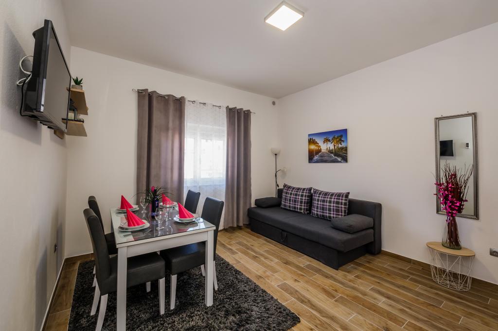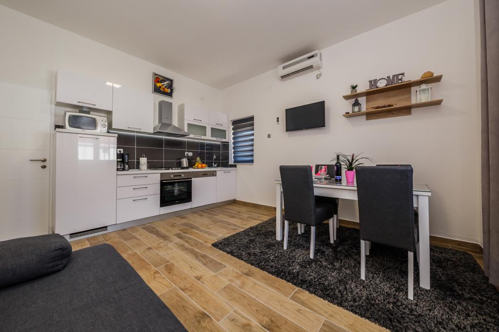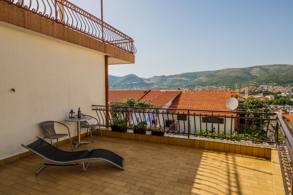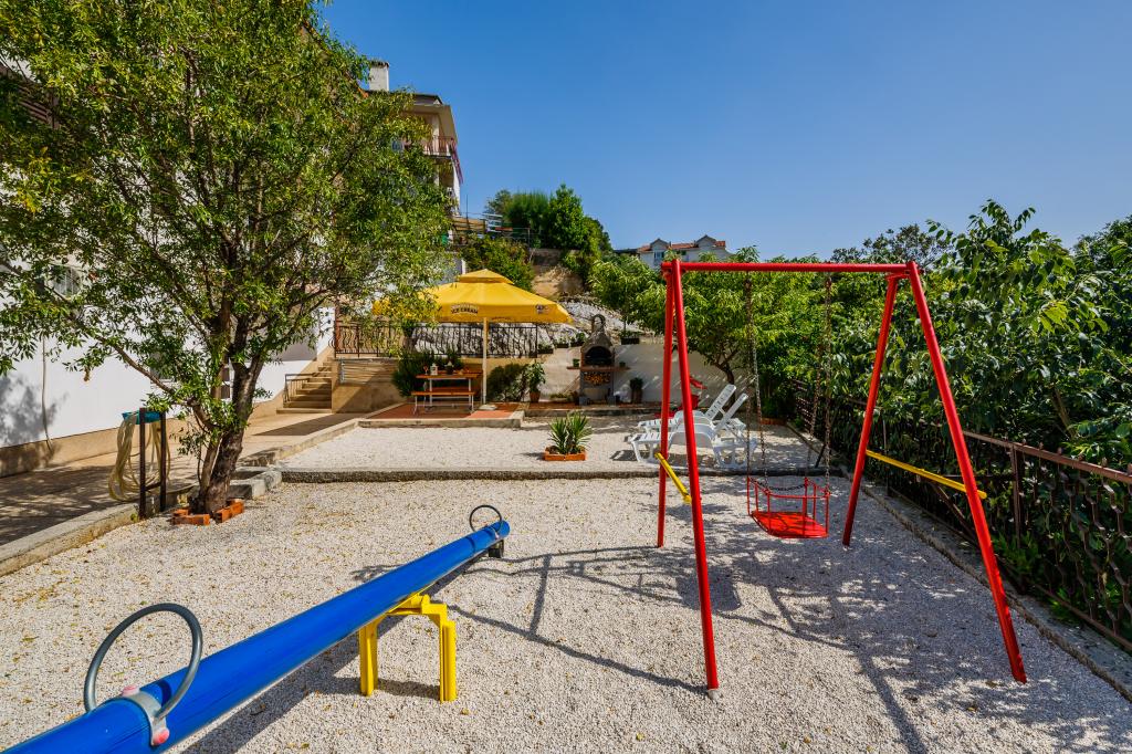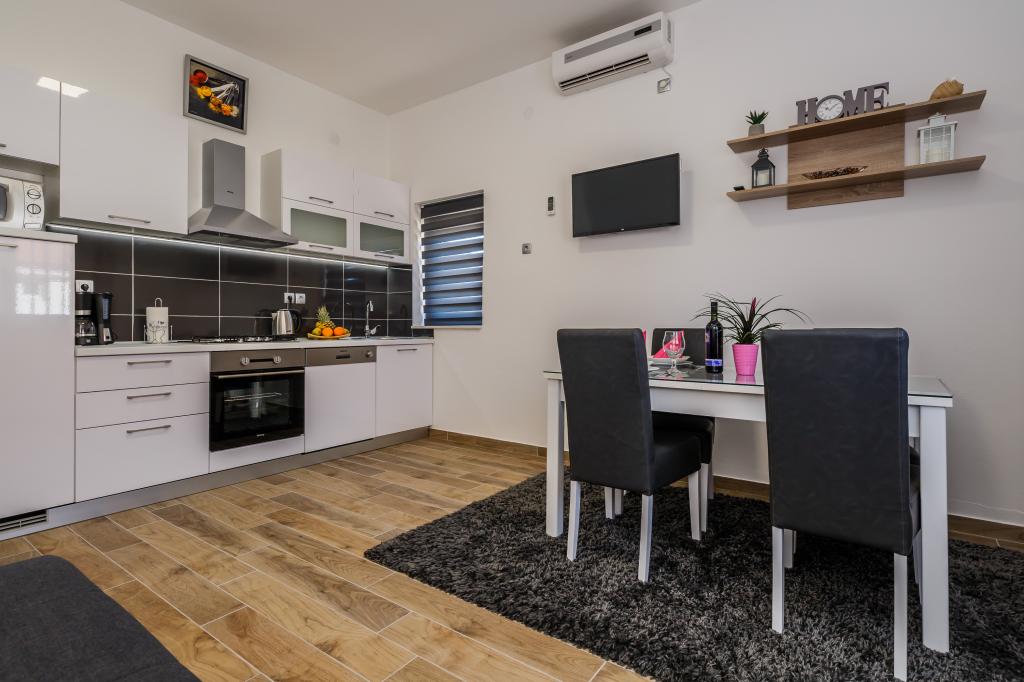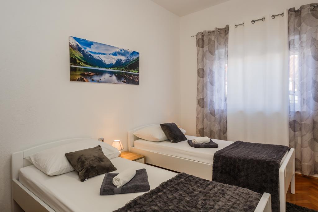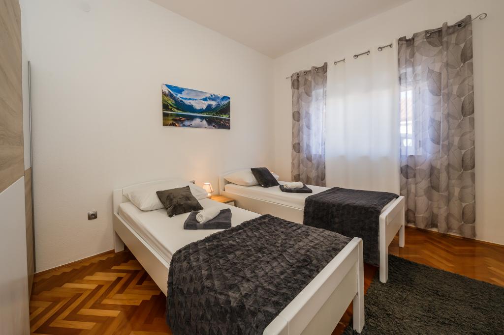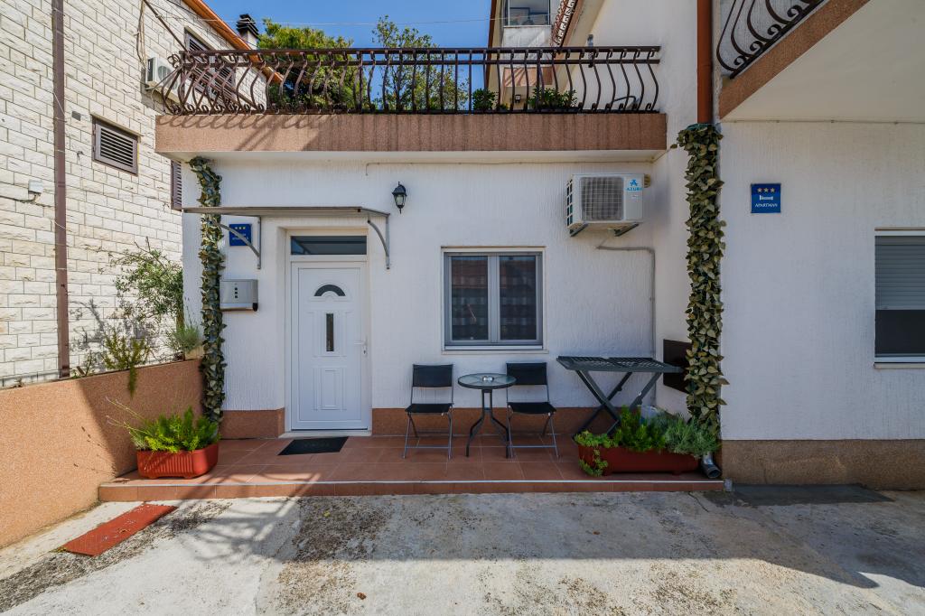 Mieszkanie położone jest na wyspie Ciovo, w odległości 300 metrów od centrum miasta i 600 metrów od plaży. Apartament jest w pełni wyposażony w dwie sypialnie, pokój dzienny, kuchnia, WC. Wielkości 75 metrów kwadratowych, obejmuje bezprzewodowy dostęp do Internetu, klimatyzację, dwa LCD, telewizję satelitarną z 500 kanałów. Apartament posiada taras z widokiem na ogród, plac zabaw (zjeżdżalnia, huśtawka, huśtawka), grill i Trogir. Bezpłatny parking znajduje się w pobliżu mieszkania.